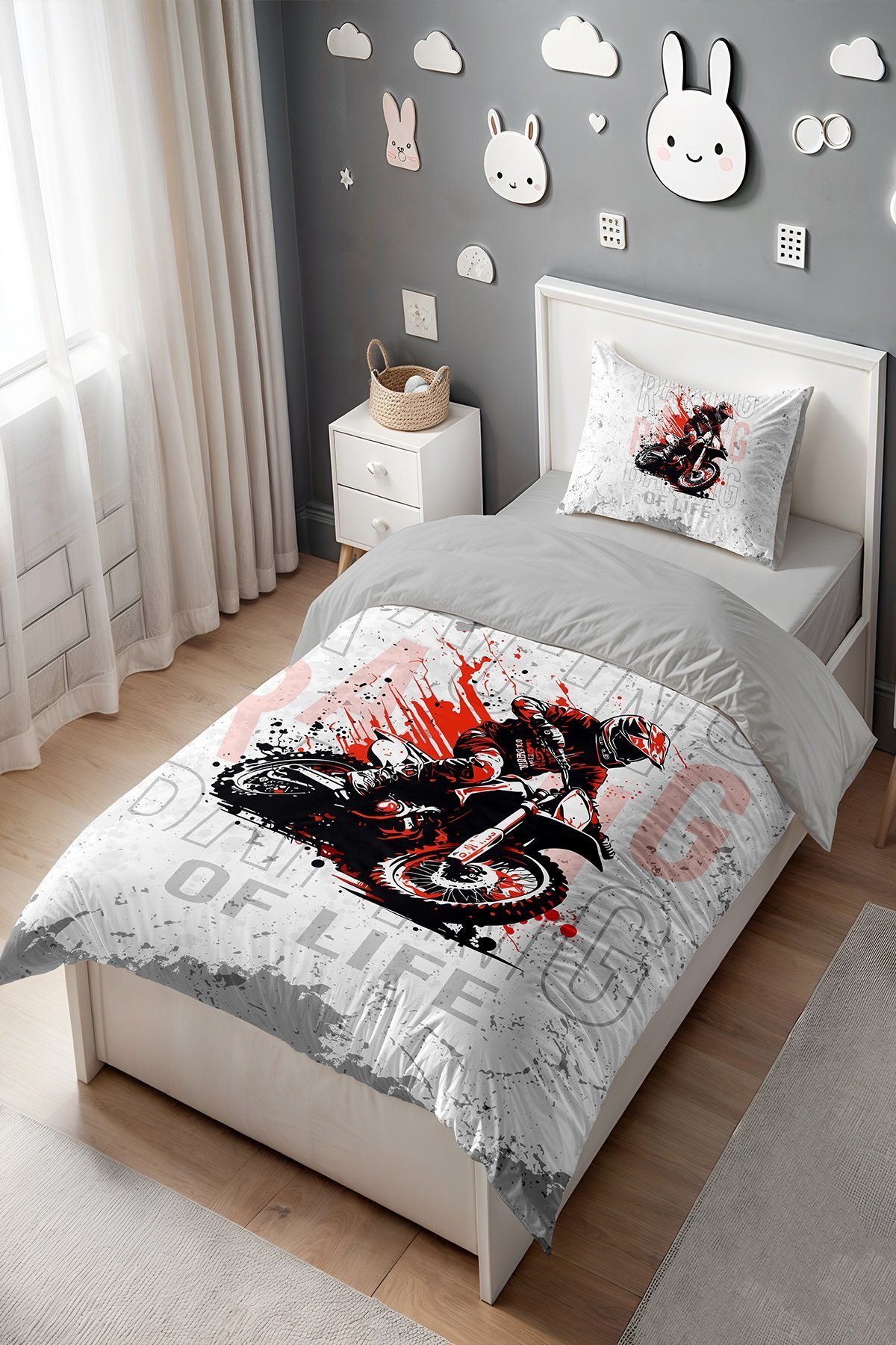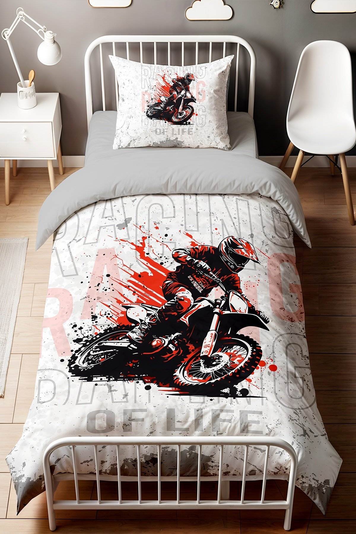 Kırmızı Motor Yarışçı Desenli Tek Kişilik Bebek Çocuk Nevresim Seti