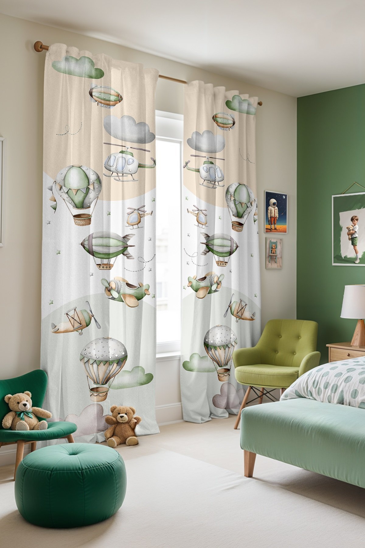 Krem Yeşil Uçaklar Desenli Çocuk Bebek Odası Fon Perde (Tek Kanat Fiyatlandırma)