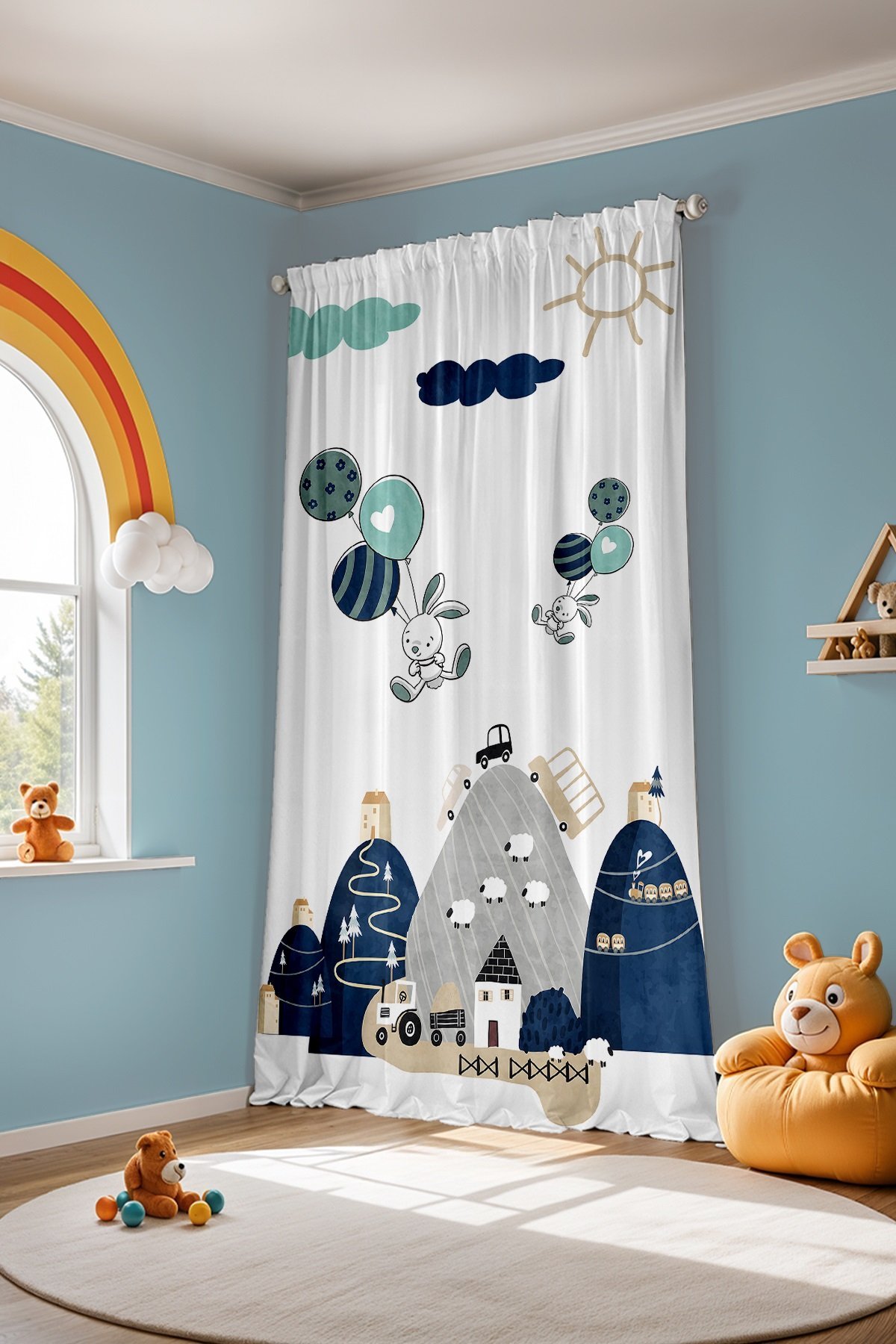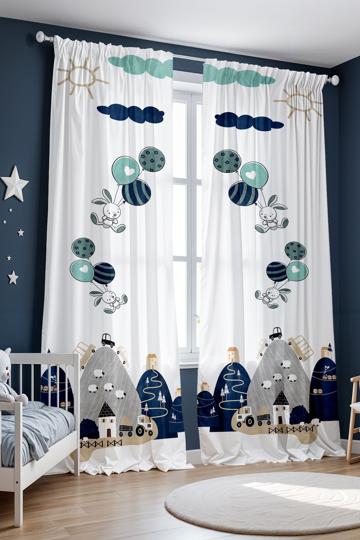 Lacivert Dağlardaki Araçlar Çocuk Bebek Odası Fon Perde (Tek Kanat Fiyatlandırma)