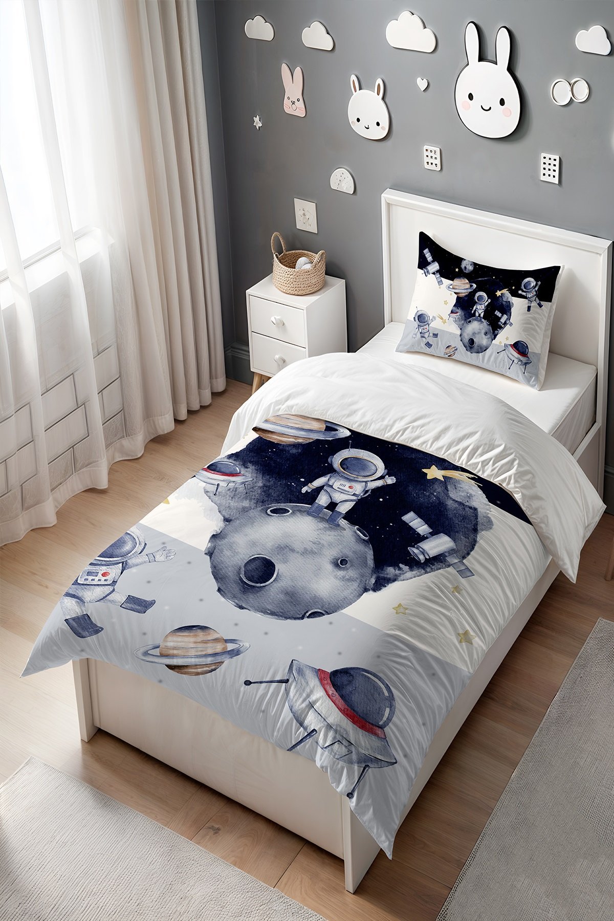 Lacivert Gri Maceracı Astronot Desenli Tek Kişilik Bebek Çocuk Nevresim Seti