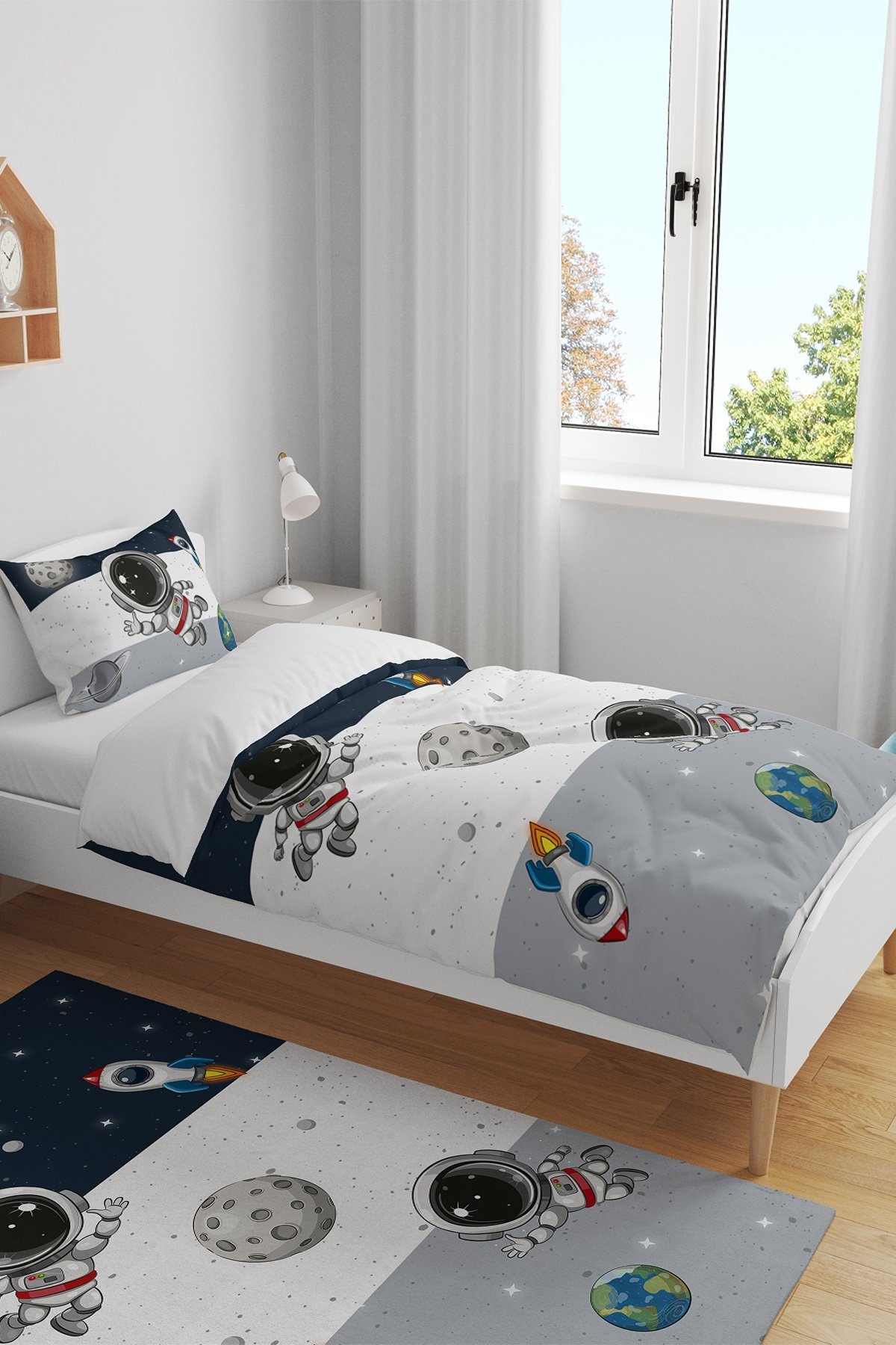 Lacivert Gri Uzay ve Minik Astonot Desenli Tek Kişilik Bebek Çocuk Nevresim Seti