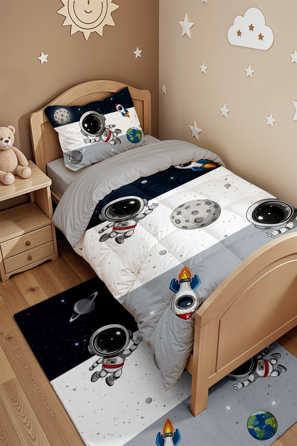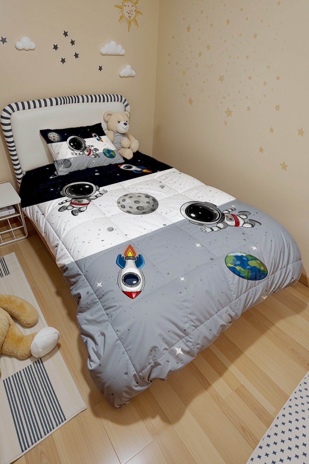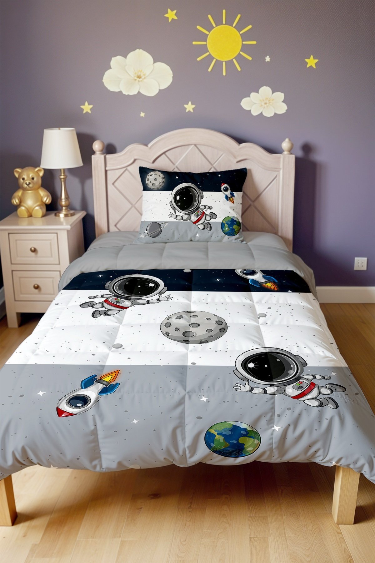 Lacivert Gri Uzay Ve Minik Astonot Desenli Tek Kişilik Yorgan ve Yastık Kılıfı