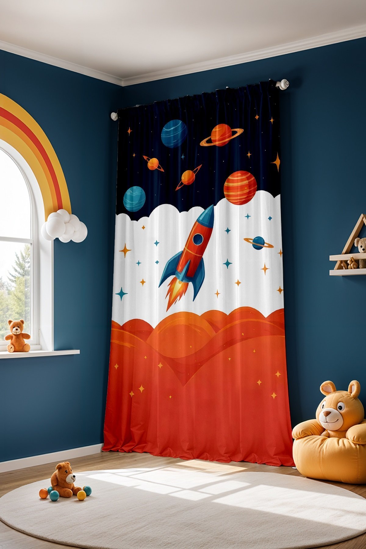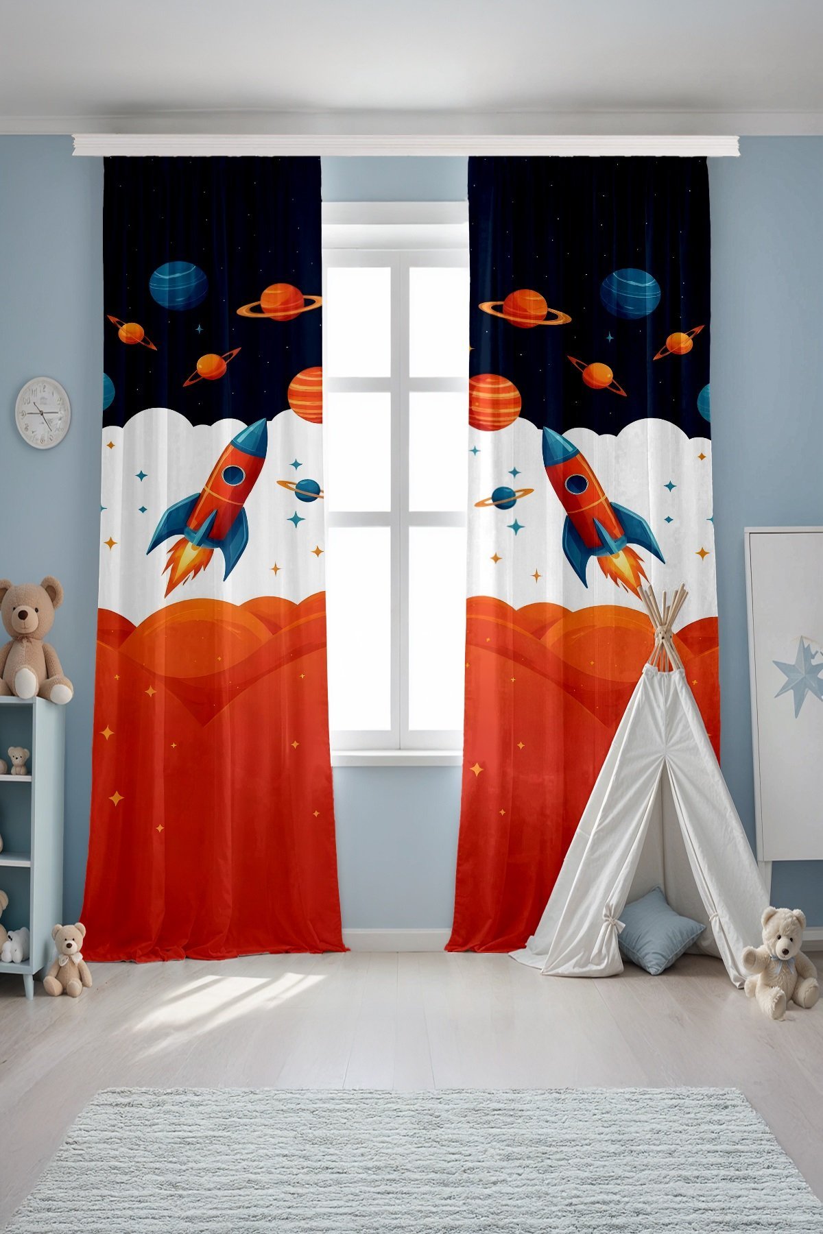 Lacivert Kırmızı Uzay Desenli Çocuk Bebek Odası Fon Perde (Tek Kanat Fiyatlandırma)