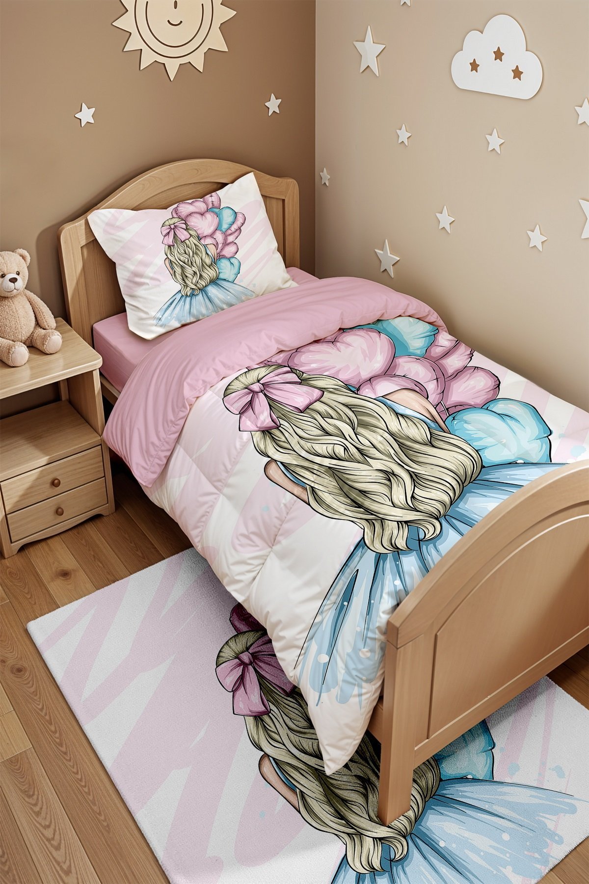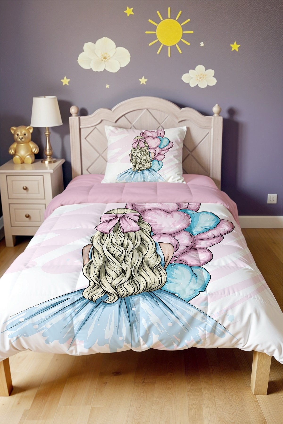 Mavi Balonlu Kız Desenli Tek Kişilik Yorgan ve Yastık Kılıfı