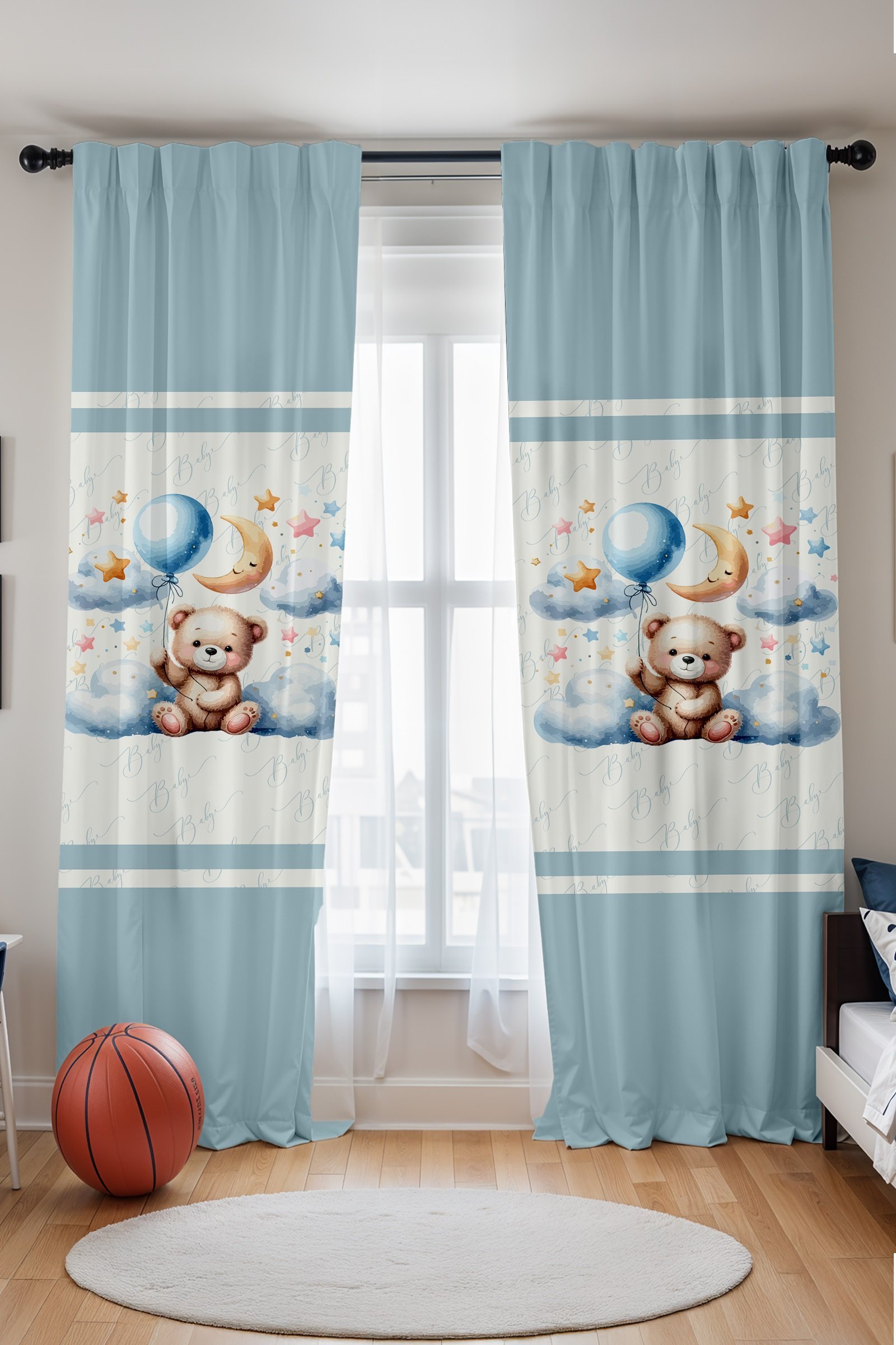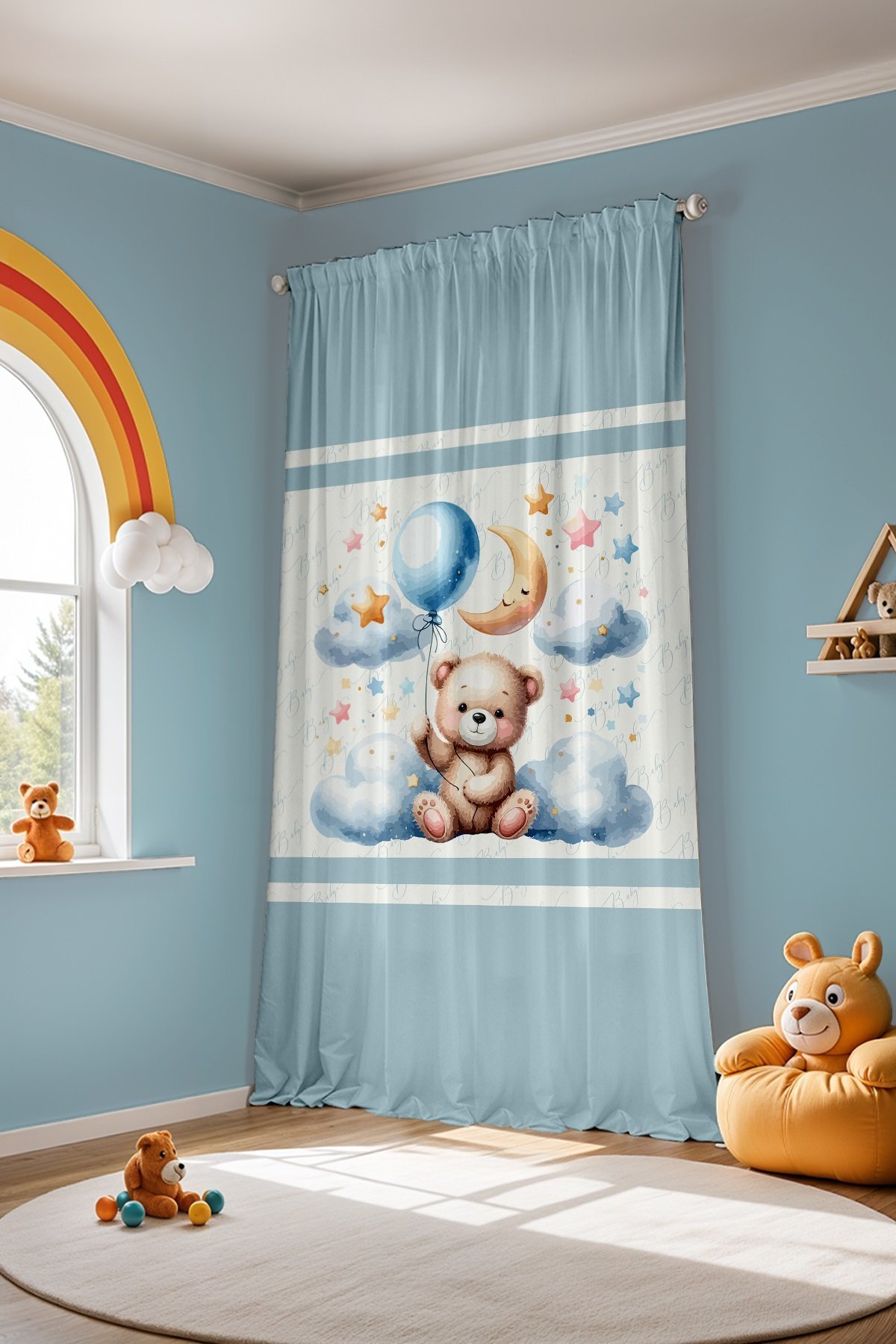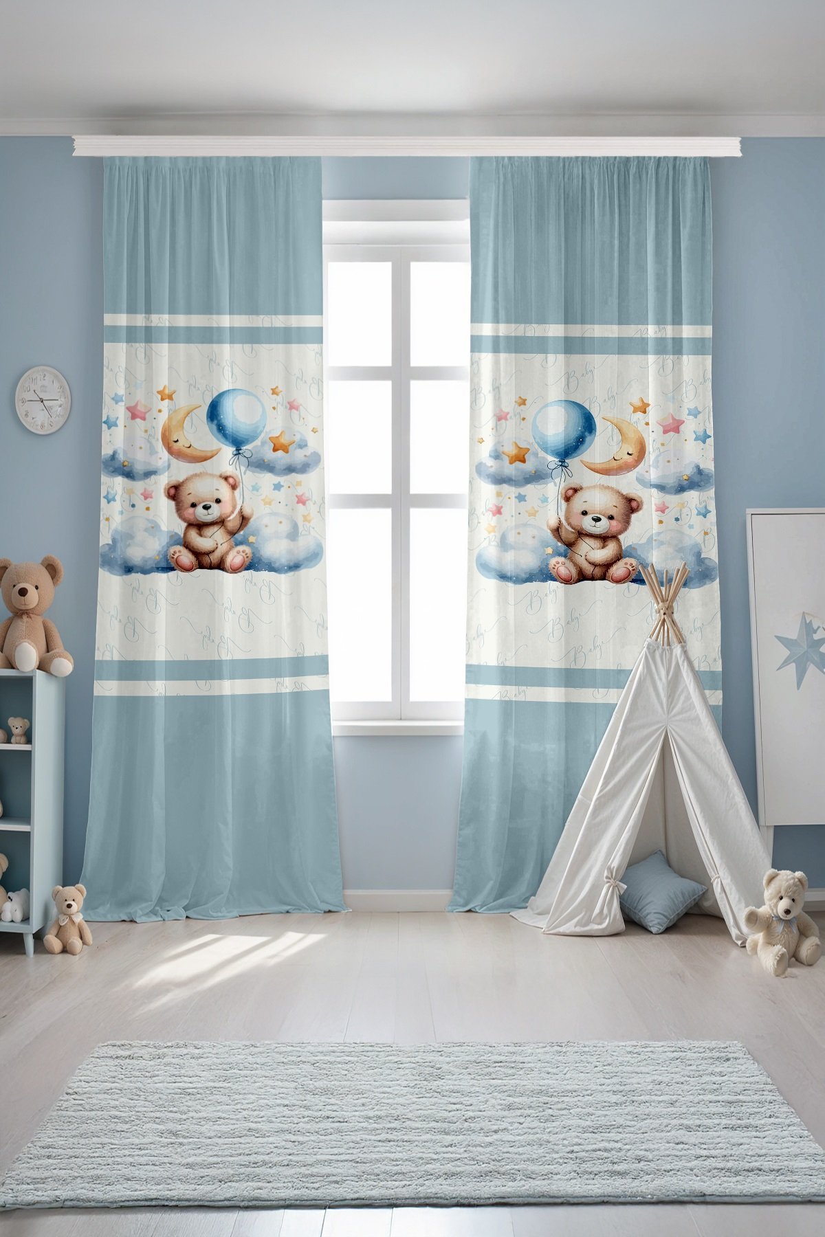 Mavi Bulutlardaki Ayıcık Desenli Çocuk Bebek Odası Fon Perde (Tek Kanat Fiyatlandırma)