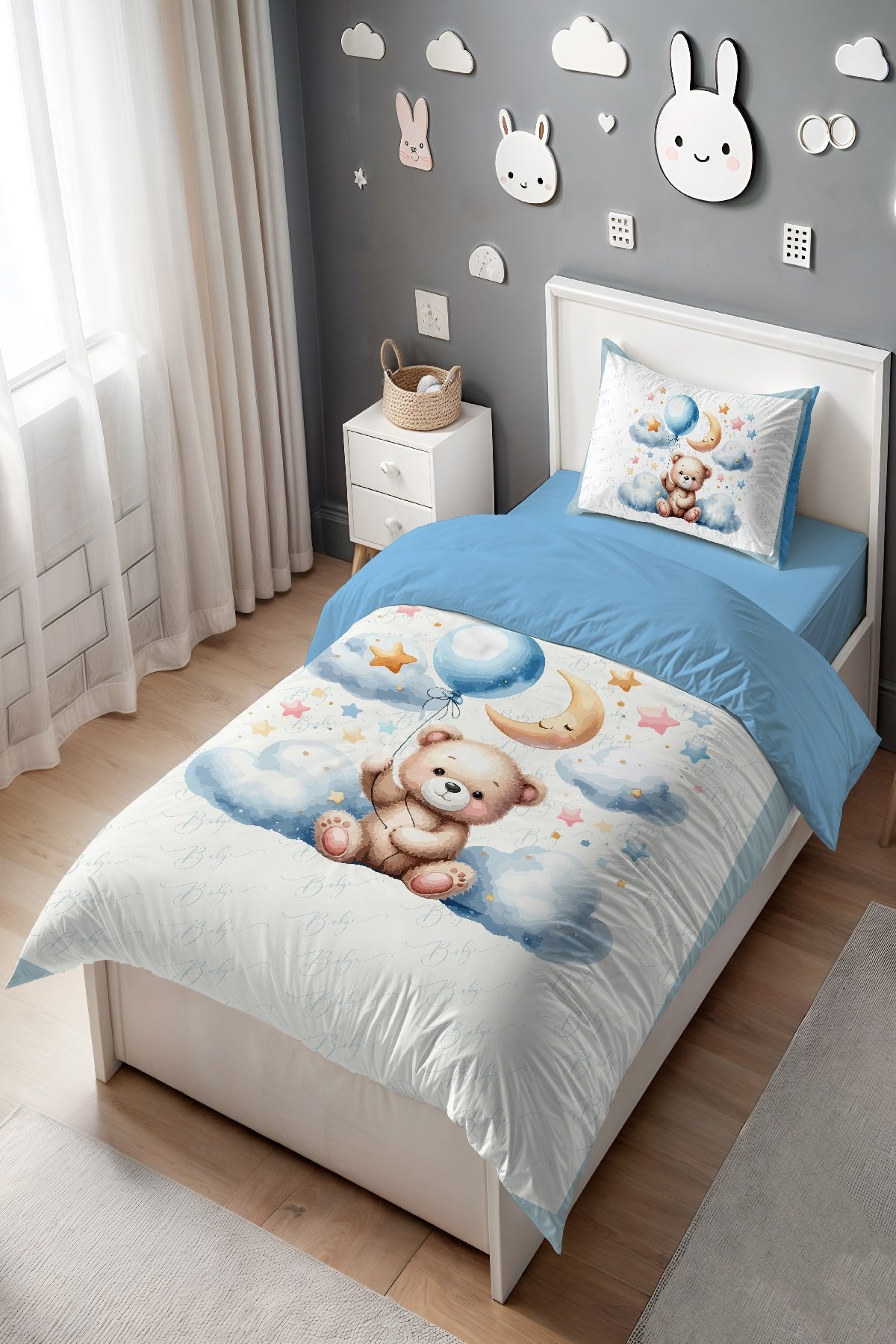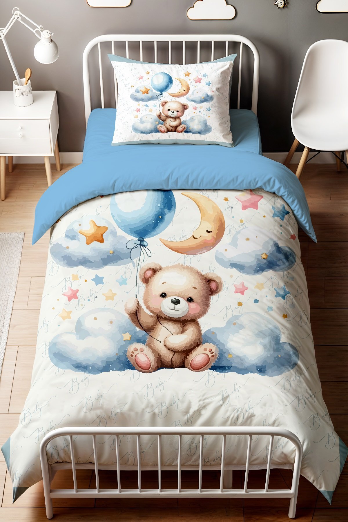 Mavi Bulutlardaki Ayıcık Desenli Tek Kişilik Bebek Çocuk Nevresim Seti