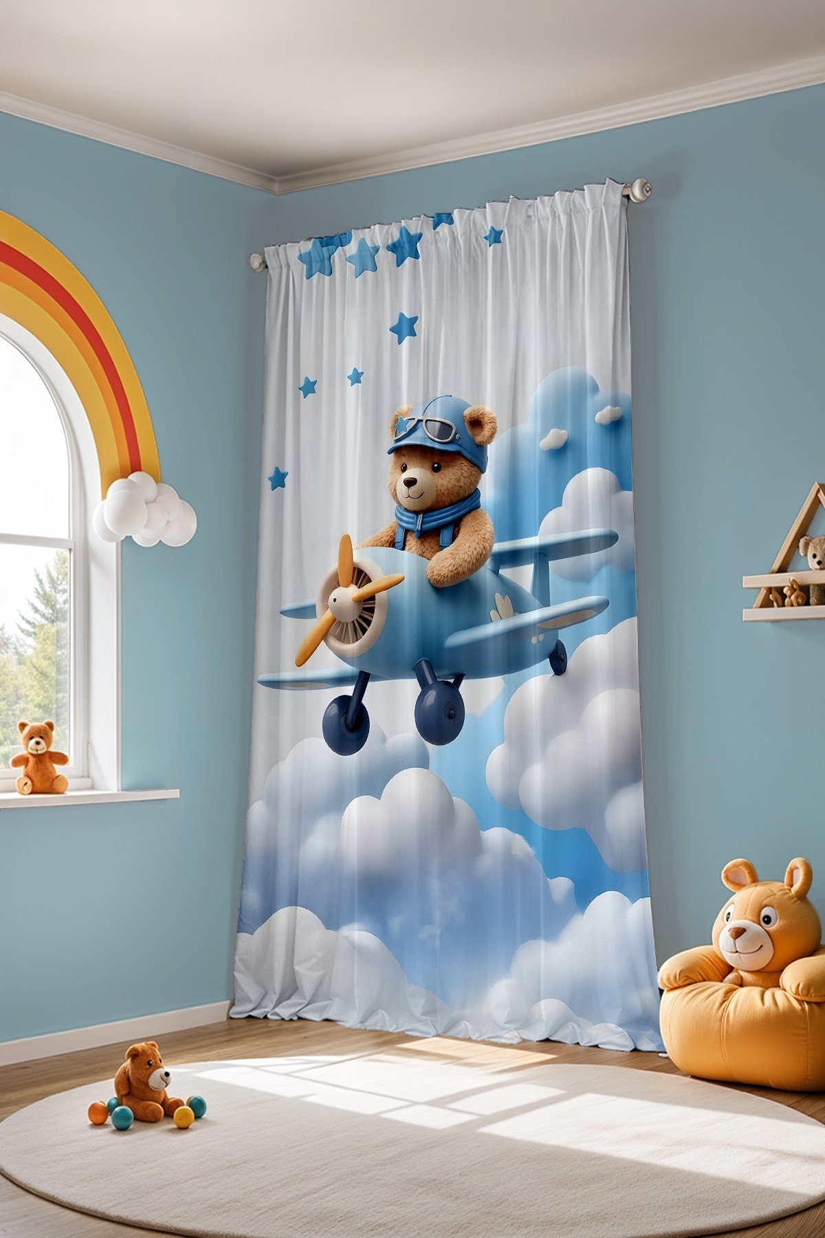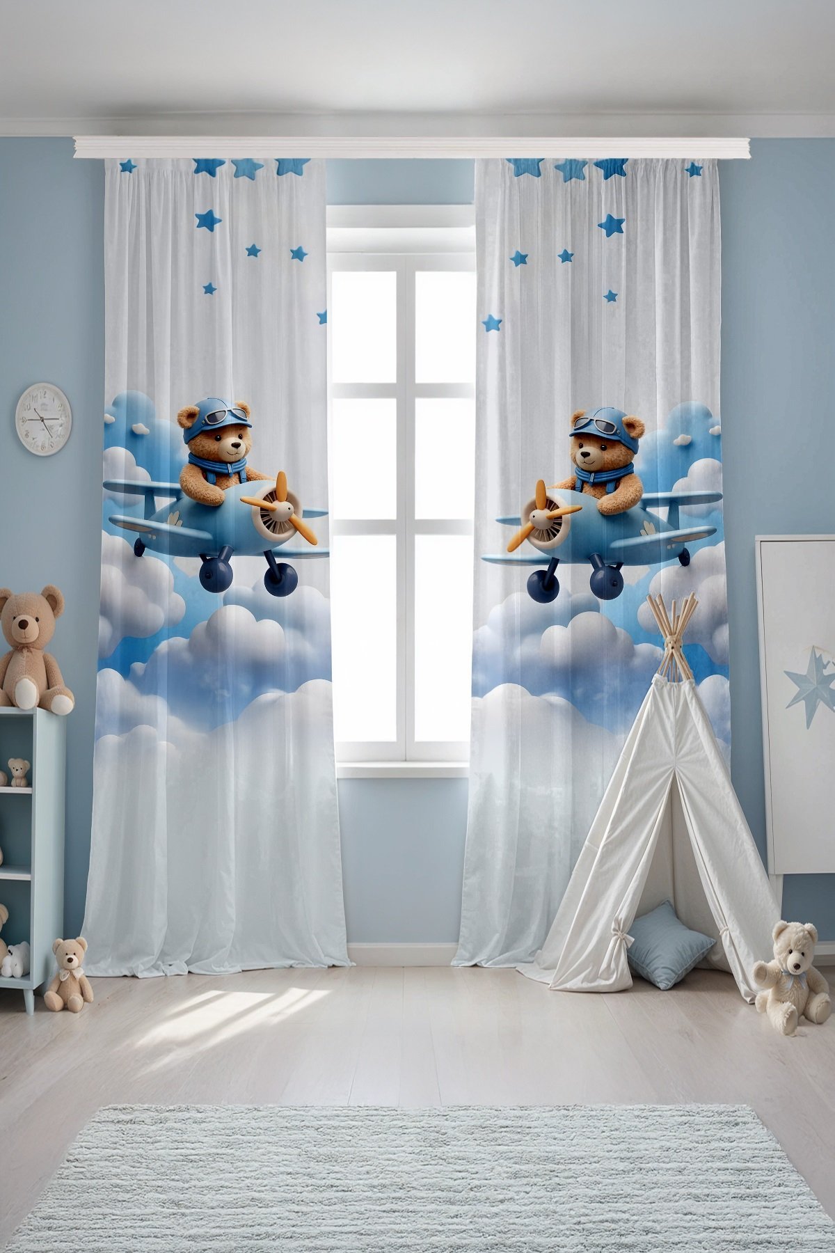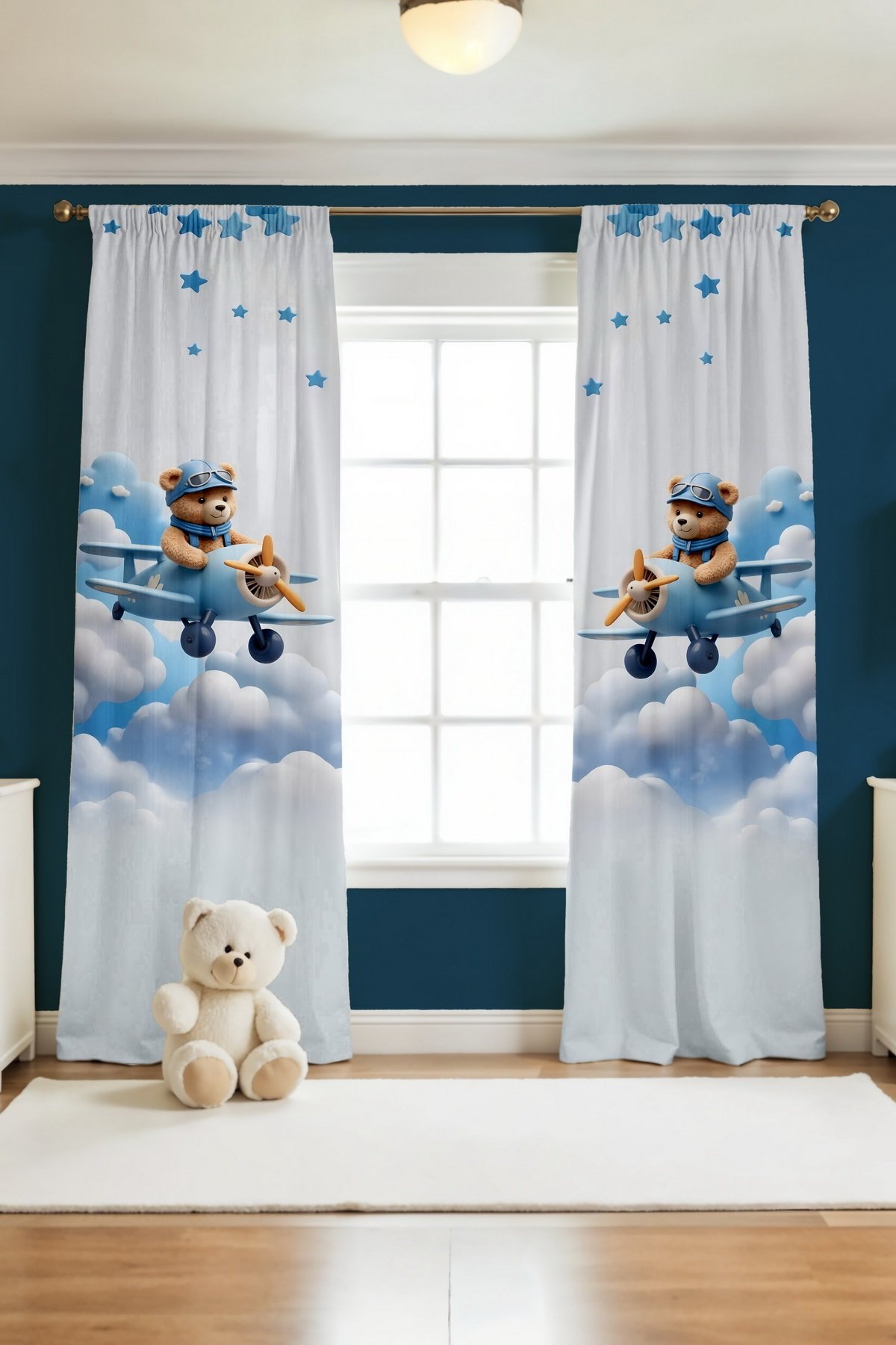 Mavi Bulutlu Pilot Ayıcık Desenli Çocuk Bebek Odası Fon Perde (Tek Kanat Fiyatlandırma)