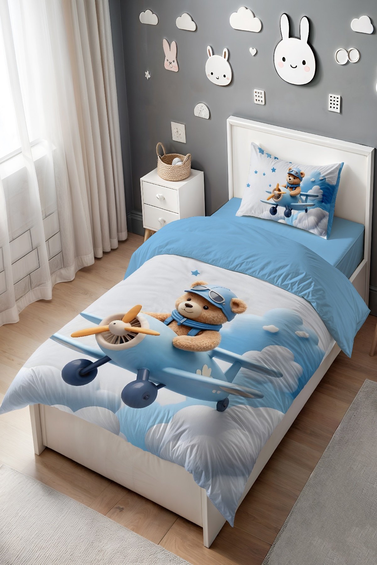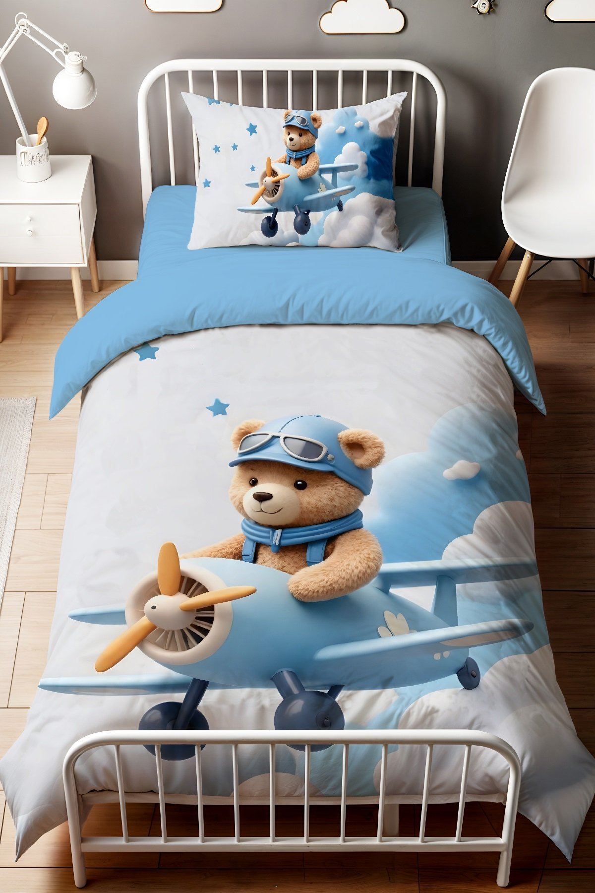 Mavi Bulutlu Pilot Ayıcık Desenli Tek Kişilik Bebek Çocuk Nevresim Seti