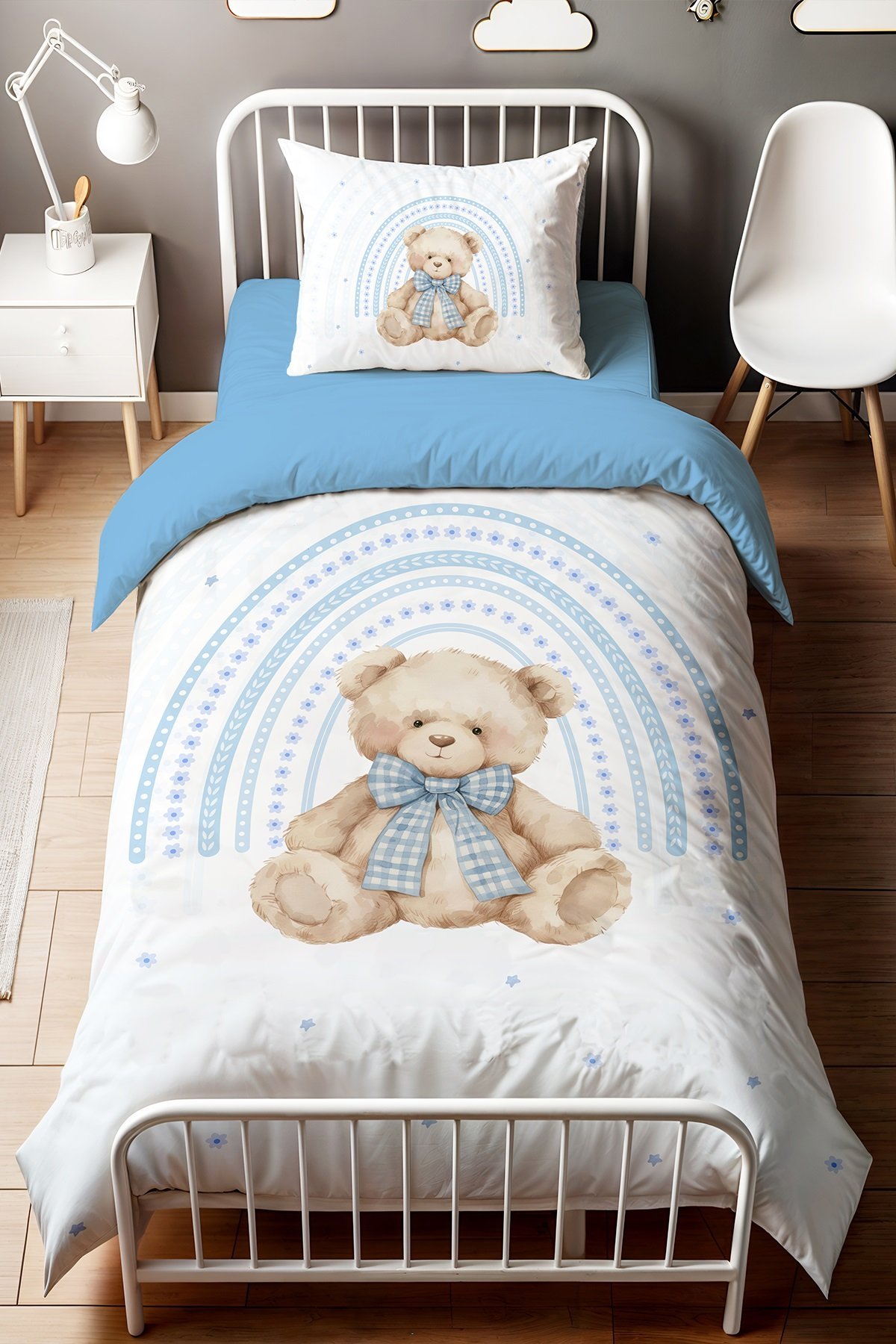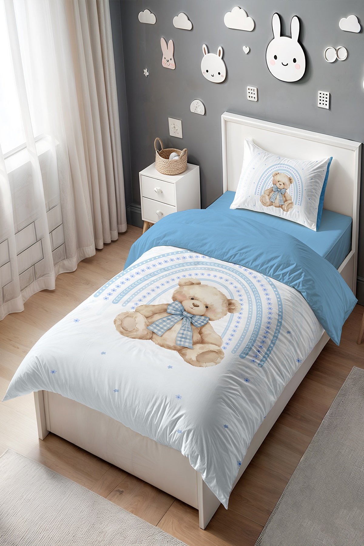 Mavi Gökkuşaklı Şirin Ayıcık Desenli Tek Kişilik Bebek Çocuk Nevresim Seti