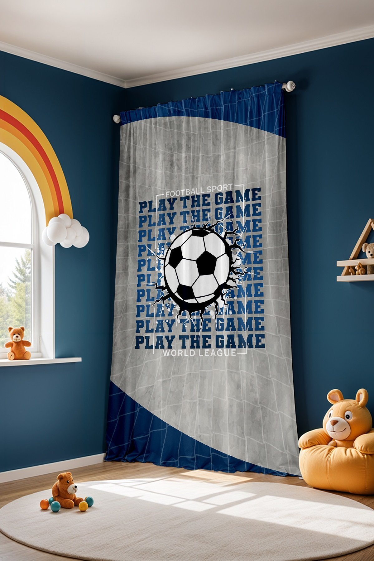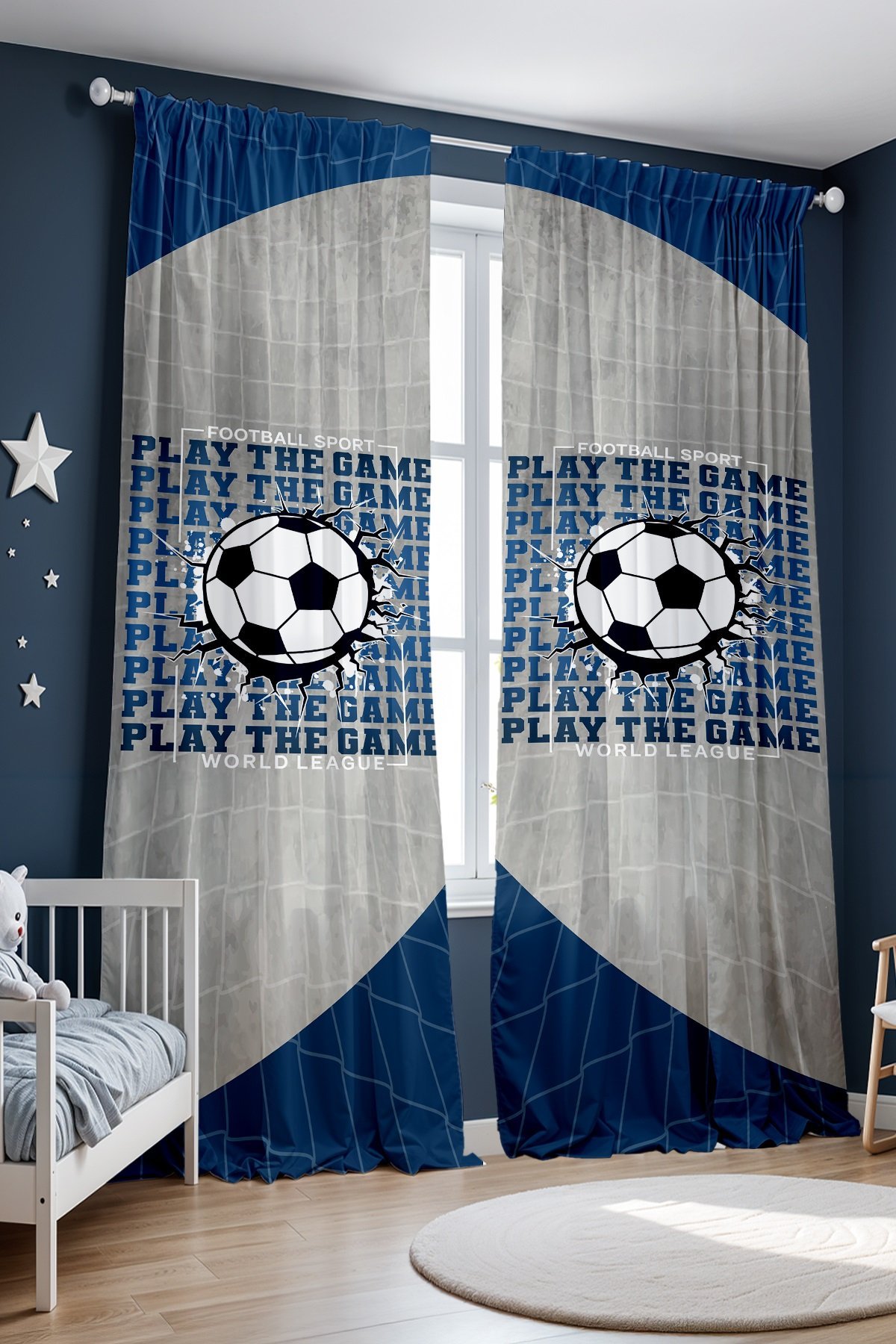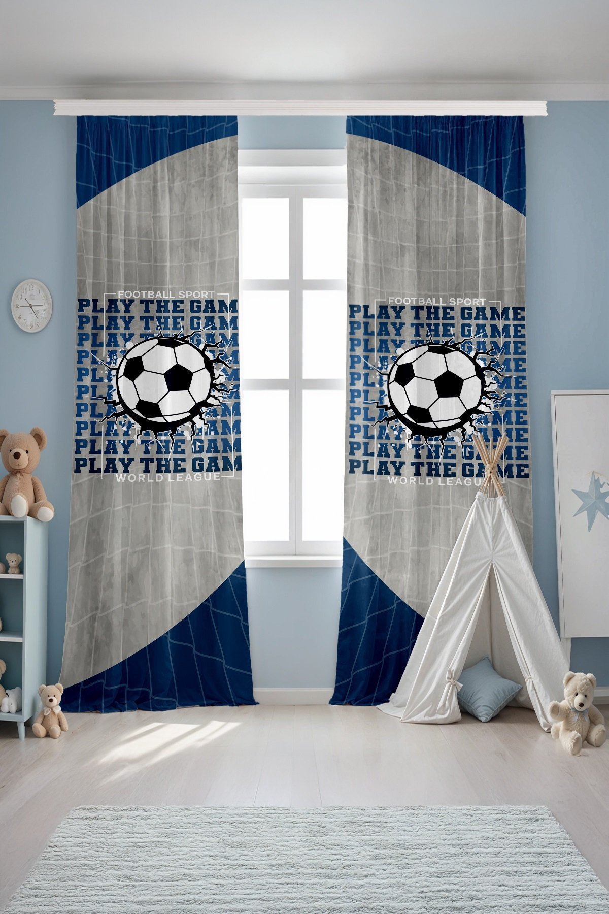Mavi Gri Futbol Ligi Desenli Çocuk Bebek Odası Fon Perde (Tek Kanat Fiyatlandırma)