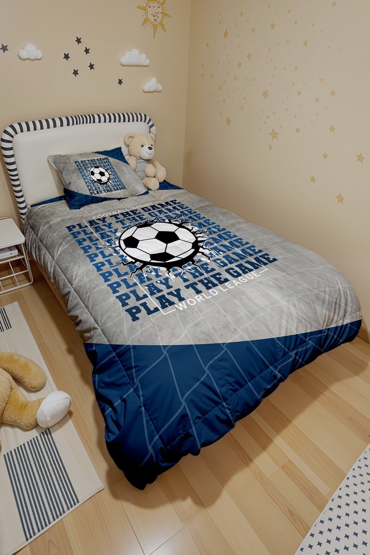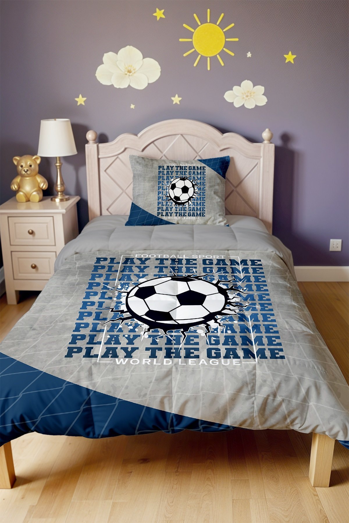 Mavi Gri Futbol Ligi Desenli Tek Kişilik Yorgan ve Yastık Kılıfı