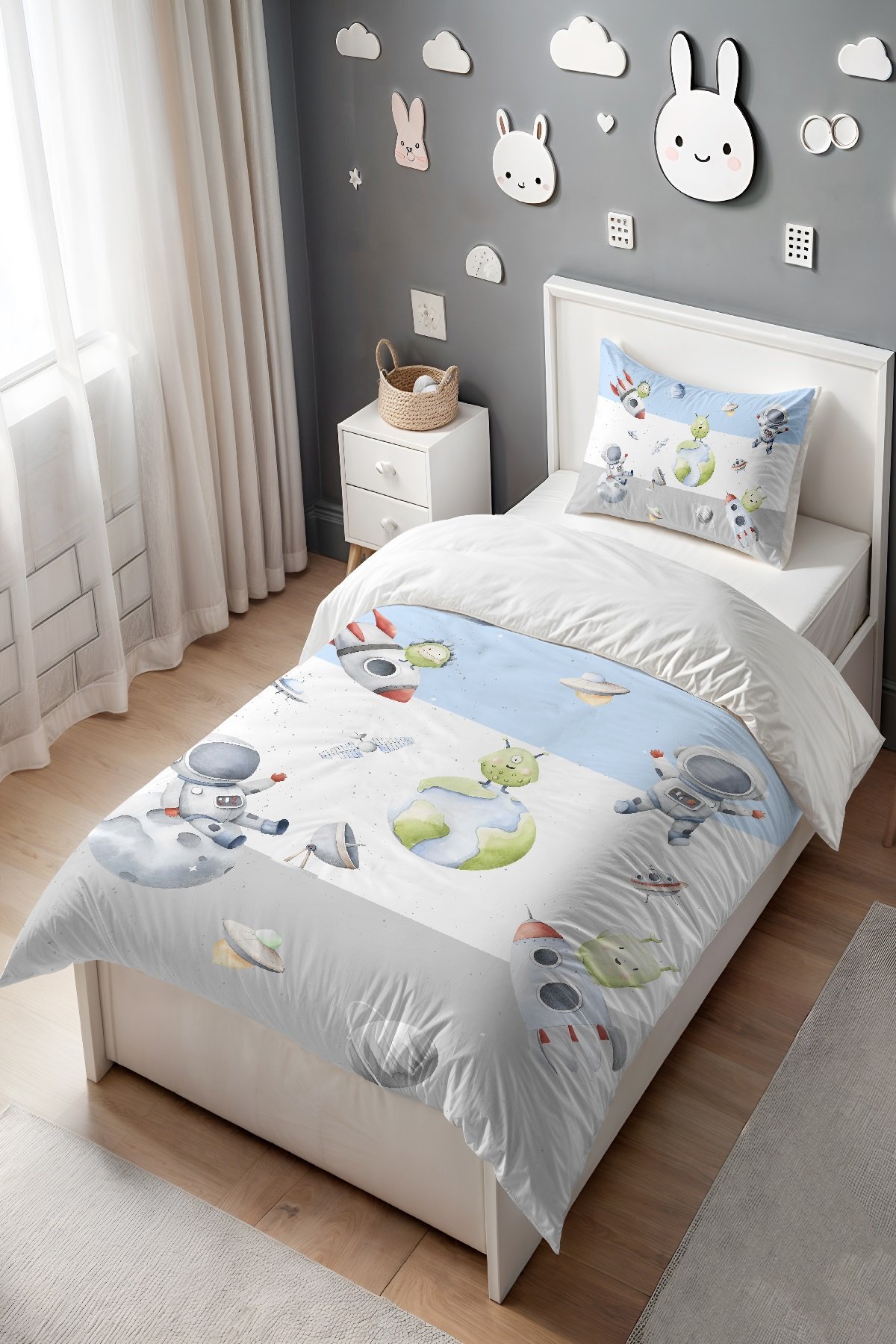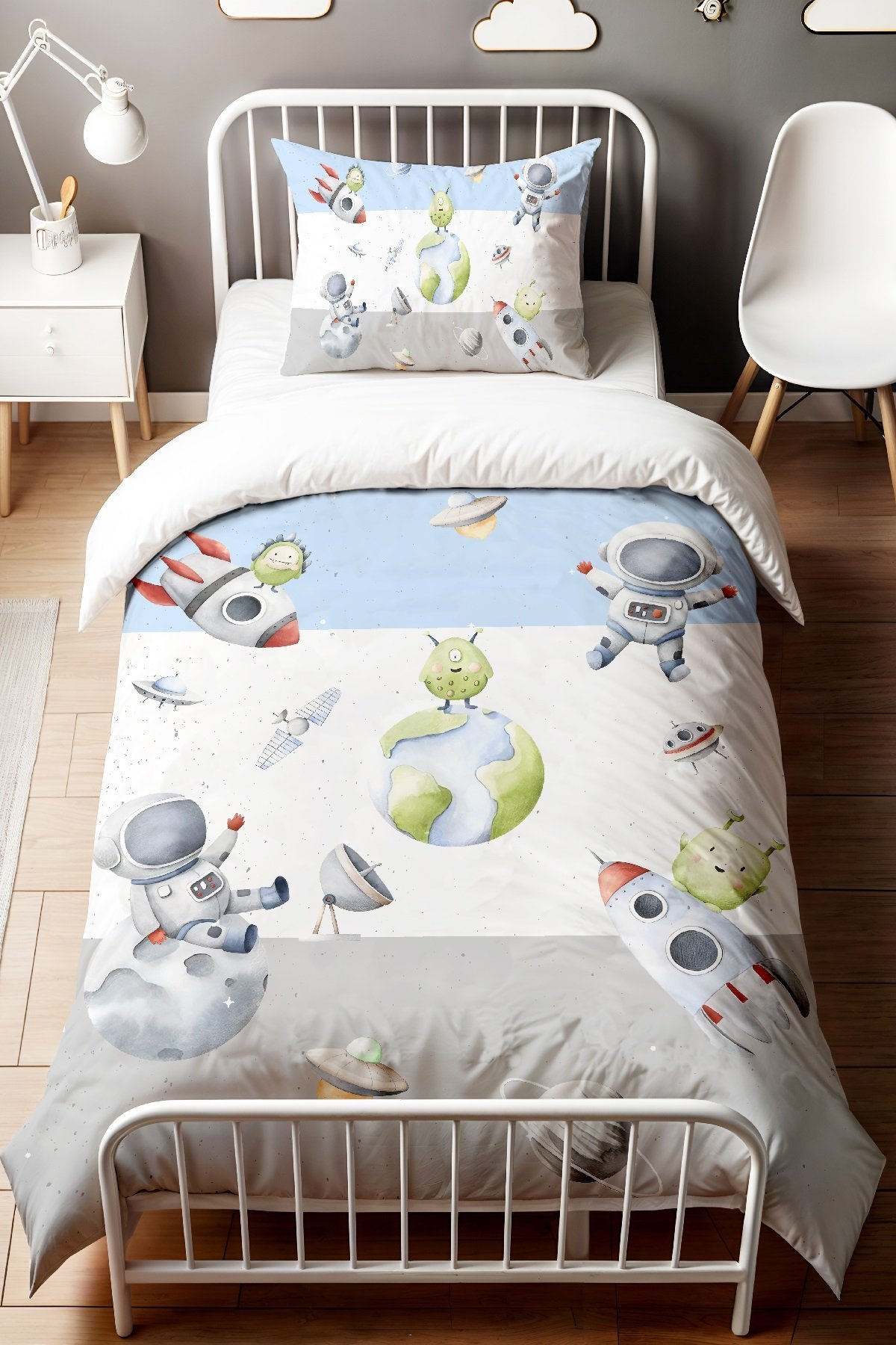 Mavi Gri Uzay Desenli Tek Kişilik Bebek Çocuk Nevresim Seti
