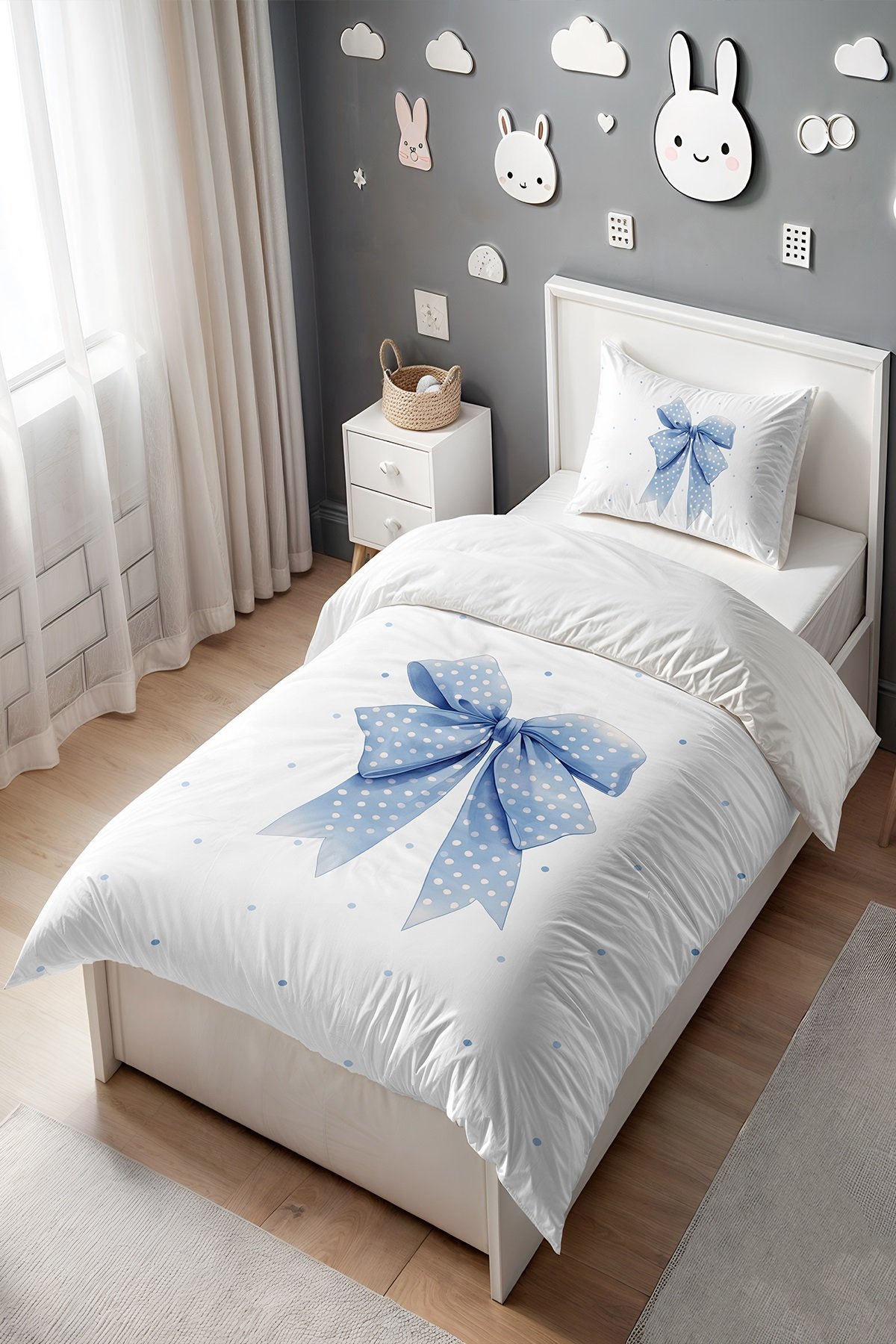 Mavi Puantiyeli Fiyonk Desenli Tek Kişilik Bebek Çocuk Nevresim Seti