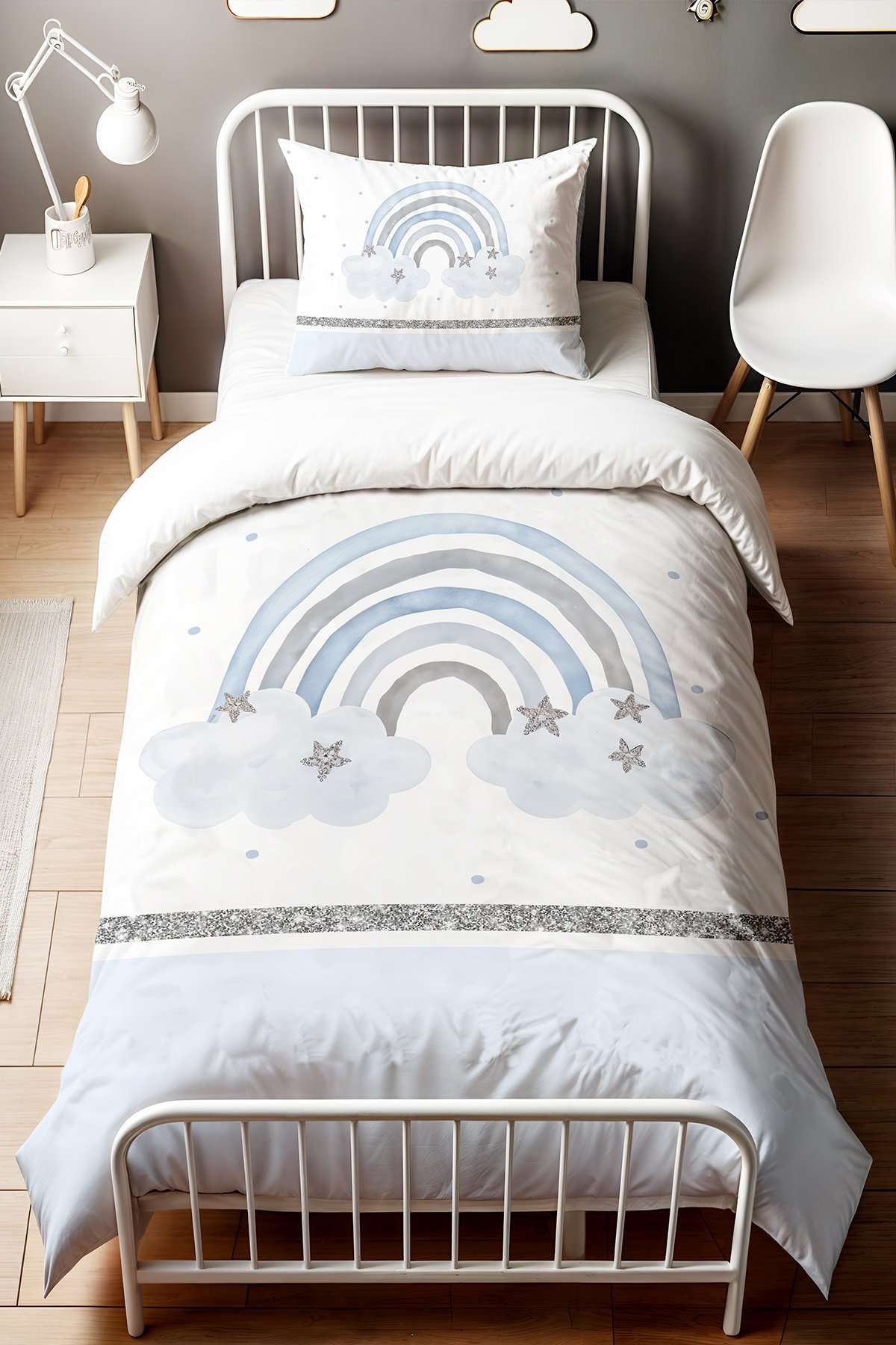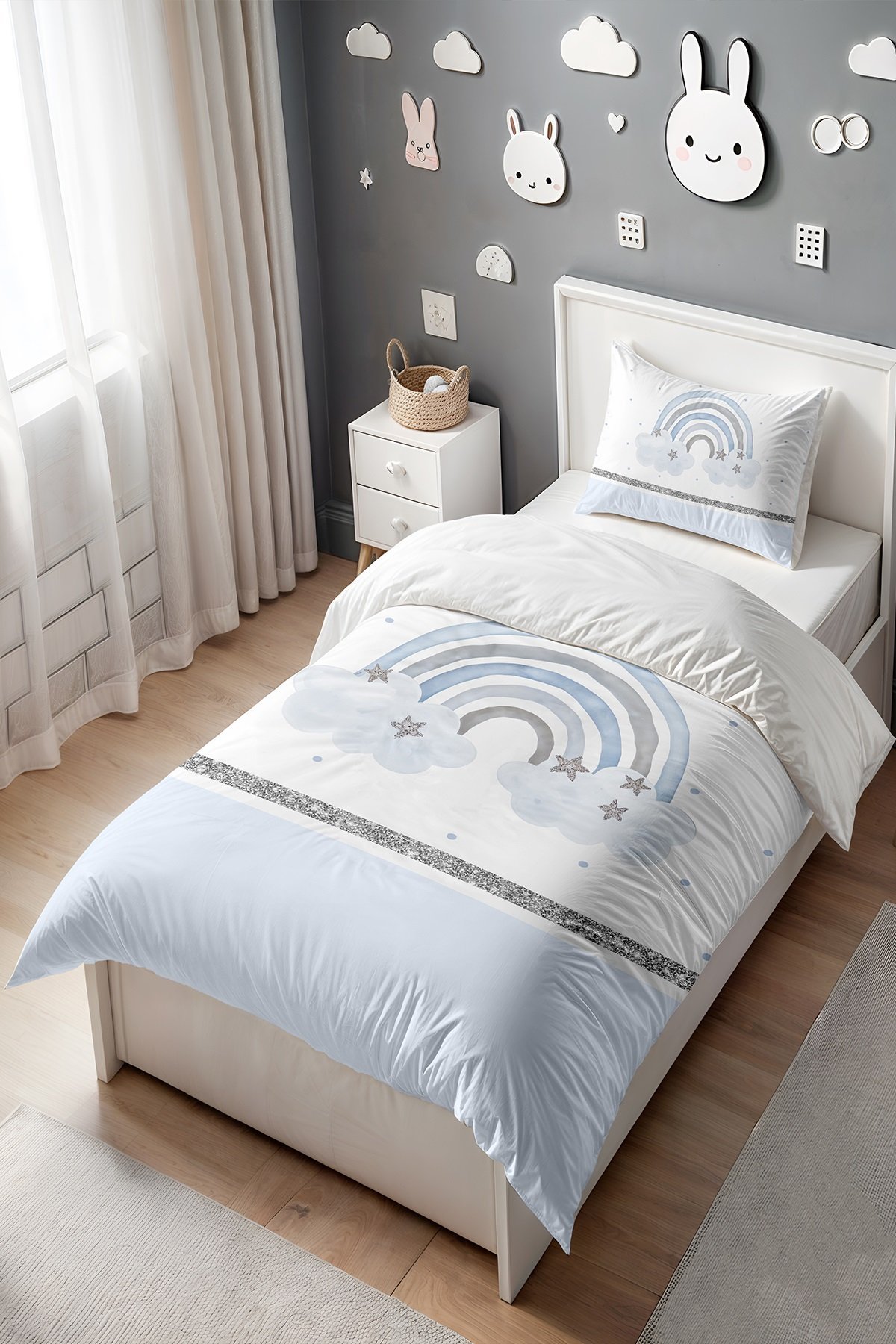 Mavi Simli Gökkuşağı Desenli Tek Kişilik Bebek Çocuk Nevresim Seti
