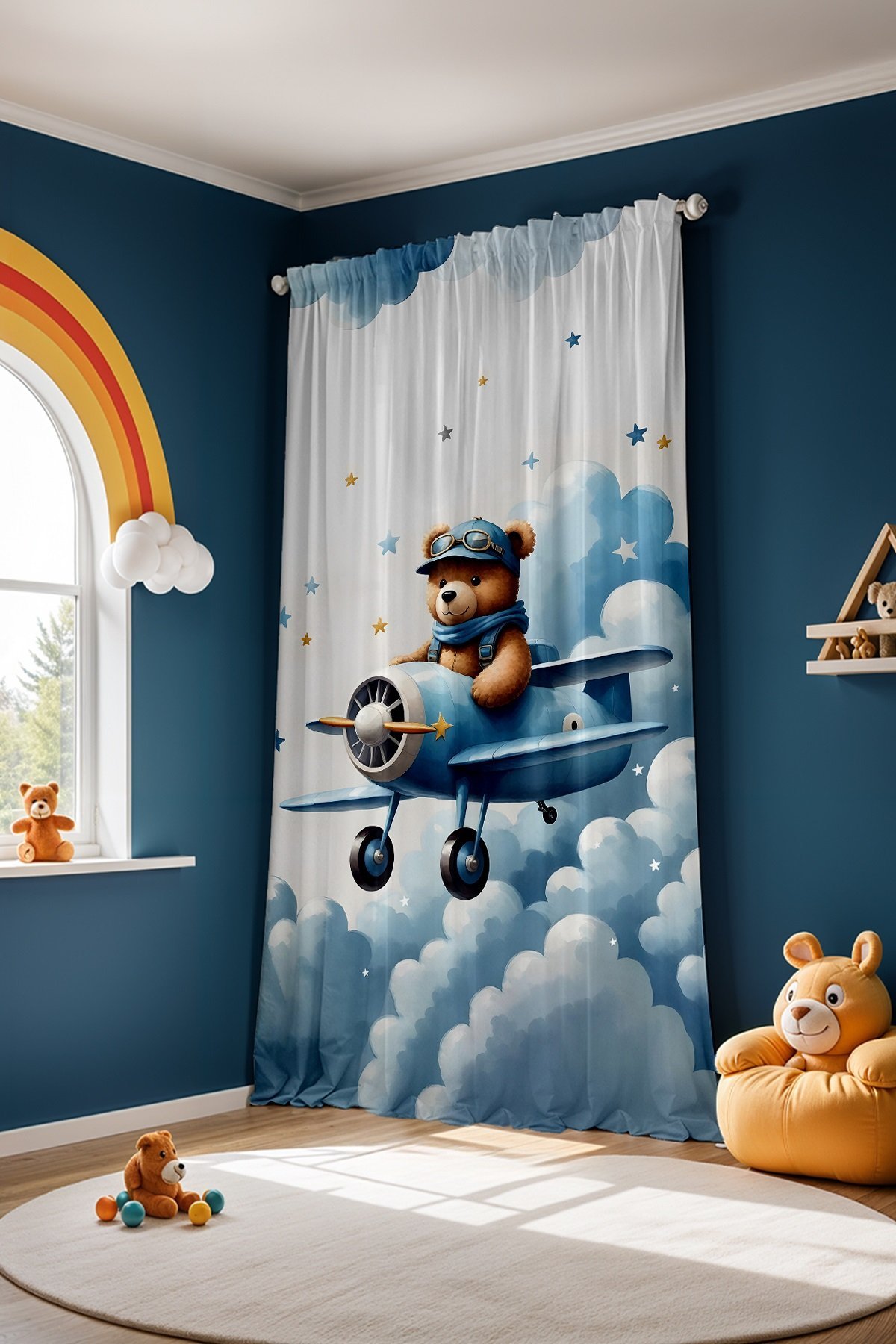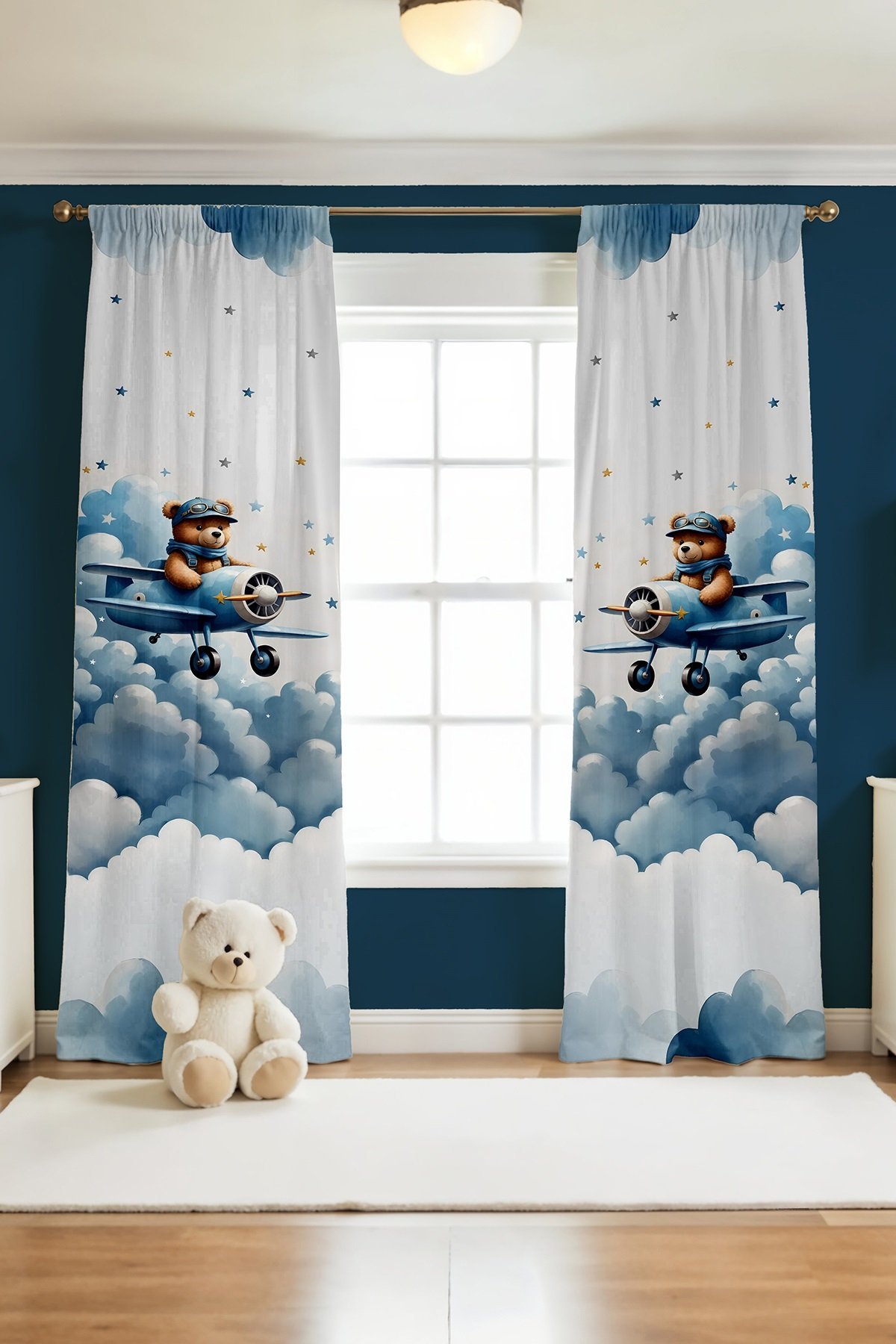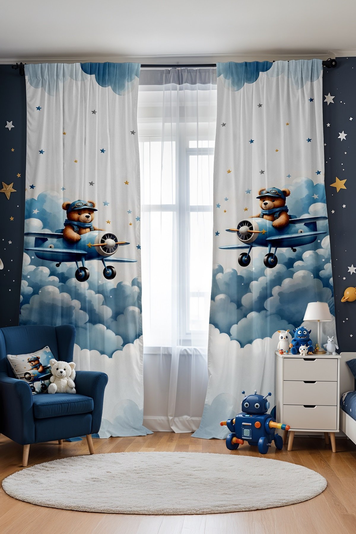 Mavi Uçaklı Ayıcık Desenli Çocuk Bebek Odası Fon Perde (Tek Kanat Fiyatlandırma)