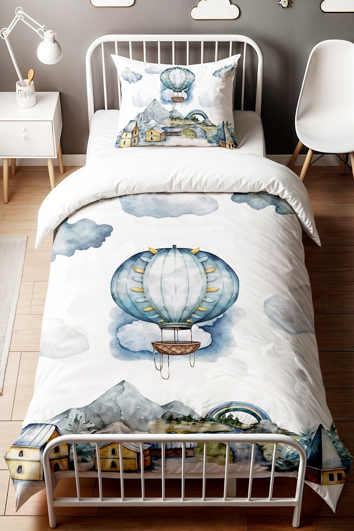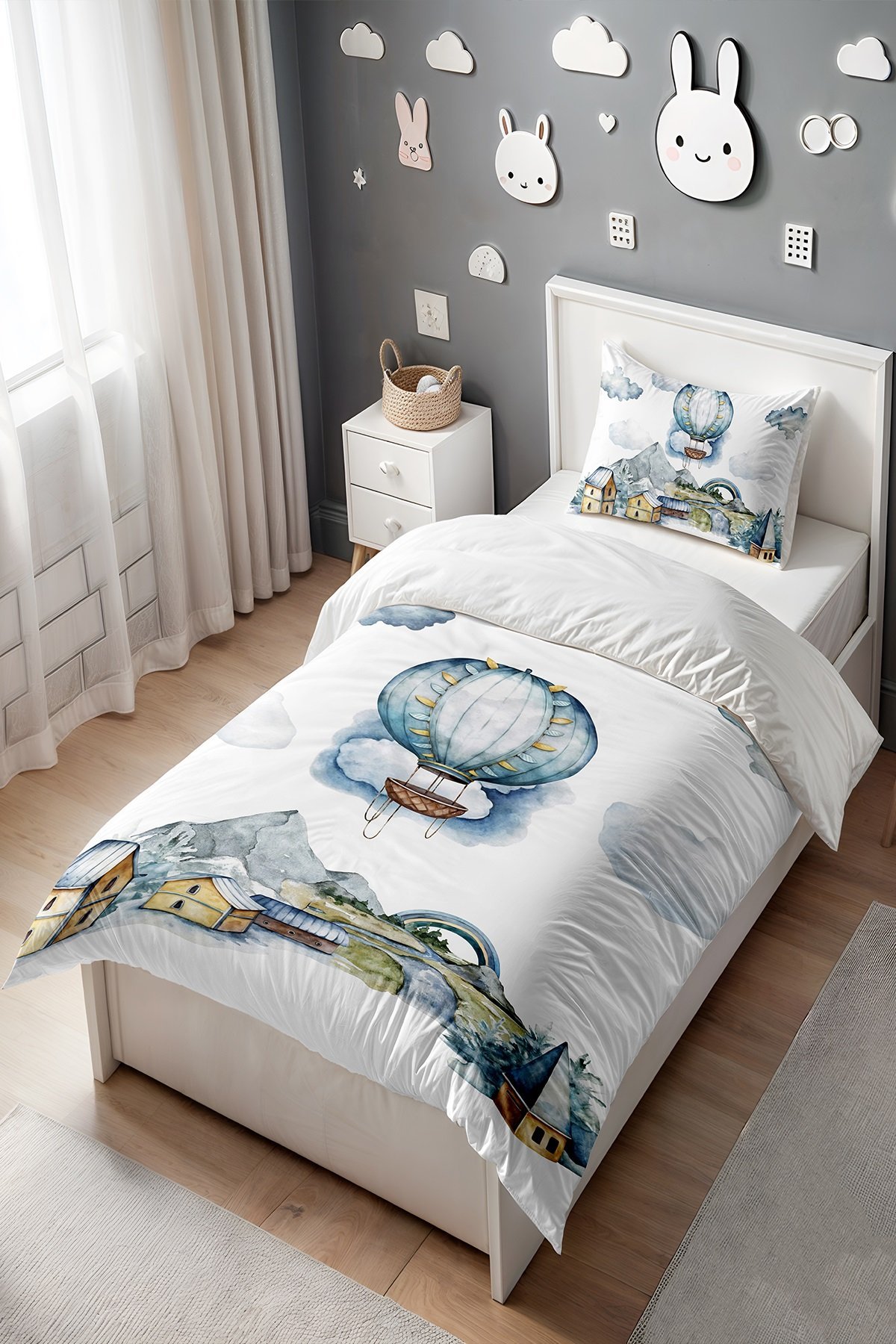 Mavi Uçan Balon ve Evler Desenli Tek Kişilik Bebek Çocuk Nevresim Seti