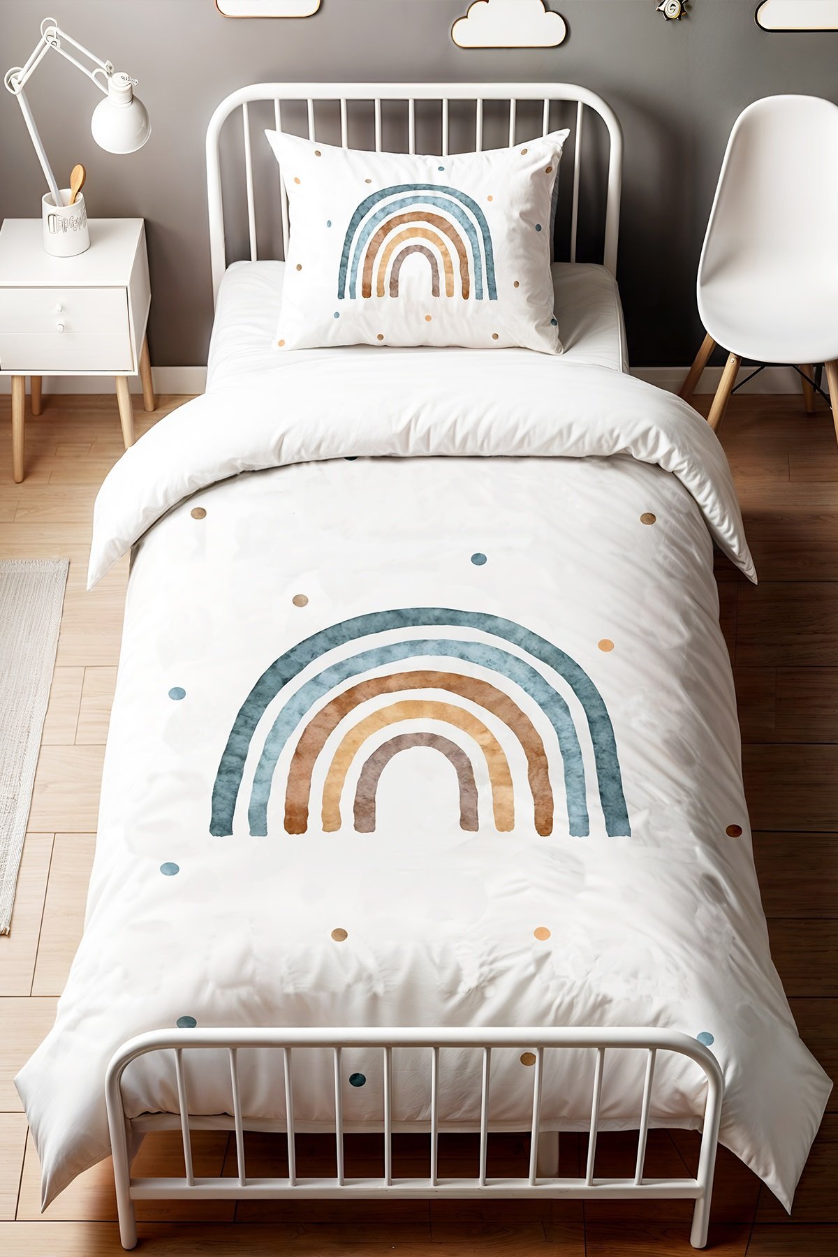 Mavili Gökkuşağı Desenli Tek Kişilik Bebek Çocuk Nevresim Seti