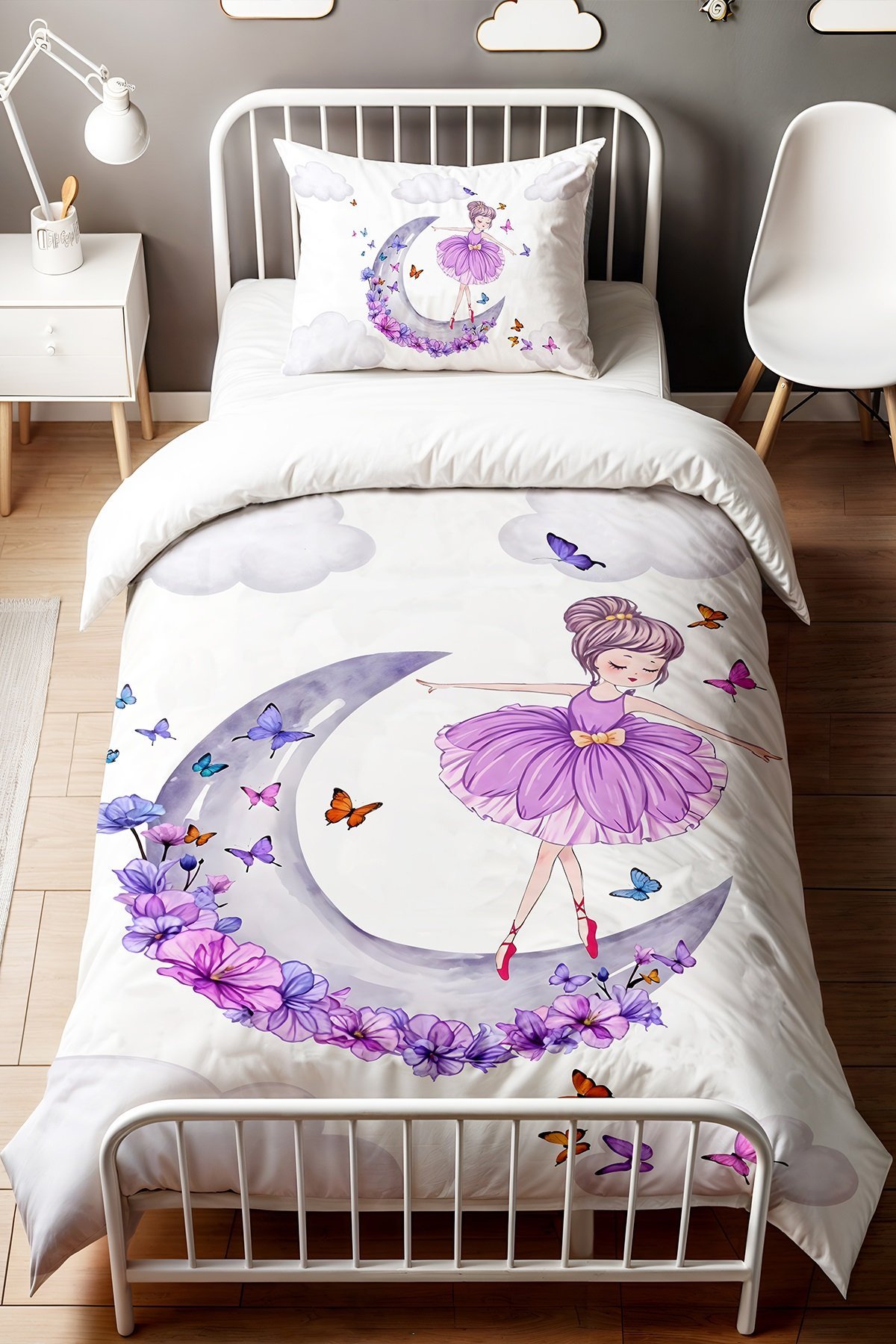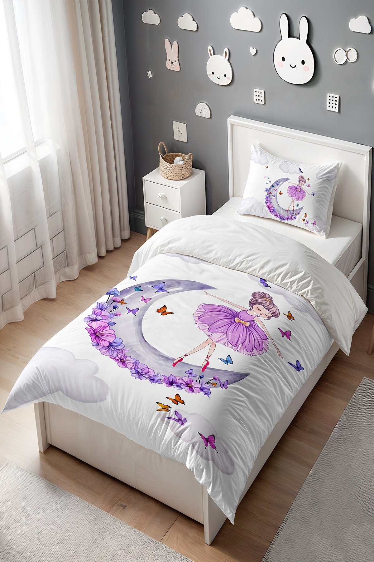 Mor Hilaldeki Peri Desenli Tek Kişilik Bebek Çocuk Nevresim Seti
