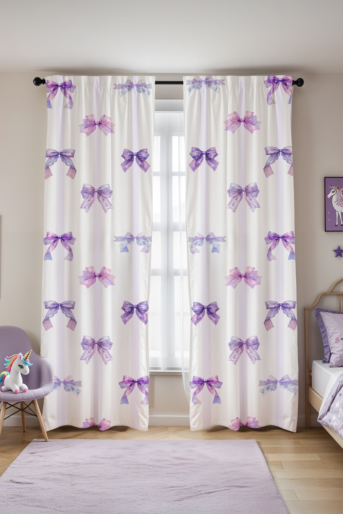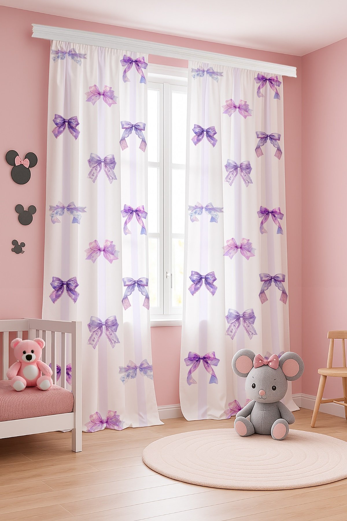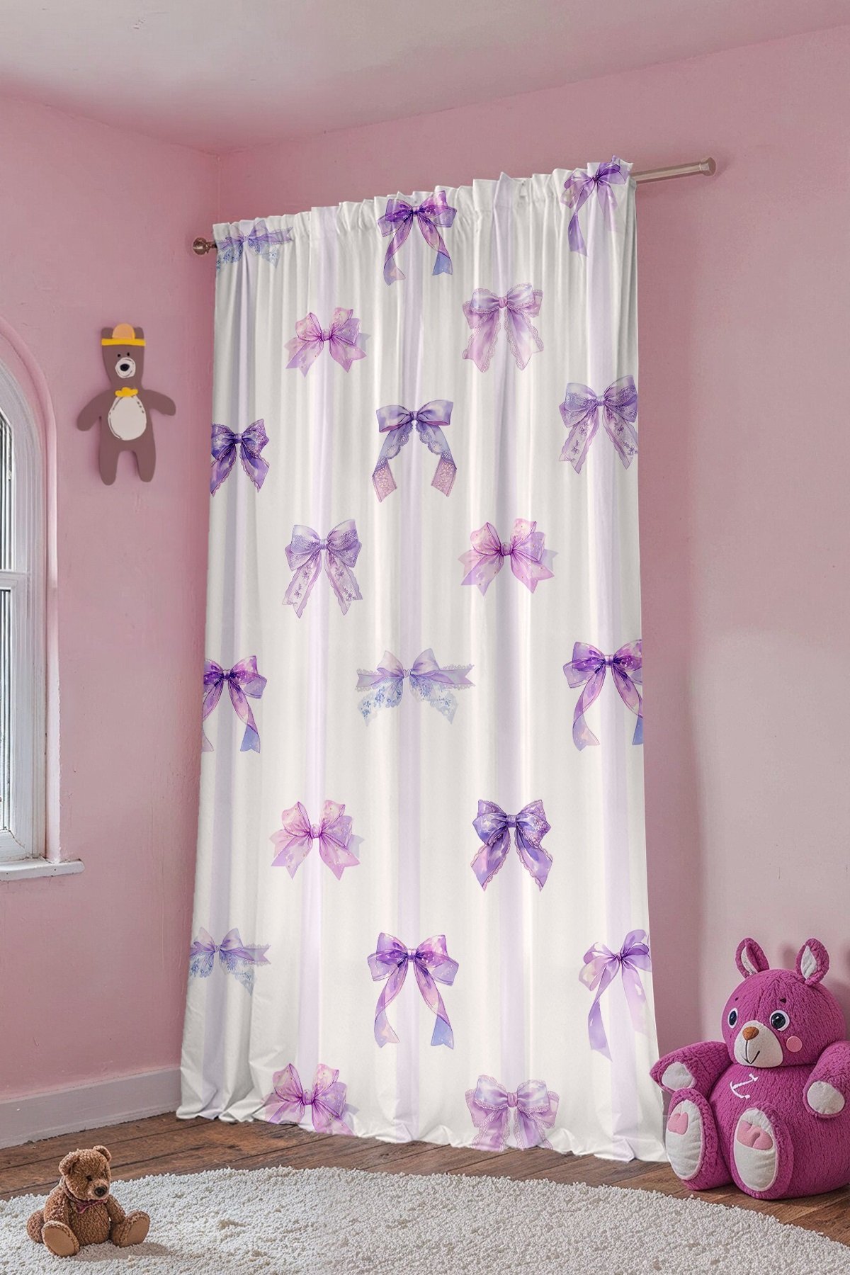 Mor Şeritli Fiyonklar Desenli Çocuk Bebek Odası Fon Perde (Tek Kanat Fiyatlandırma)