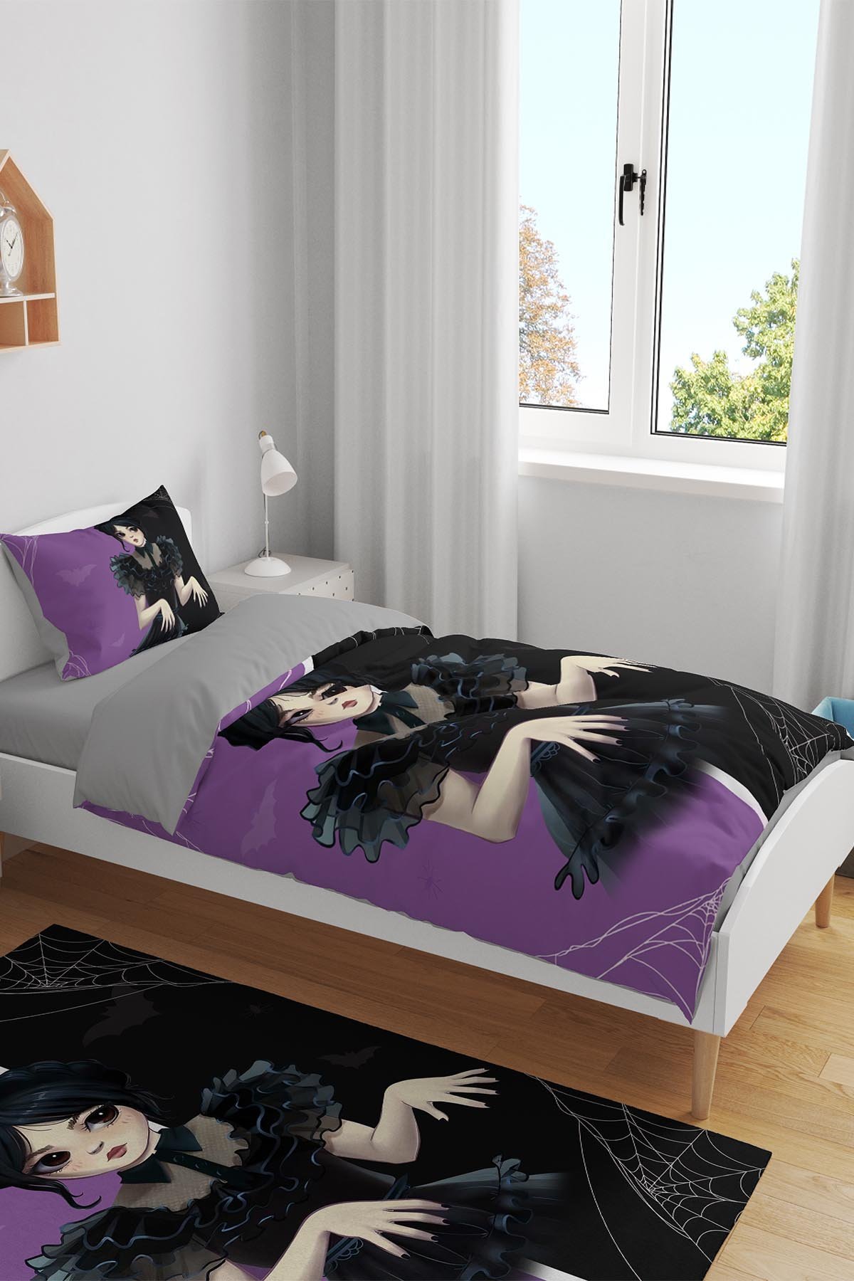 Mor Siyah Yarasalı Wednesday Addams Desenli Tek Kişilik Bebek Çocuk Nevresim Takımı