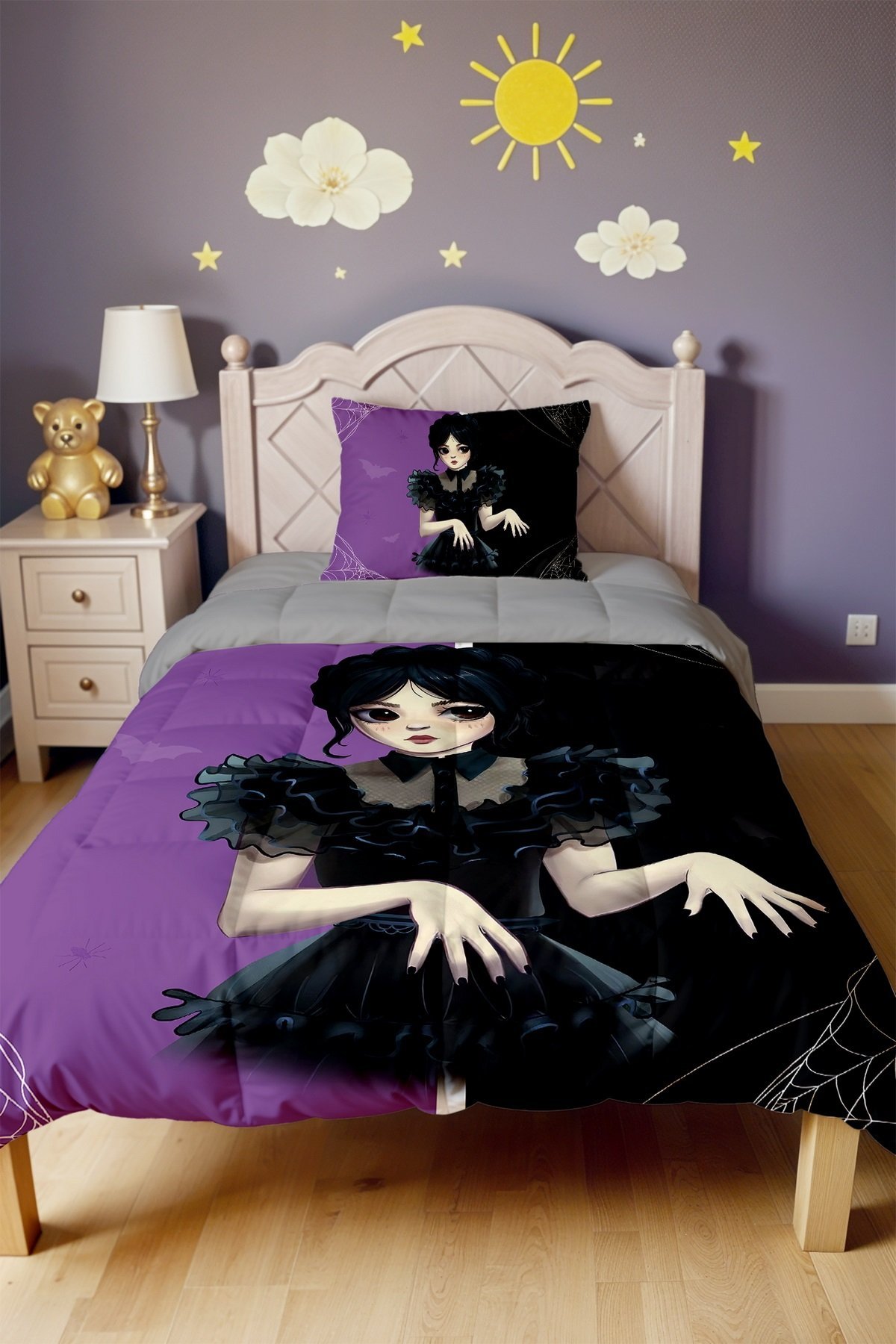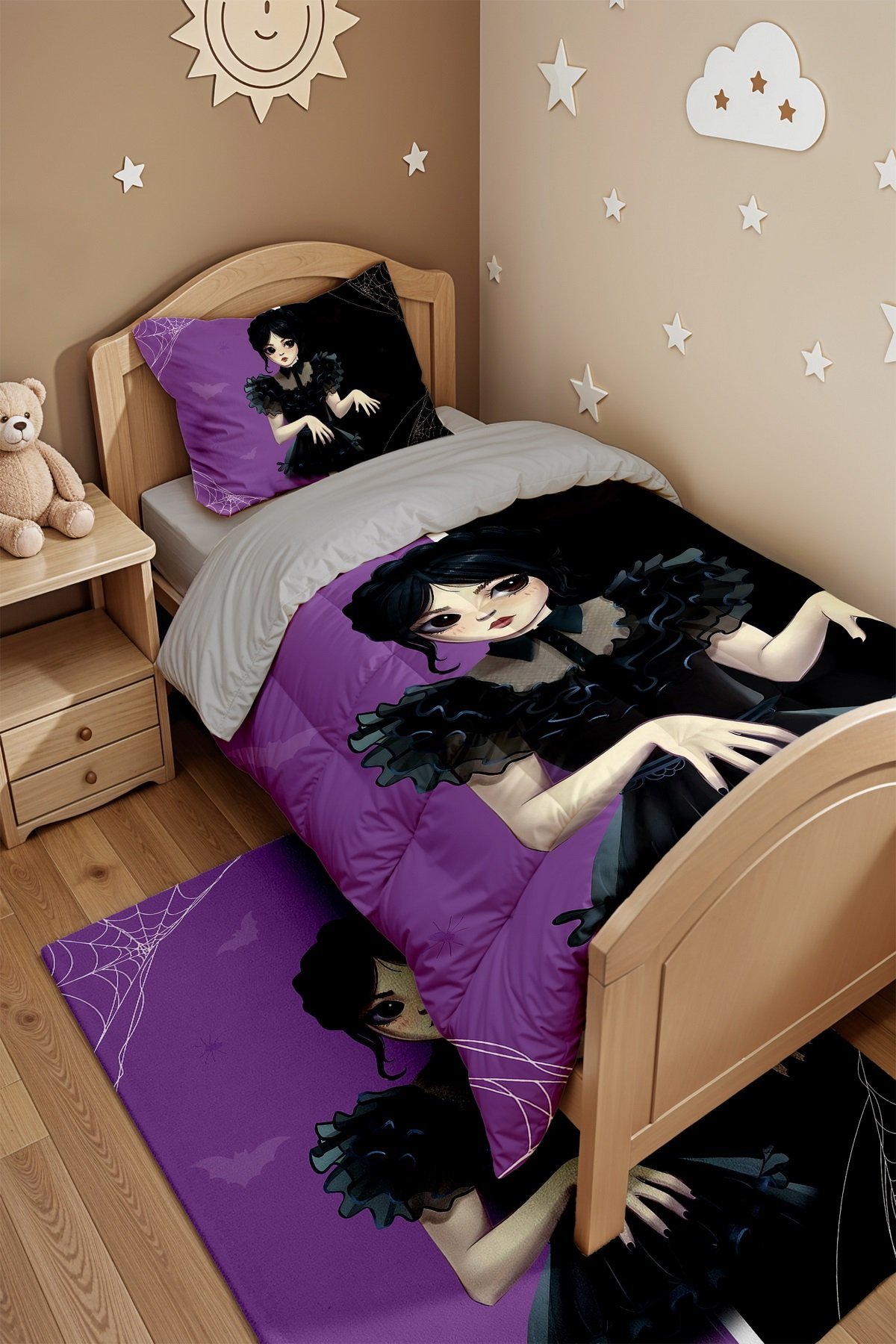 Mor Siyah Yarasalı Wednesday Addams Desenli Tek Kişilik Yorgan ve Yastık Kılıfı