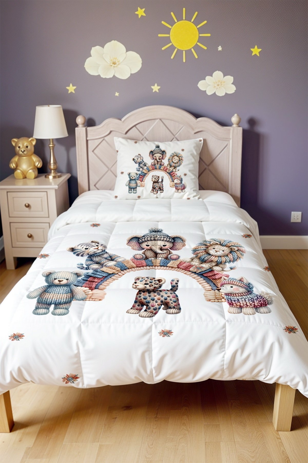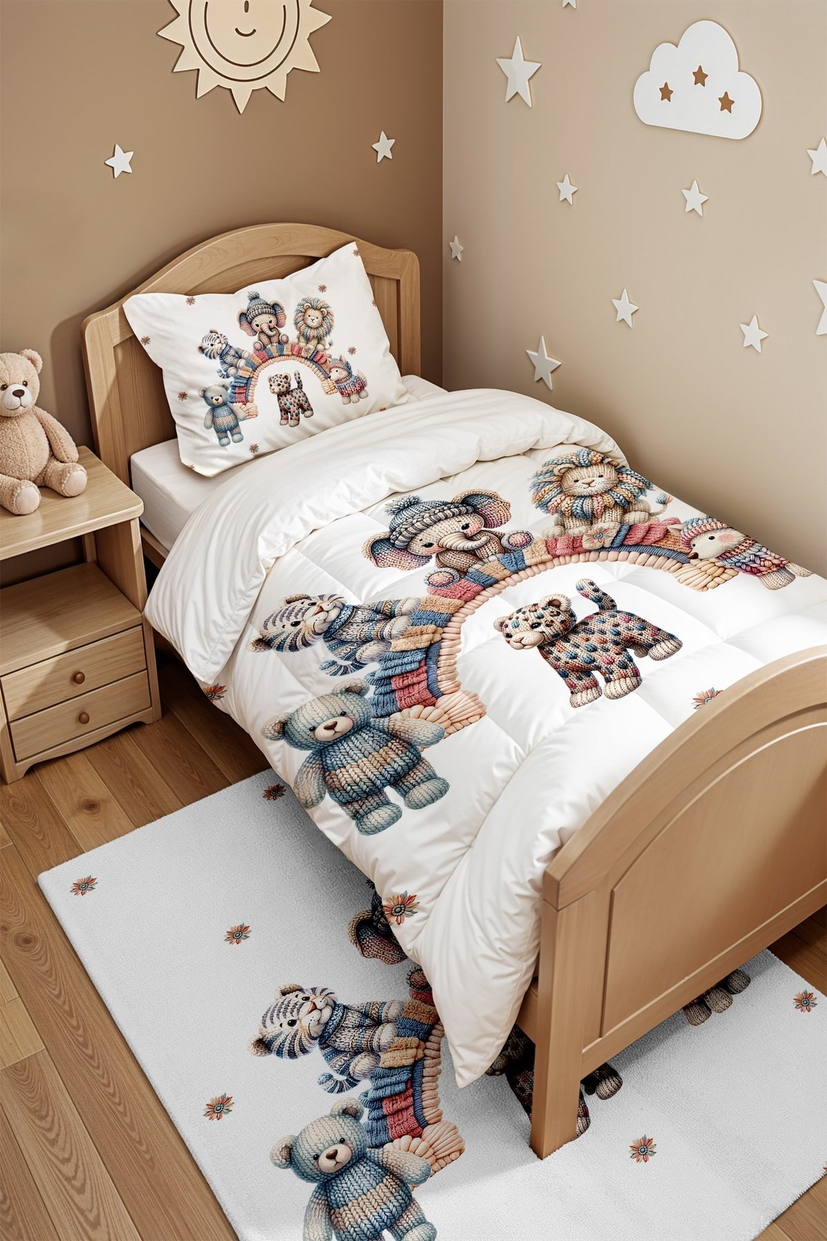 Örgü Gökkuşağı ve Safari Desenli Tek Kişilik Yorgan ve Yastık Kılıfı