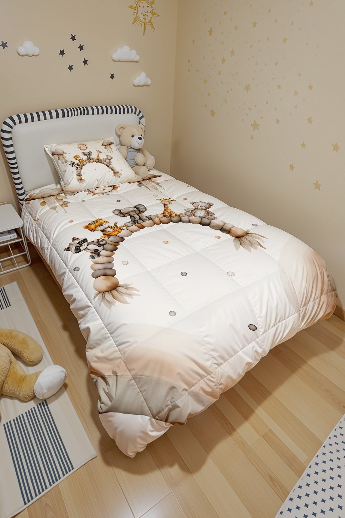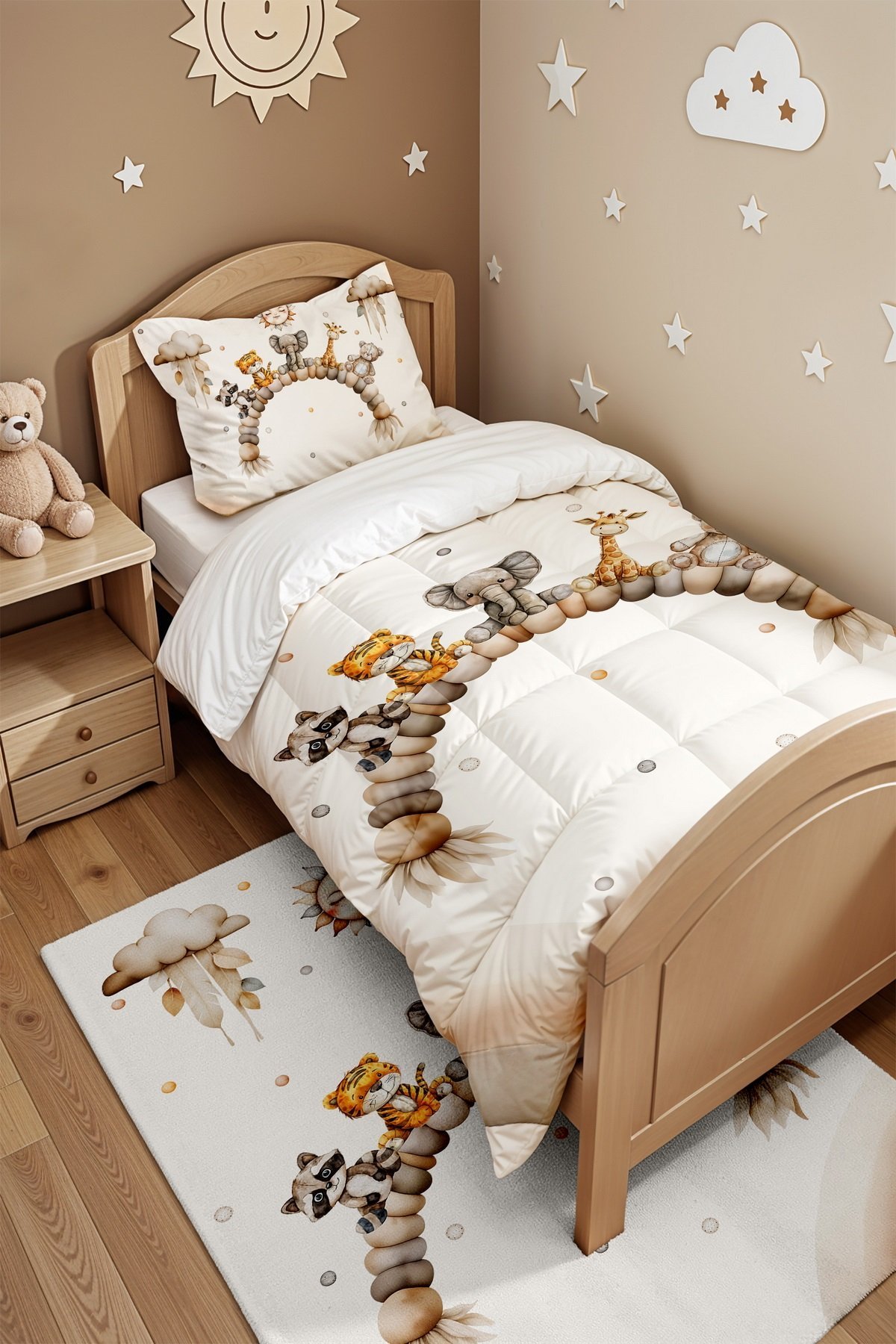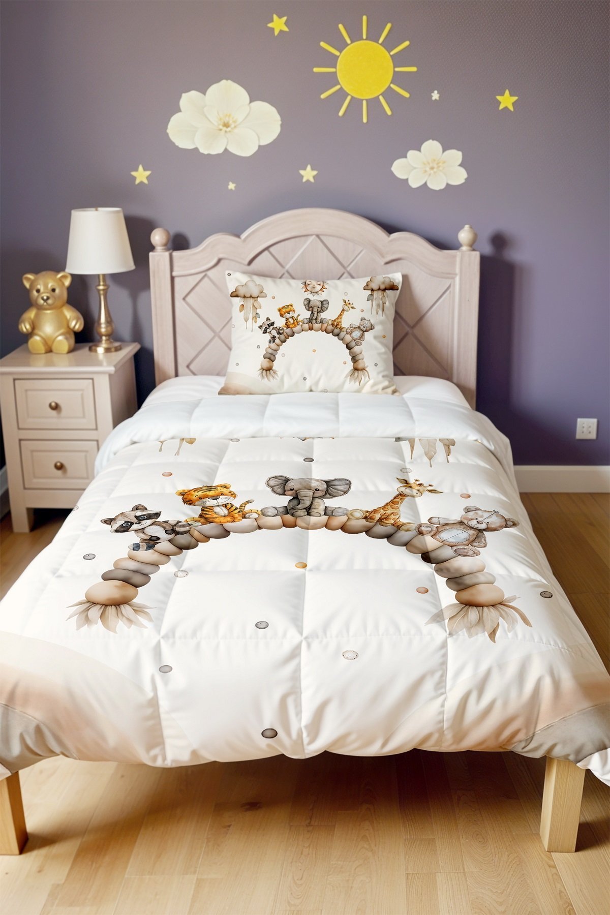 Oturan Sevimli Dostlar Desenli Tek Kişilik Yorgan ve Yastık Kılıfı