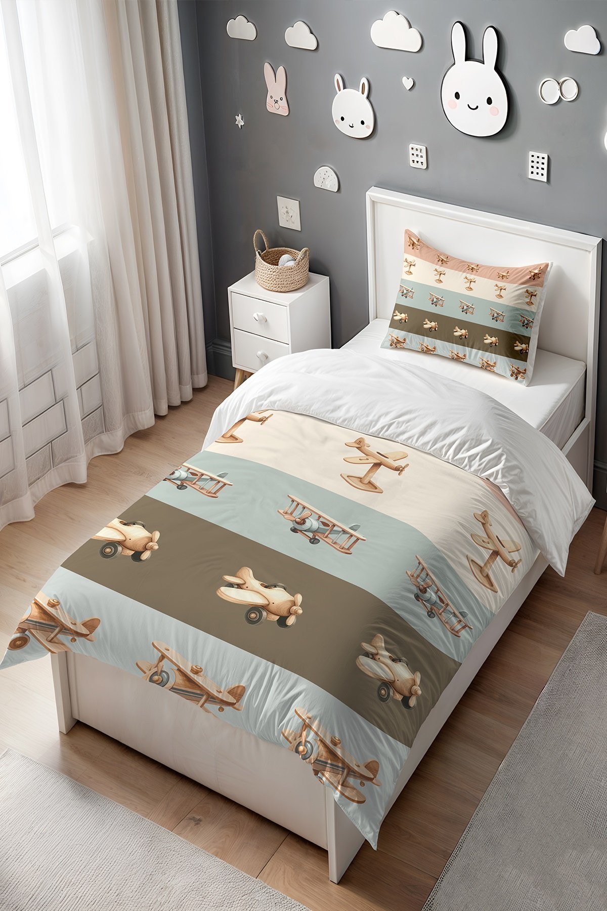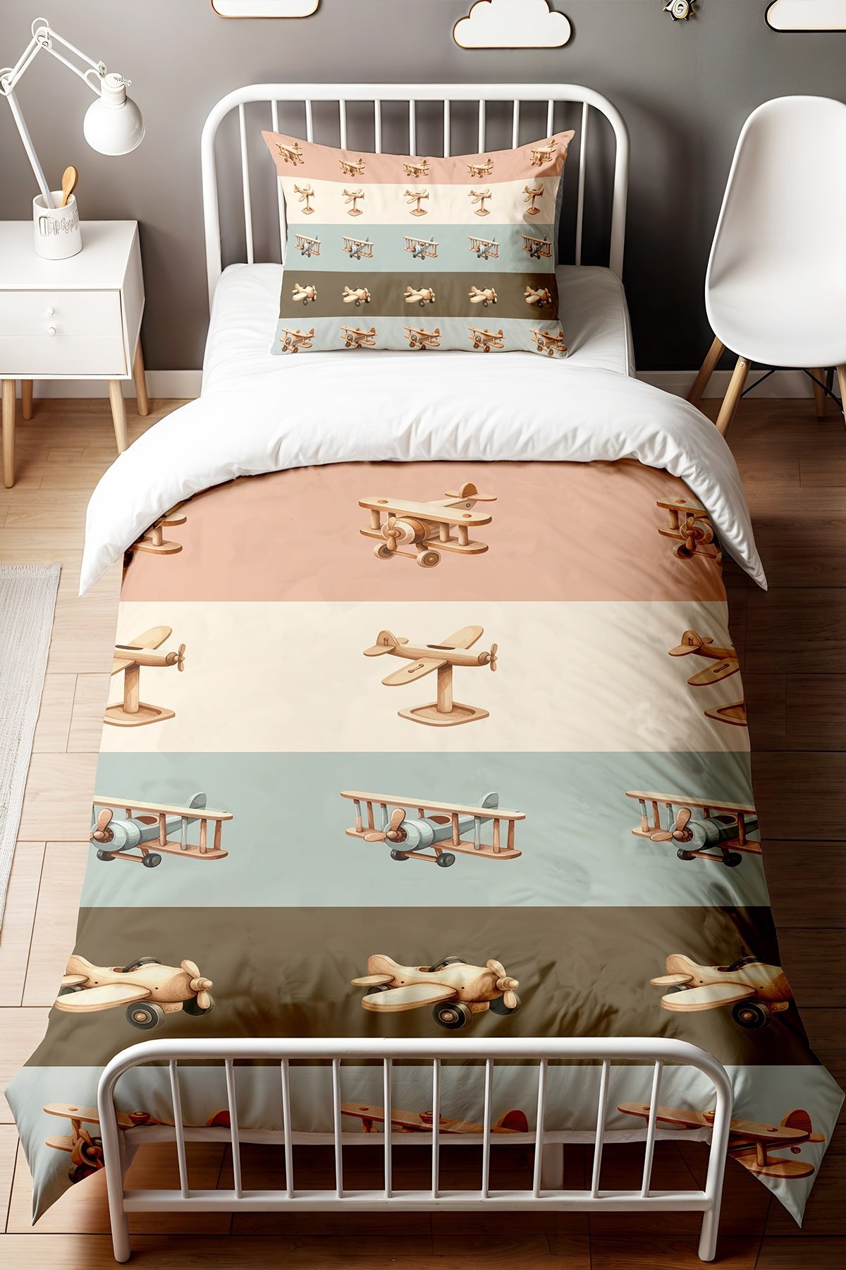 Oyuncak Şeritli Uçaklar Desenli Tek Kişilik Bebek Çocuk Nevresim Seti
