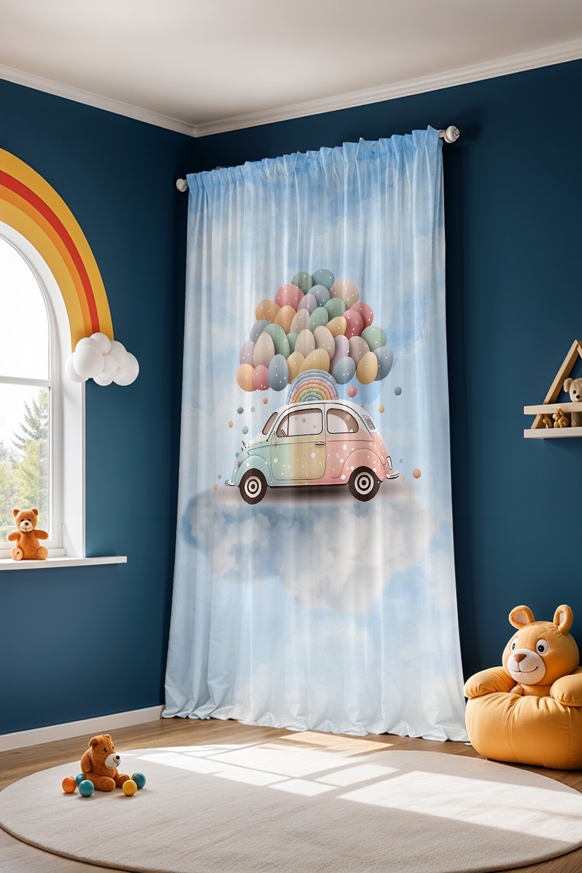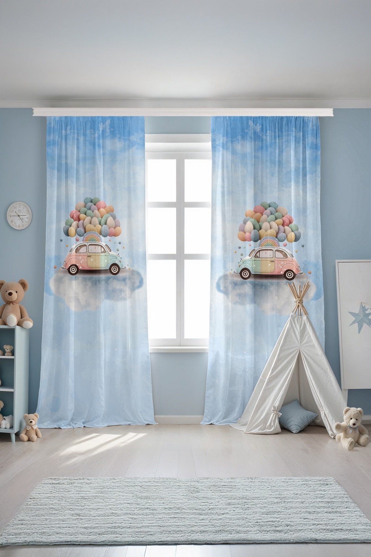 Pastel Araba Mavi Bulutlu Desenli Çocuk Bebek Odası Fon Perde (Tek Kanat Fiyatlandırma)