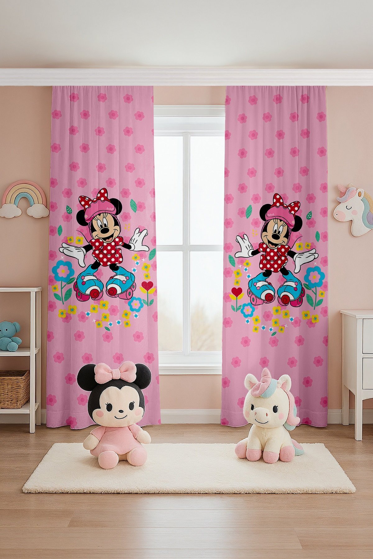 Patenci Minnie Desenli Çocuk Bebek Odası Fon Perde (Tek Kanat Fiyatlandırma)