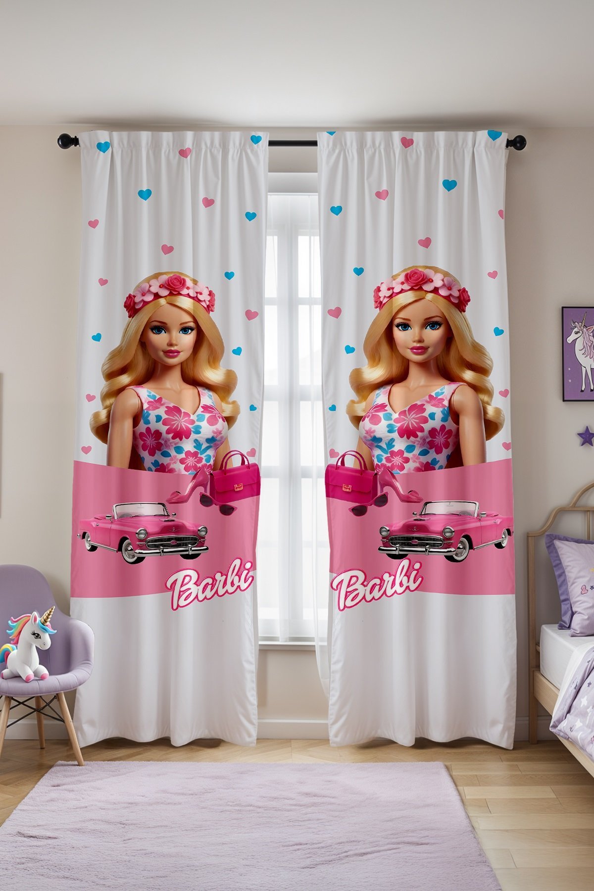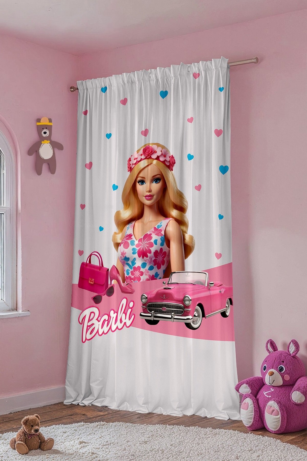 Pembe Arabalı Barbi Desenli Çocuk Bebek Odası Fon Perde (Tek Kanat Fiyatlandırma)