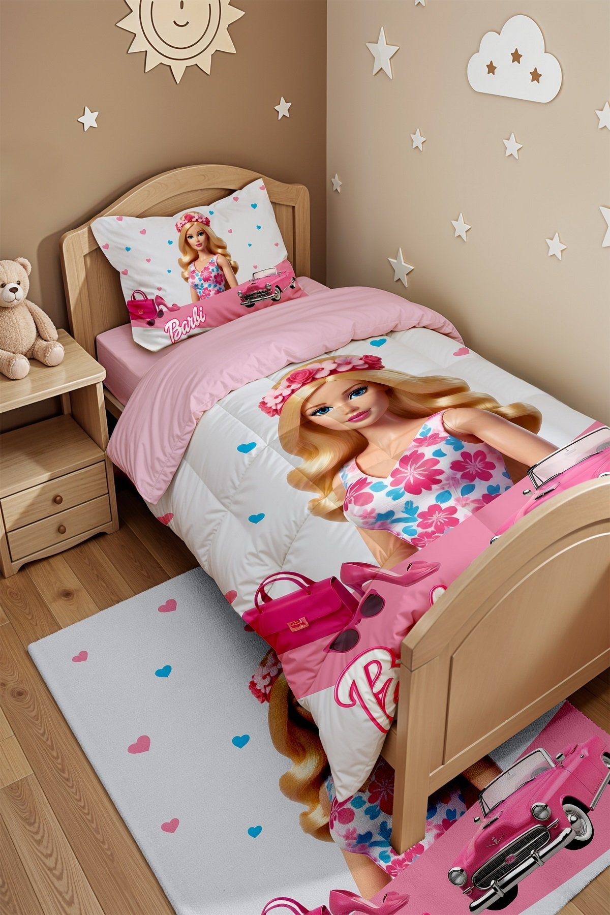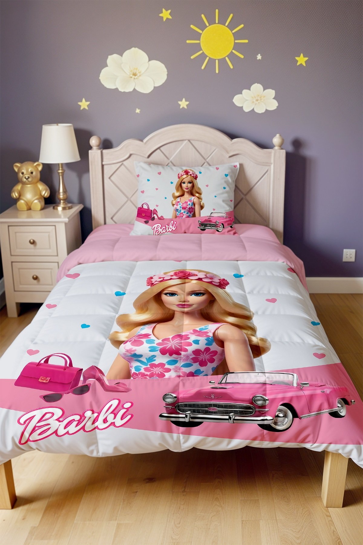 Pembe Arabalı Barbi Desenli Tek Kişilik Yorgan ve Yastık Kılıfı