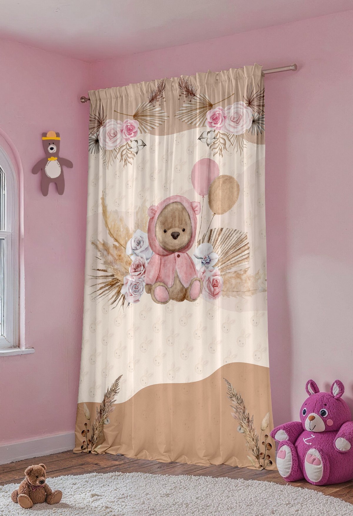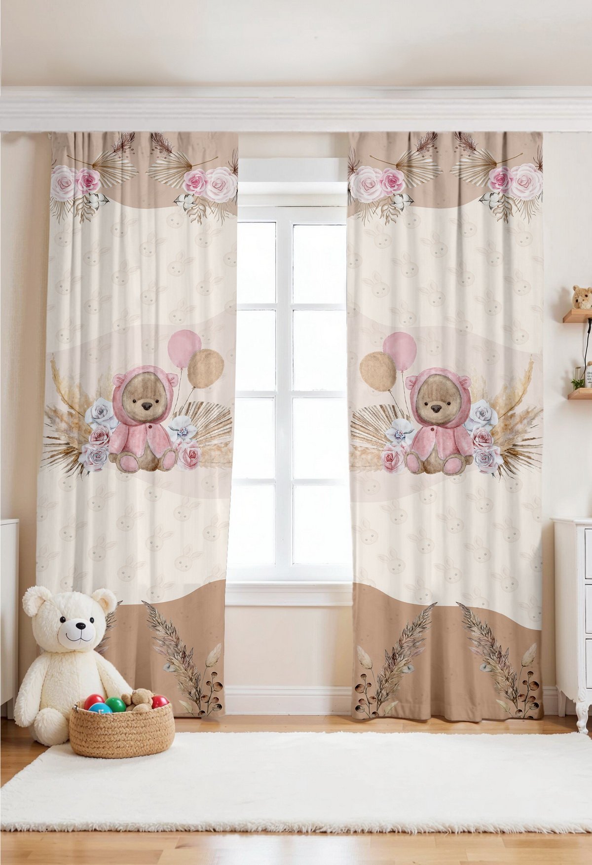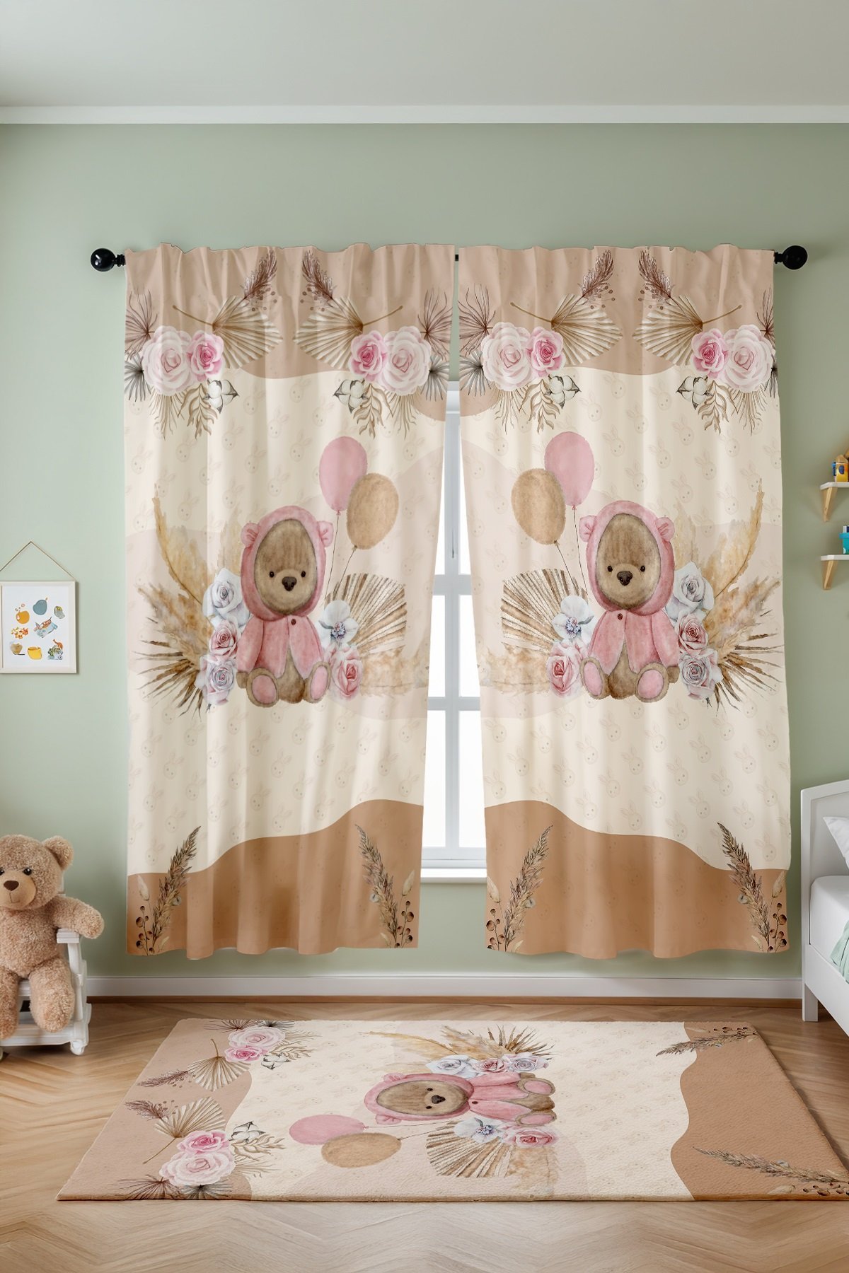 Pembe Ayıcık Desenli Çocuk Bebek Odası Fon Perde (Tek Kanat Fiyatlandırma)