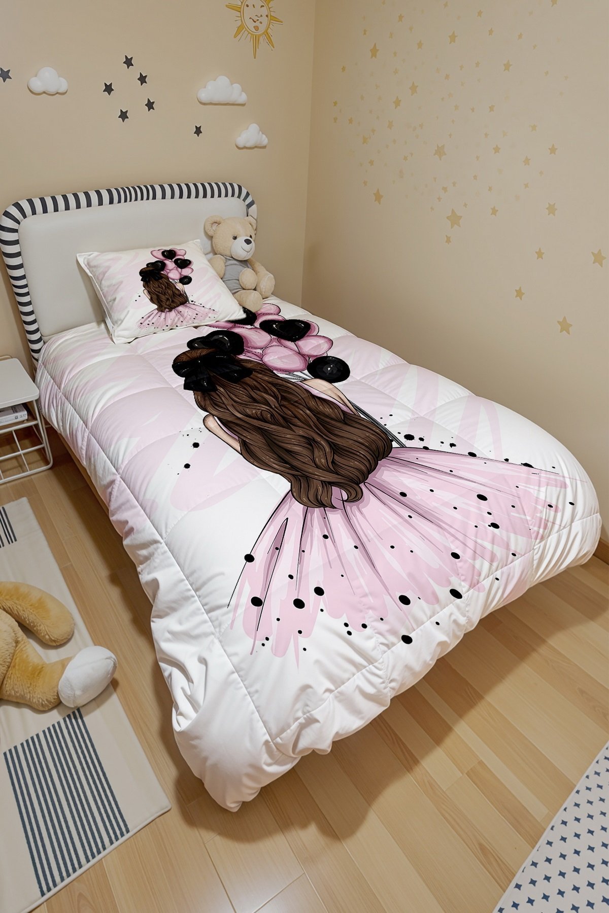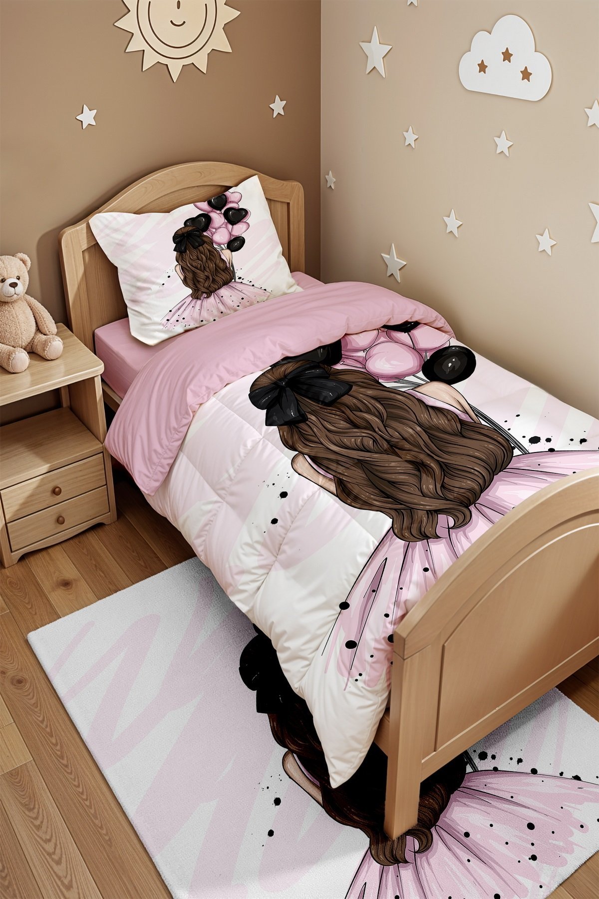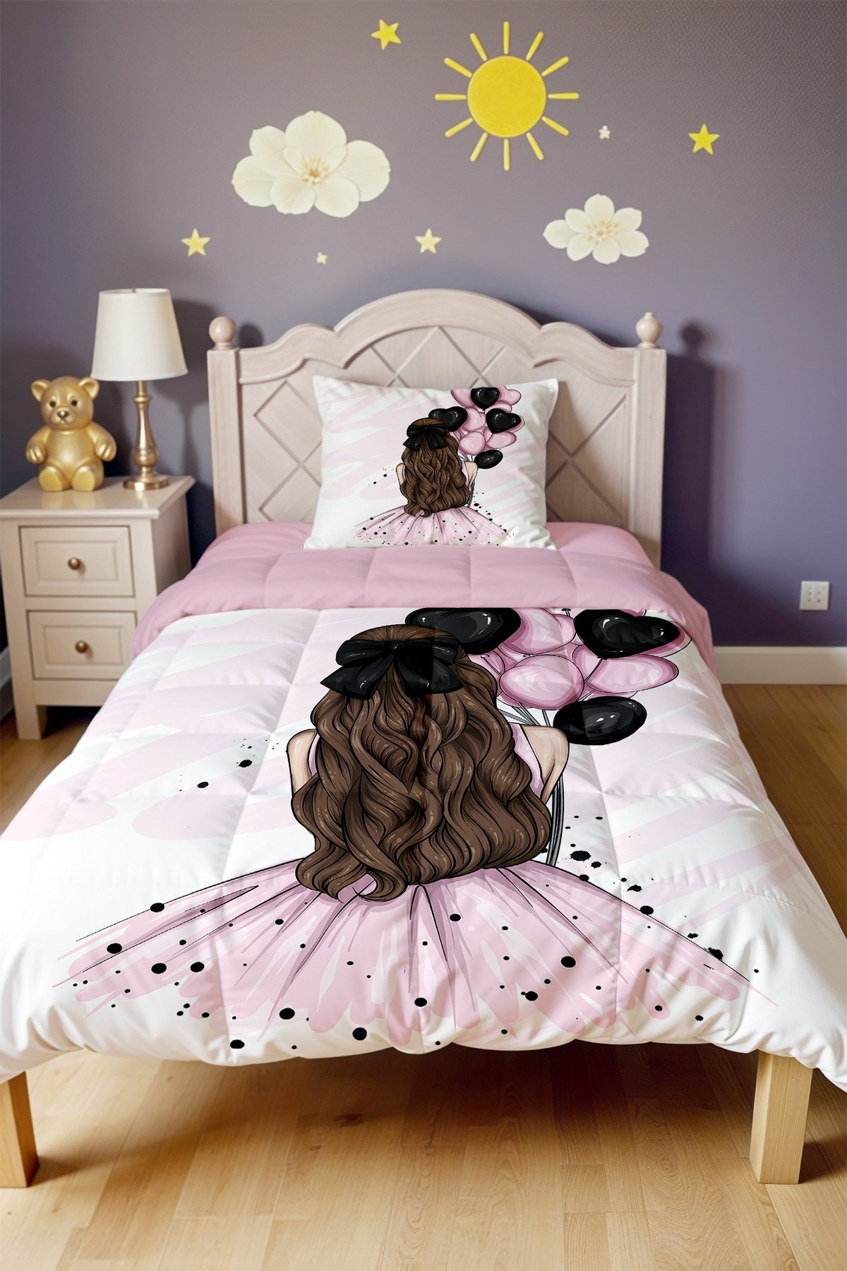 Pembe Balonlu Kız Desenli Tek Kişilik Yorgan ve Yastık Kılıfı