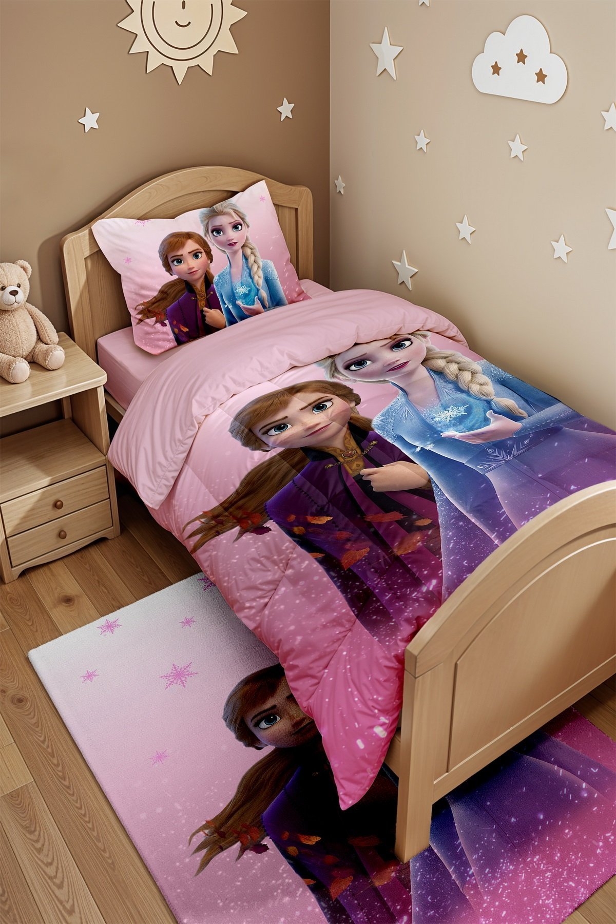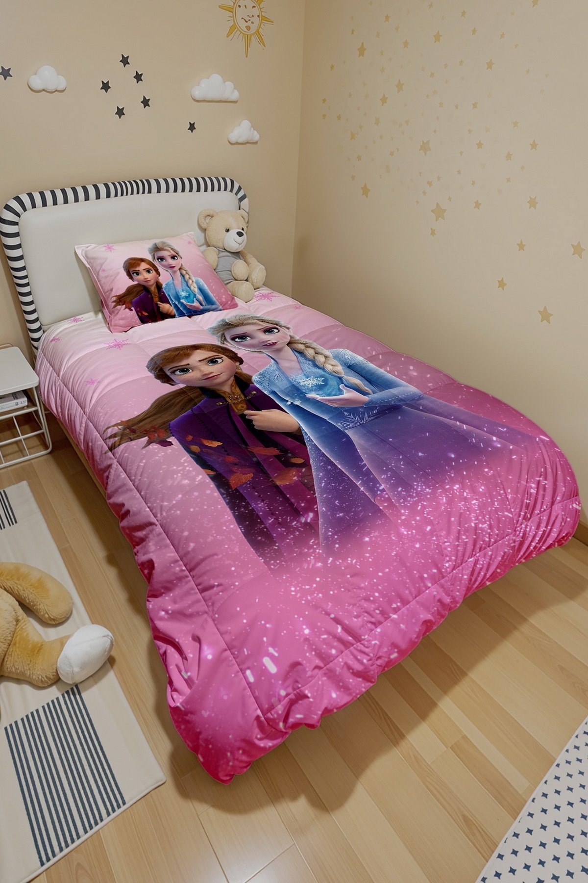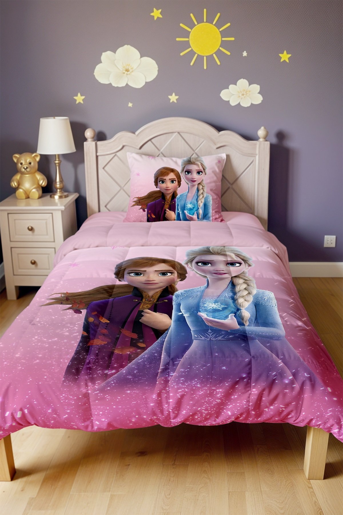 Pembe Elsa Ve Anna Desenli Tek Kişilik Yorgan ve Yastık Kılıfı