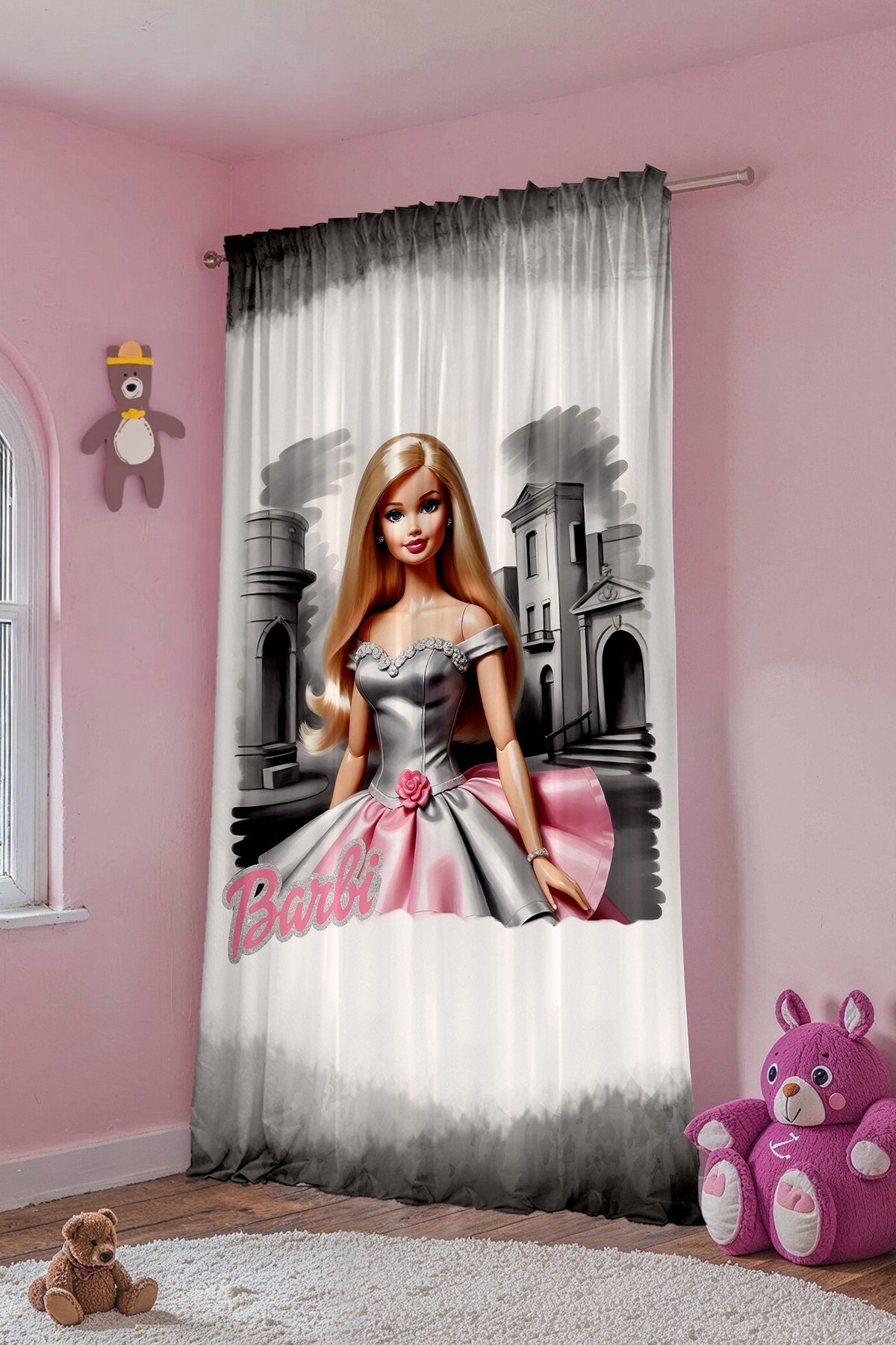 Pembe Etekli Barbi Desenli Çocuk Bebek Odası Fon Perde (Tek Kanat Fiyatlandırma)