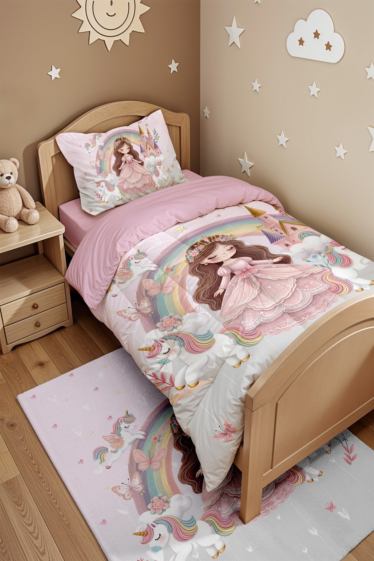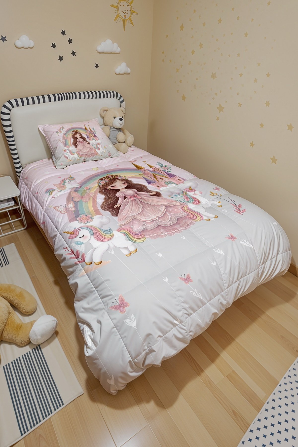 Pembe Gri Unicornlu Prenses Desenli Tek Kişilik Yorgan ve Yastık Kılıfı