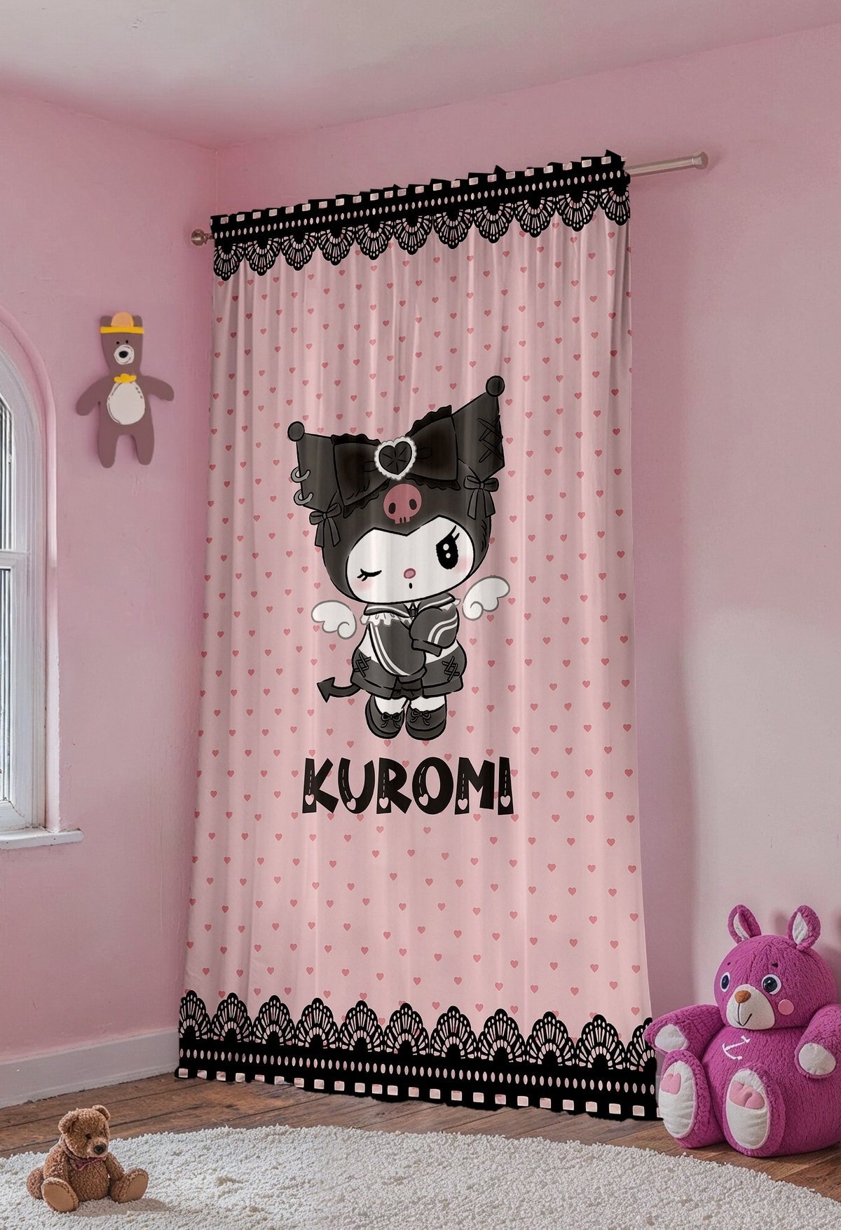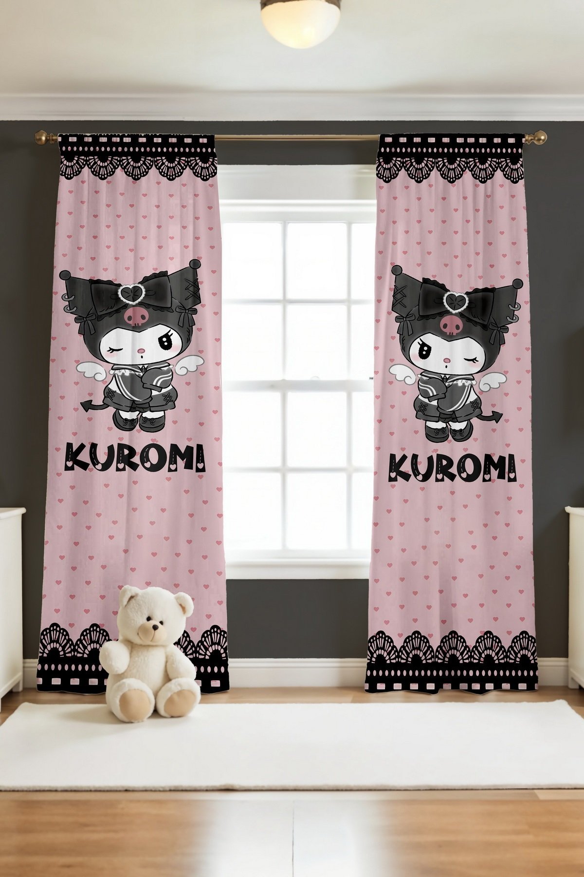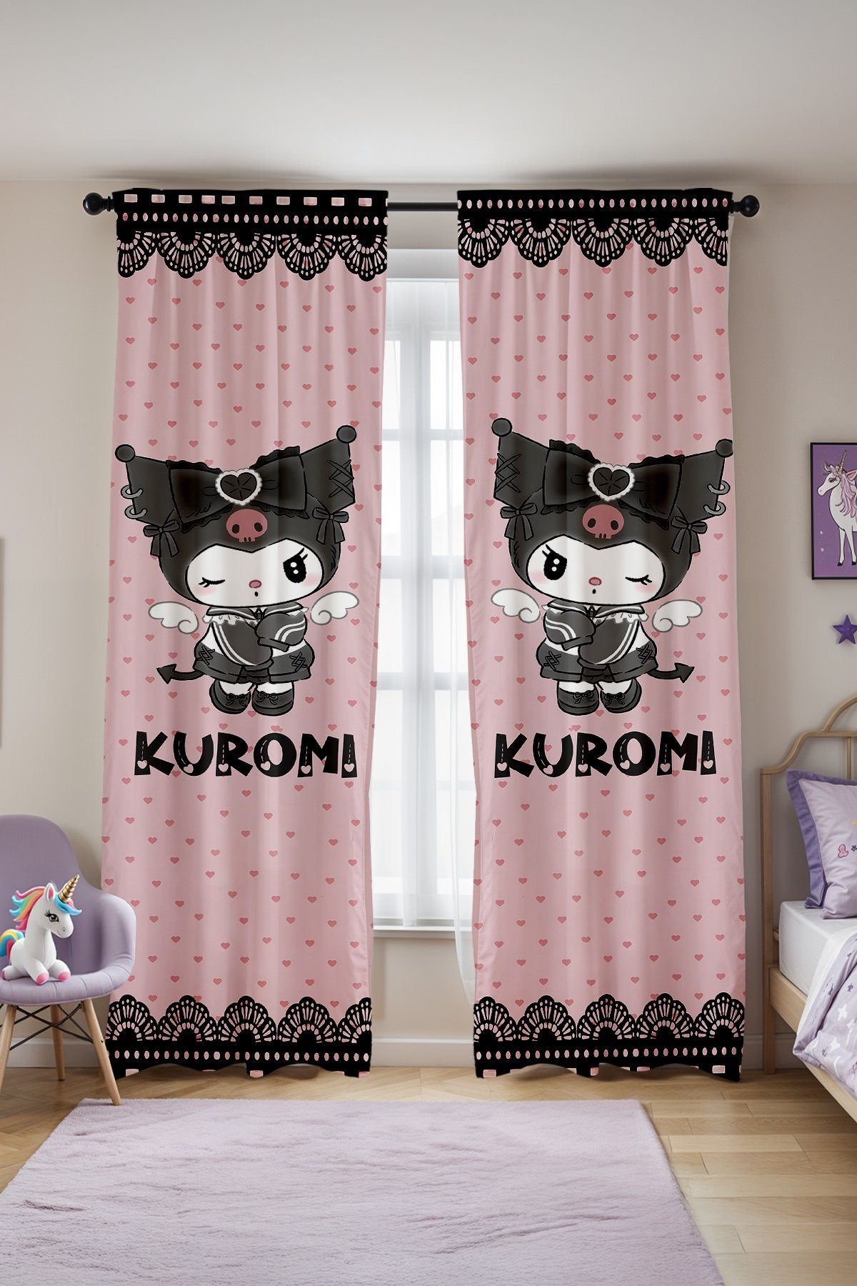 Pembe Kalpler ve Kuromi Desenli Çocuk Bebek Odası Fon Perde (Tek Kanat Fiyatlandırma)