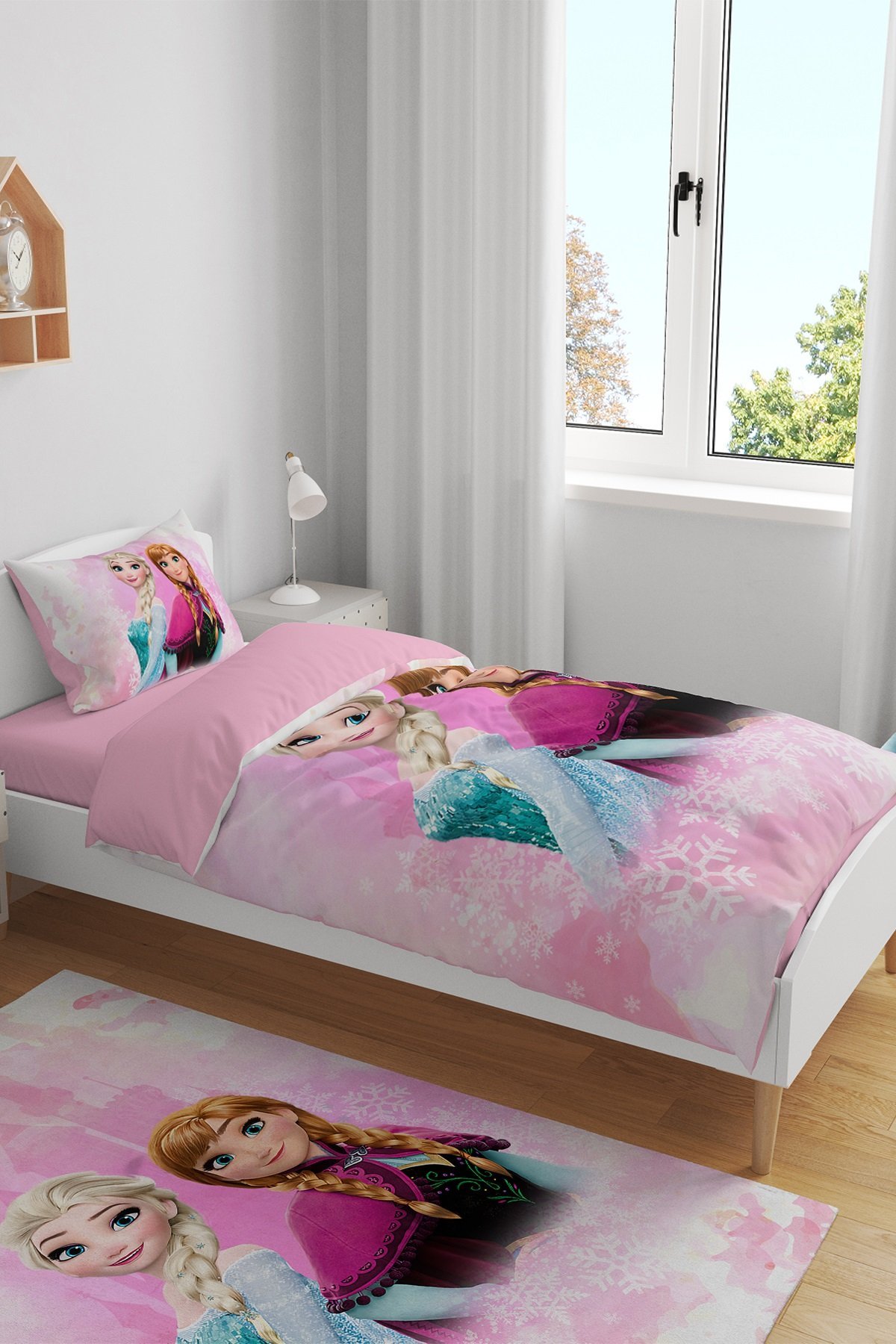 Pembe Kar Kristalli Elsa ve Anna Desenli Tek Kişilik Bebek Çocuk Nevresim Takımı