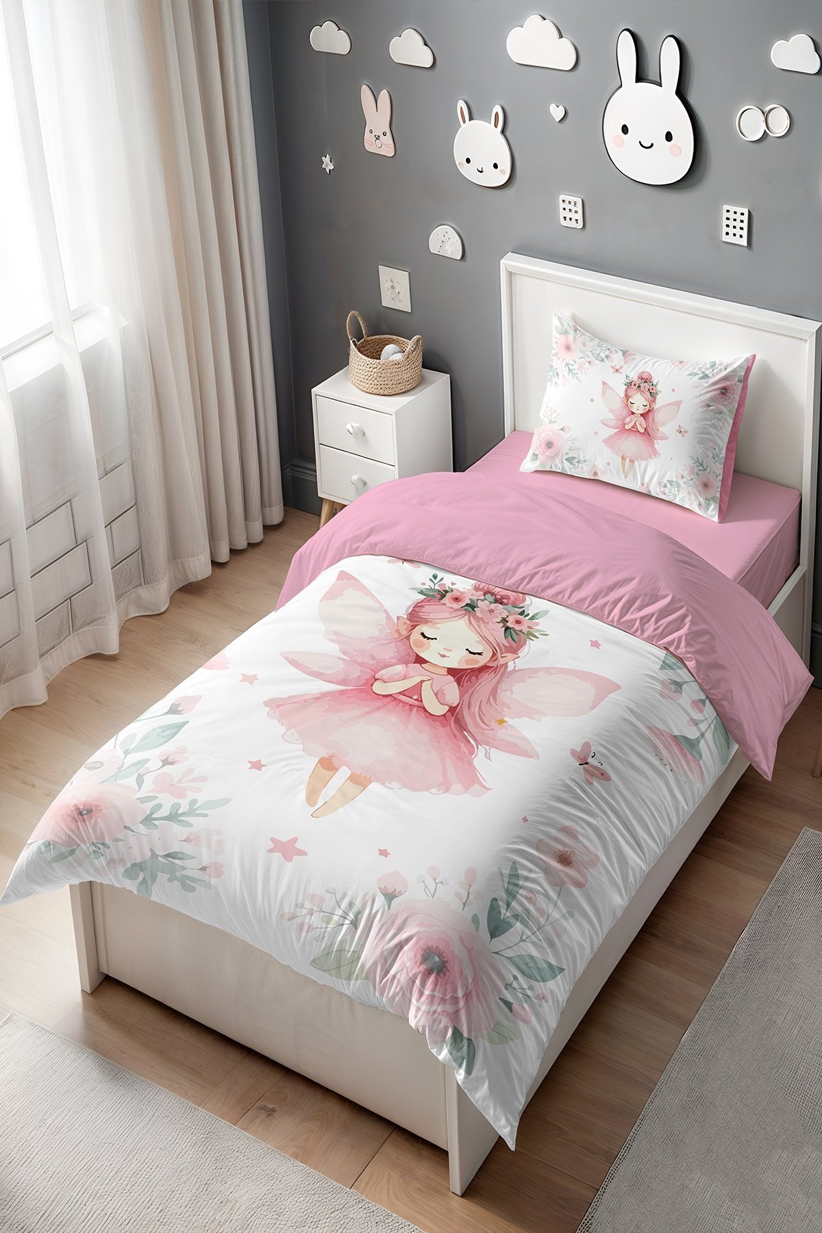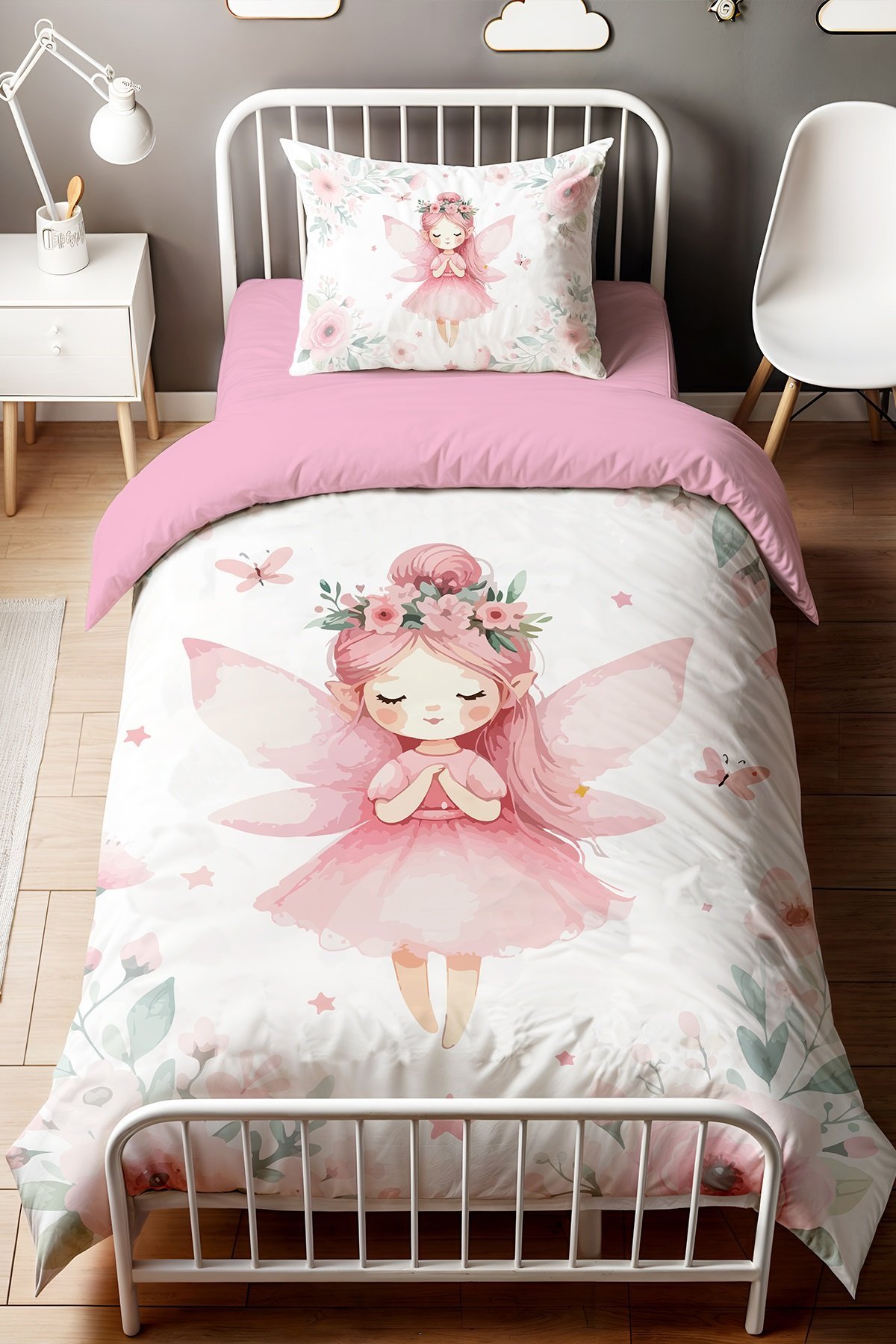 Pembe Kelebekli Peri Kızı Desenli Tek Kişilik Bebek Çocuk Nevresim Seti