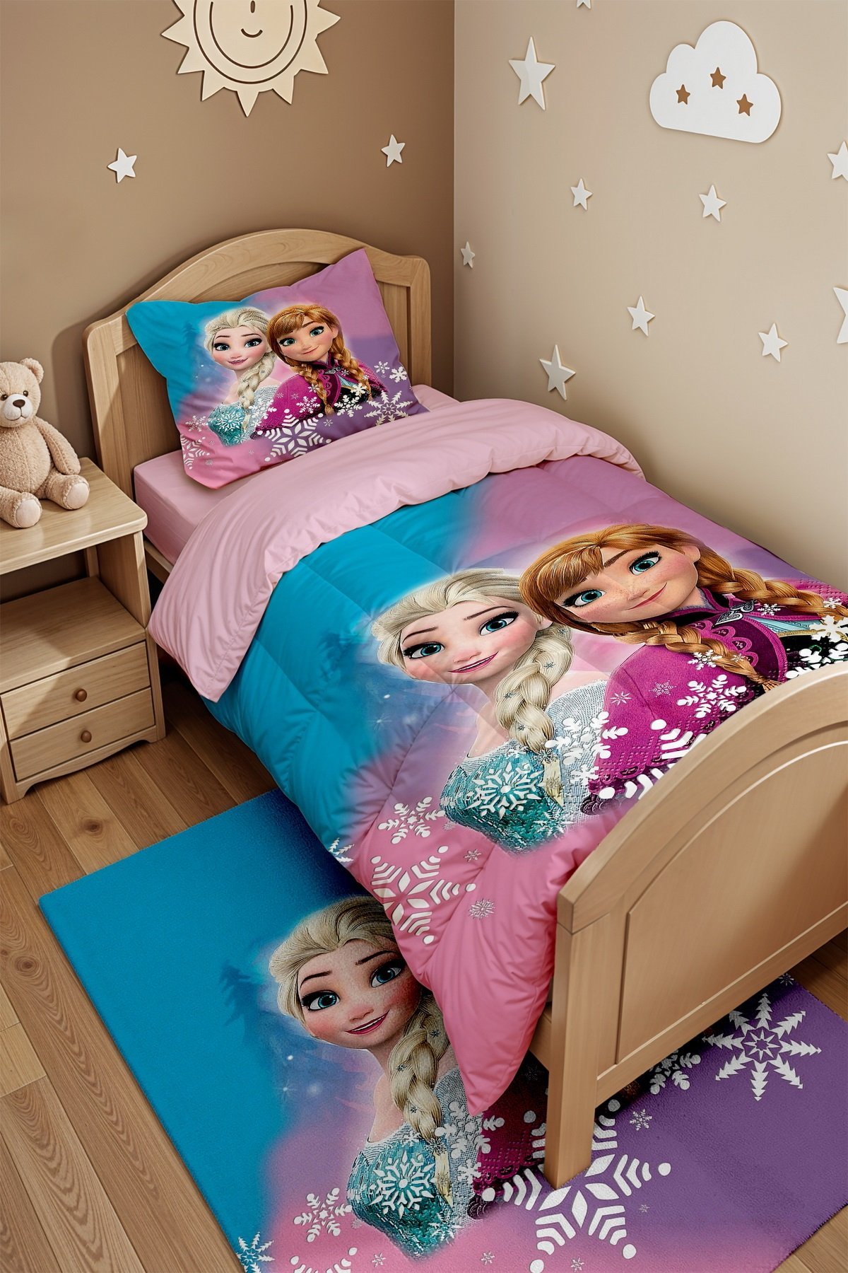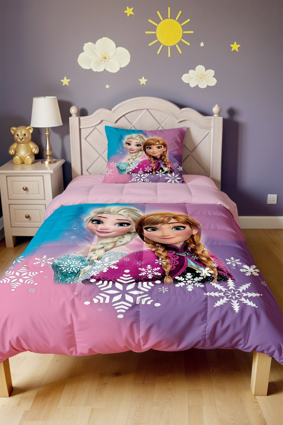 Pembe Mavi Elsa Desenli Tek Kişilik Yorgan ve Yastık Kılıfı
