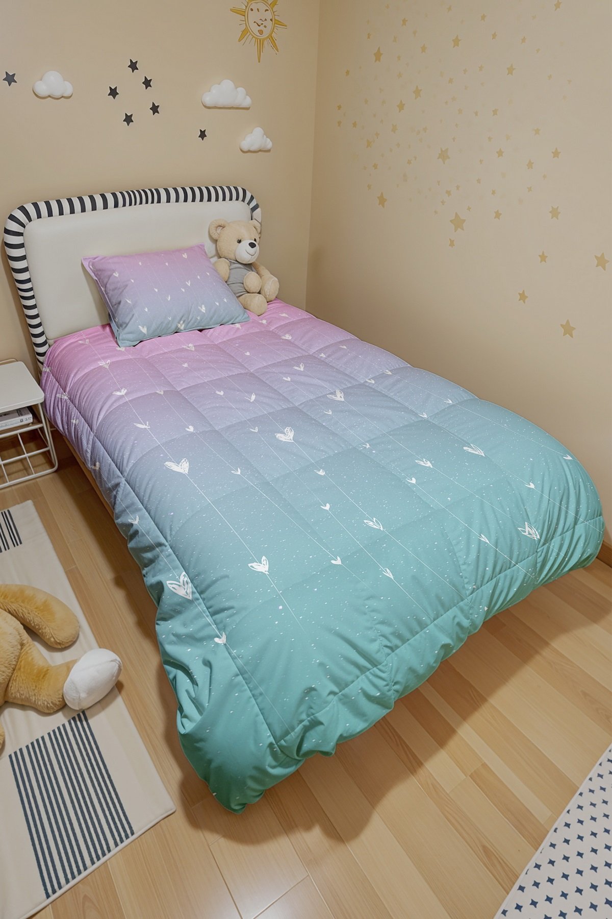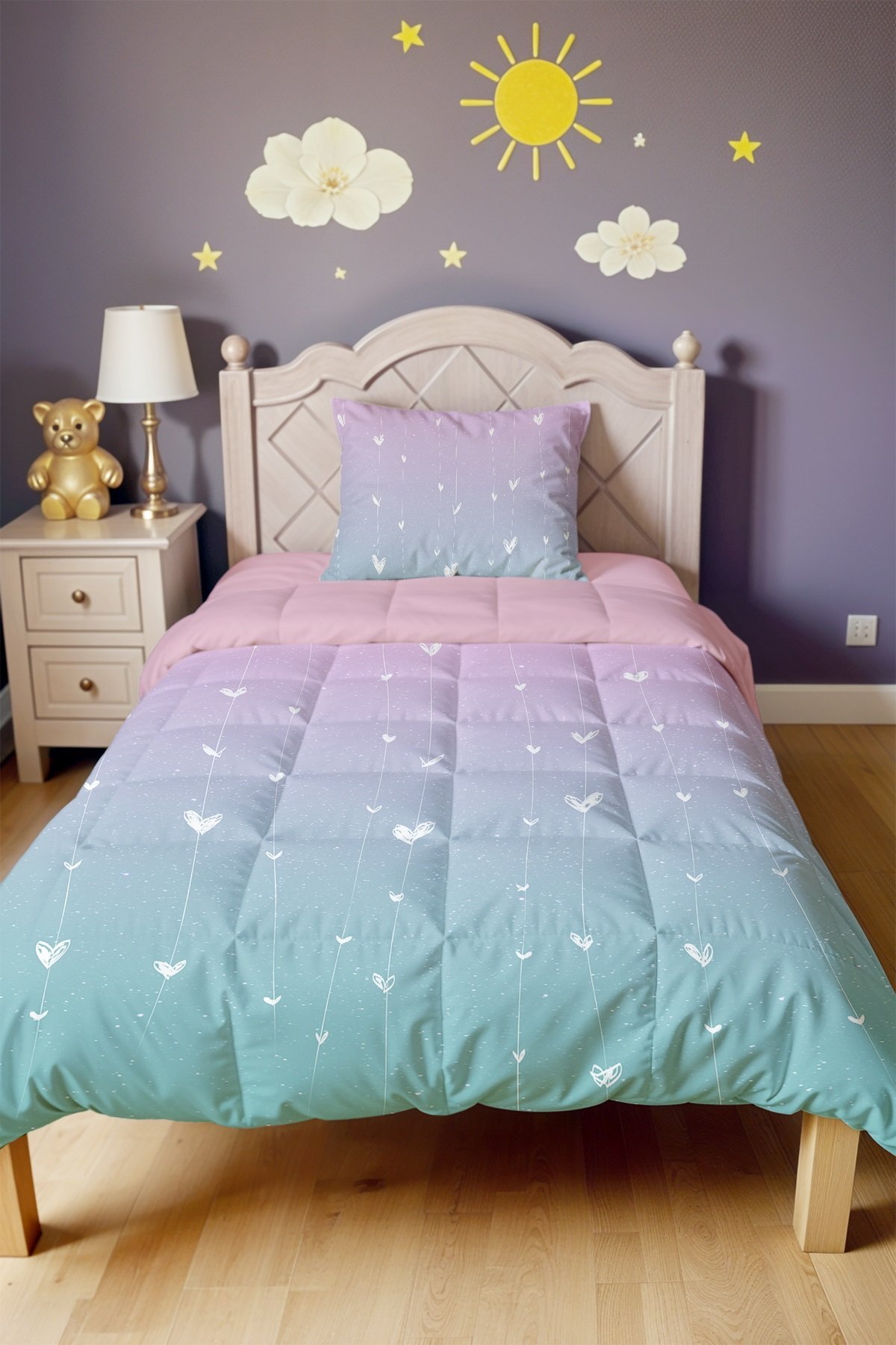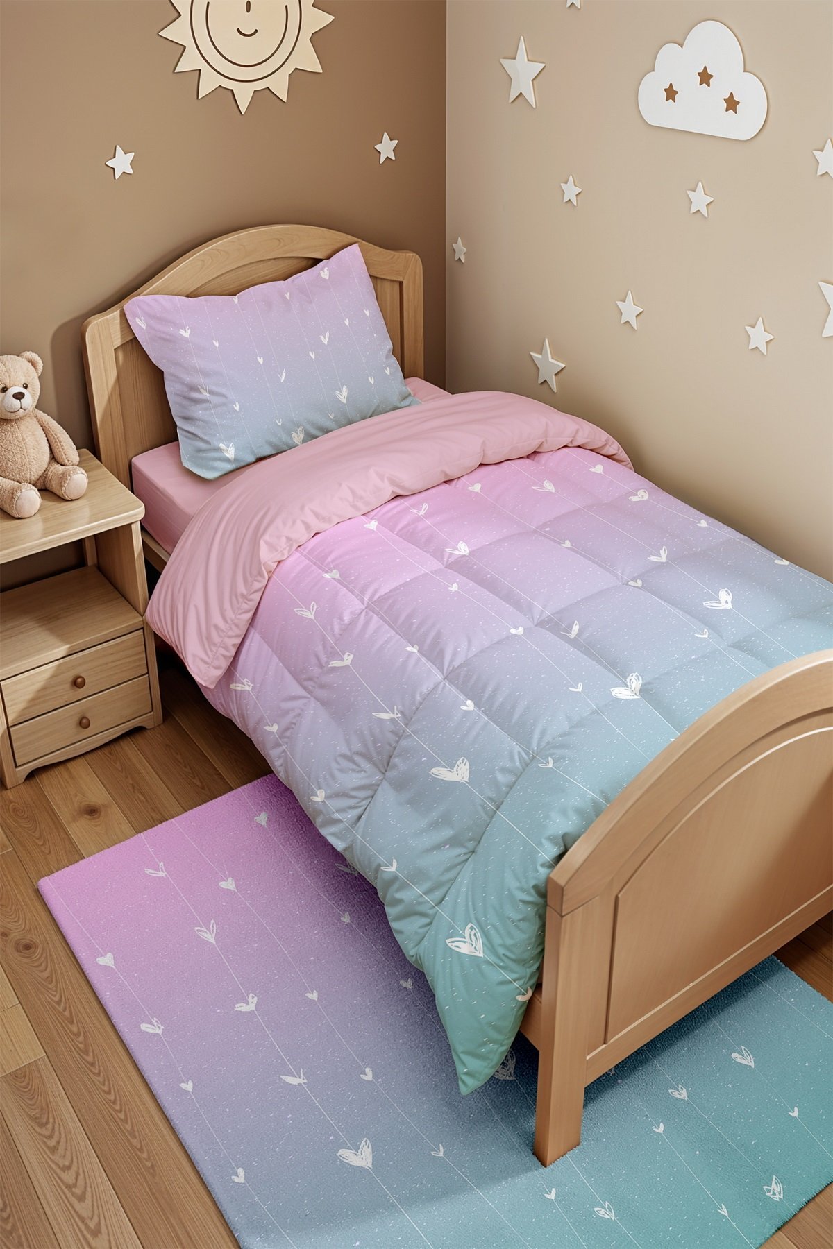 Pembe Mavi Kalpler Desenli Tek Kişilik Yorgan ve Yastık Kılıfı