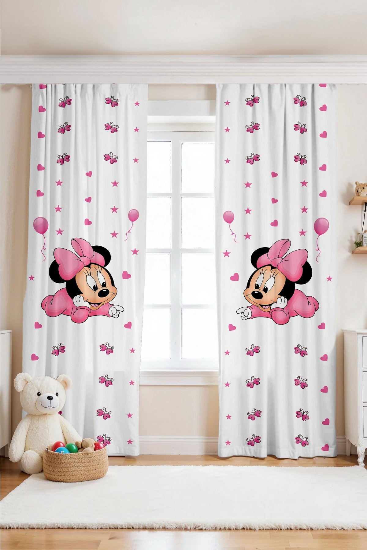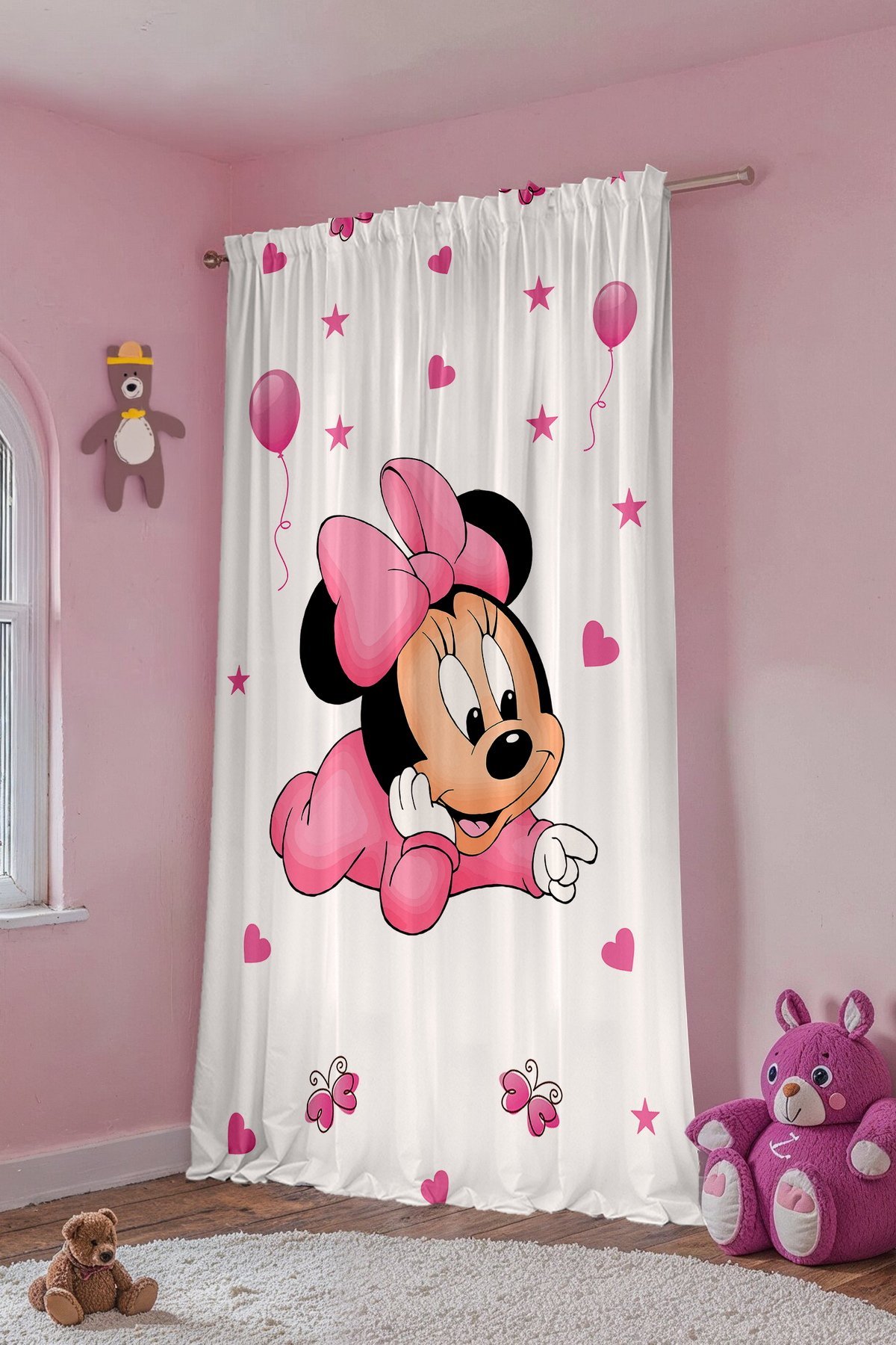 Pembe Minnie Desenli Çocuk Bebek Odası Fon Perde (Tek Kanat Fiyatlandırma)