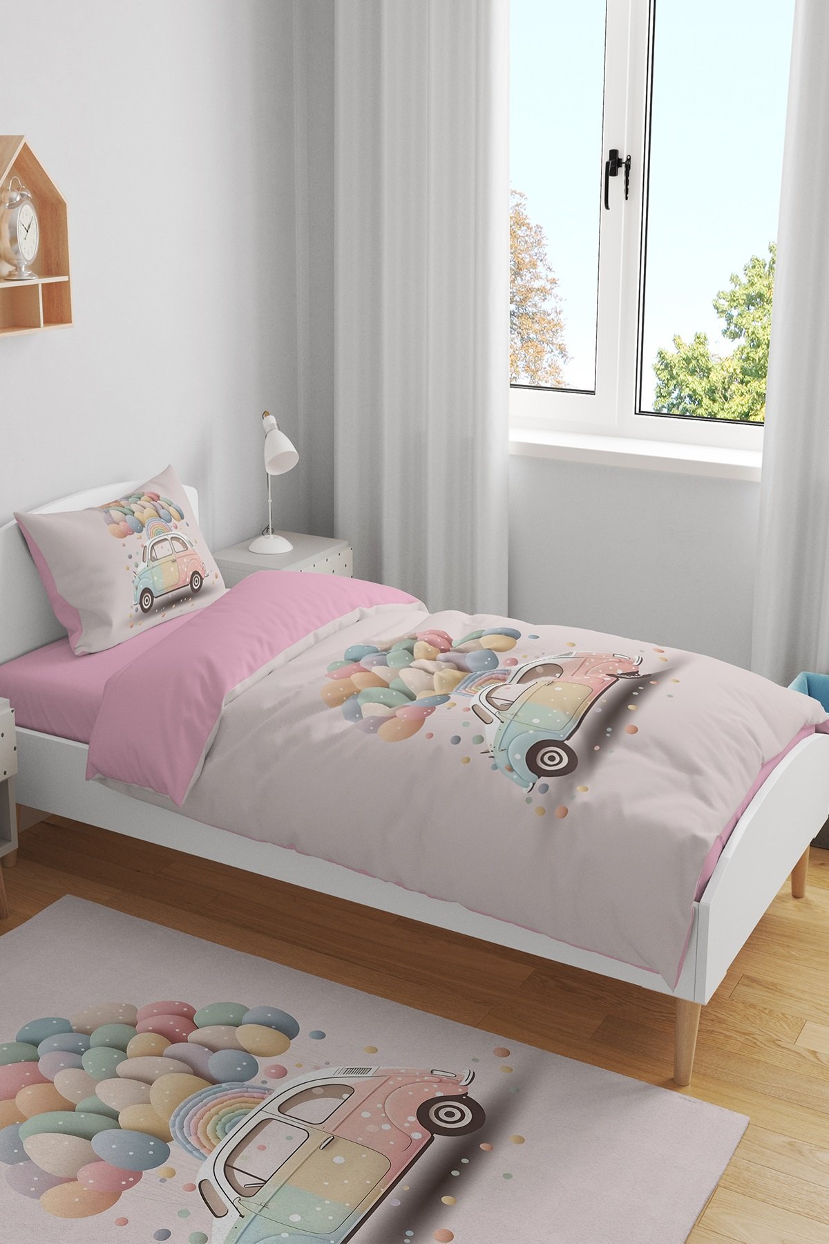 Pembe Pastel Araba Desenli Tek Kişilik Bebek Çocuk Nevresim Seti