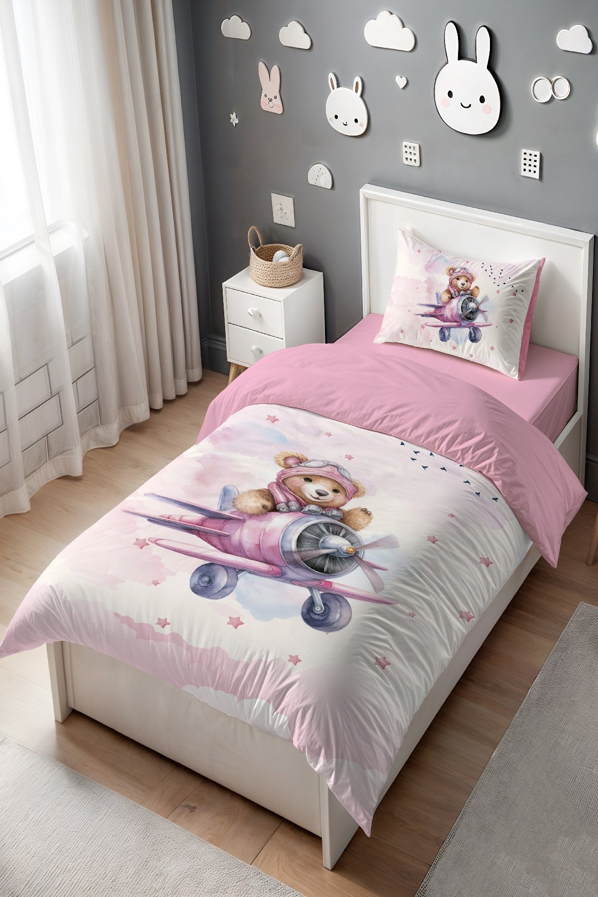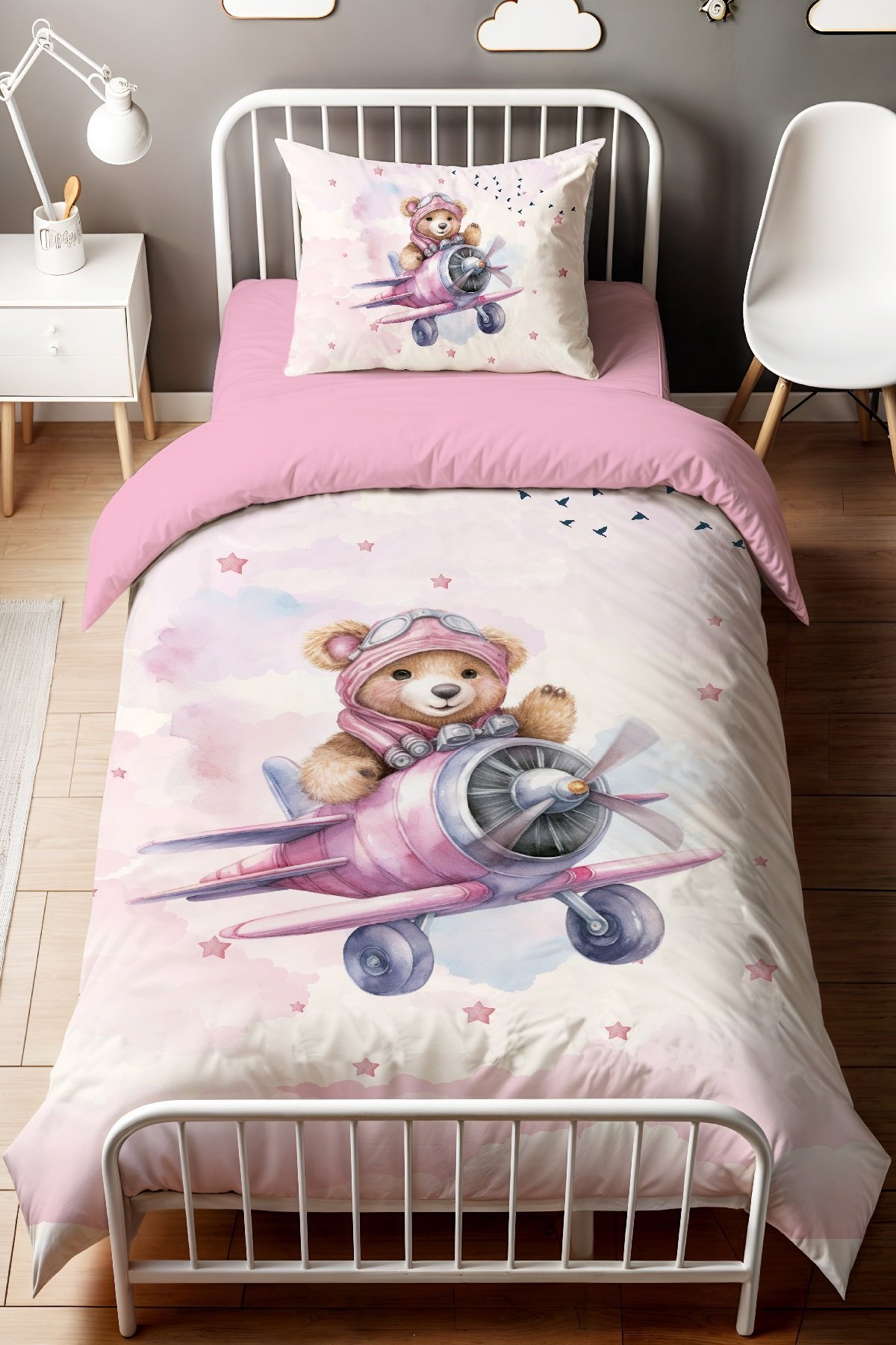 Pembe Pilot Ayıcık Desenli Tek Kişilik Bebek Çocuk Nevresim Seti