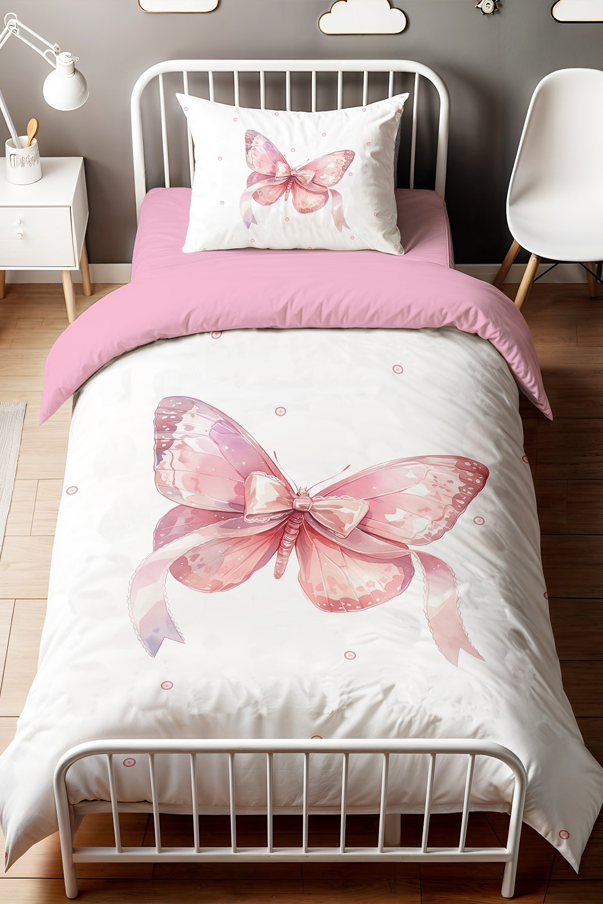 Pembe Puantiyeli Kelebek Desenli Tek Kişilik Bebek Çocuk Nevresim Seti