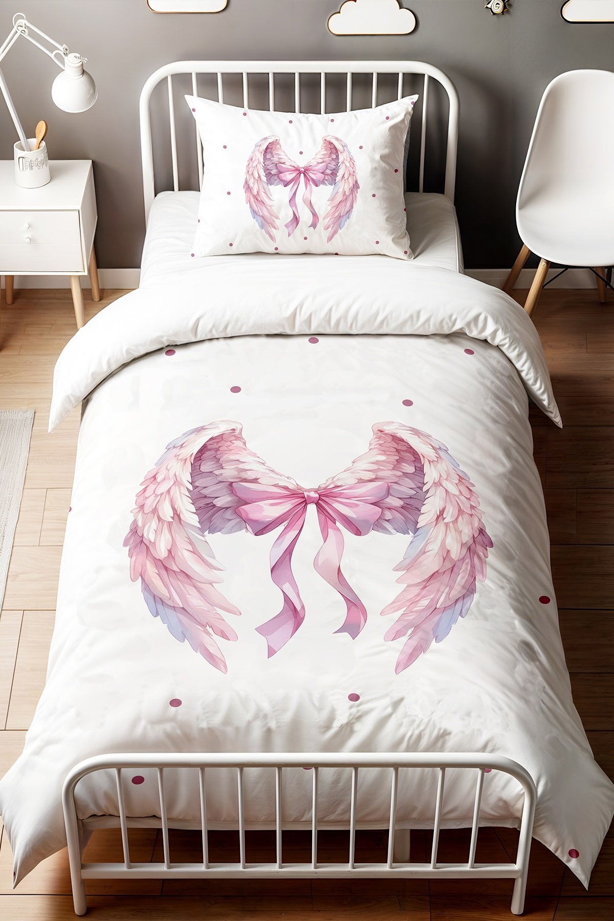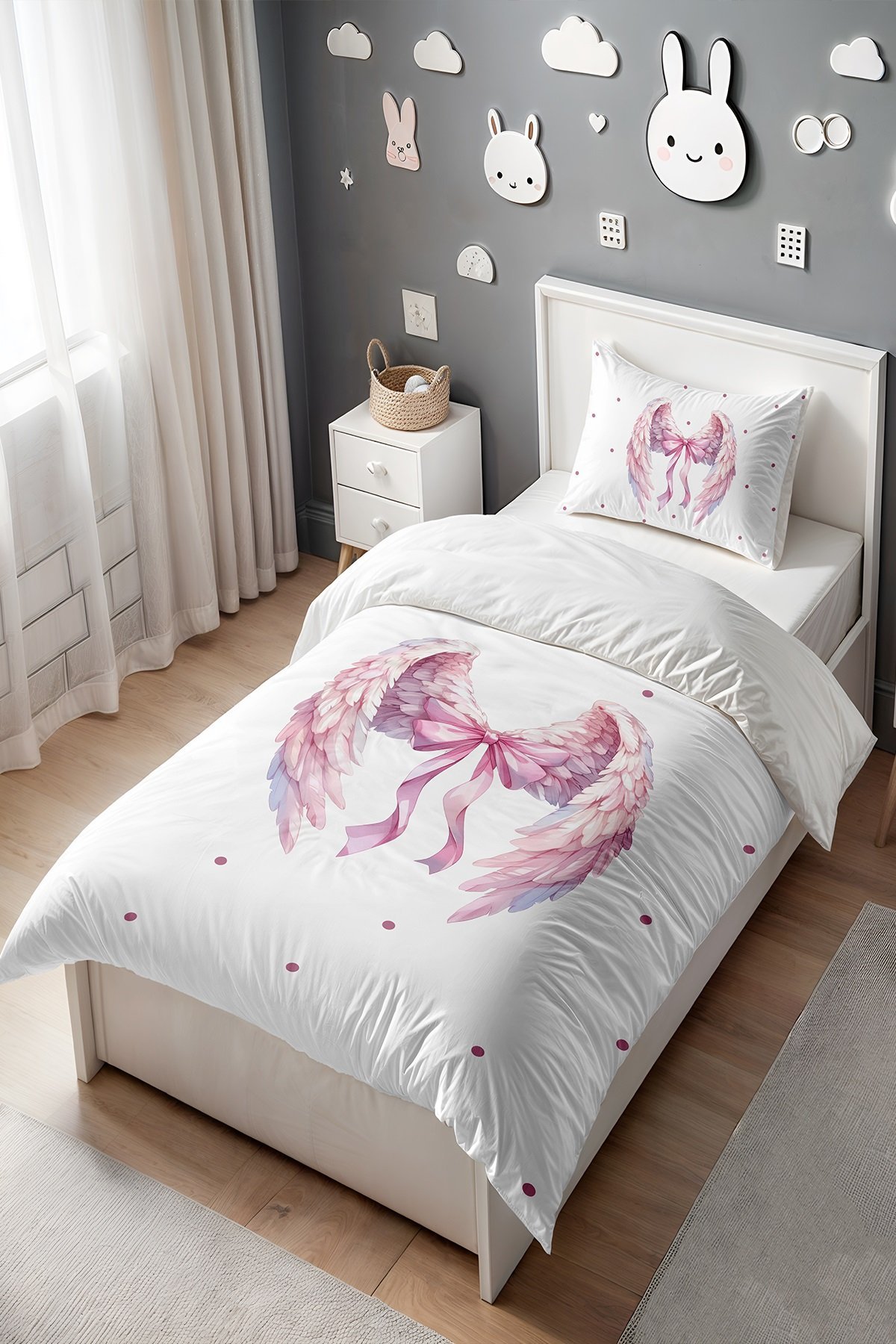 Pembe Puantiyeli Peri Kanadı Desenli Tek Kişilik Bebek Çocuk Nevresim Seti
