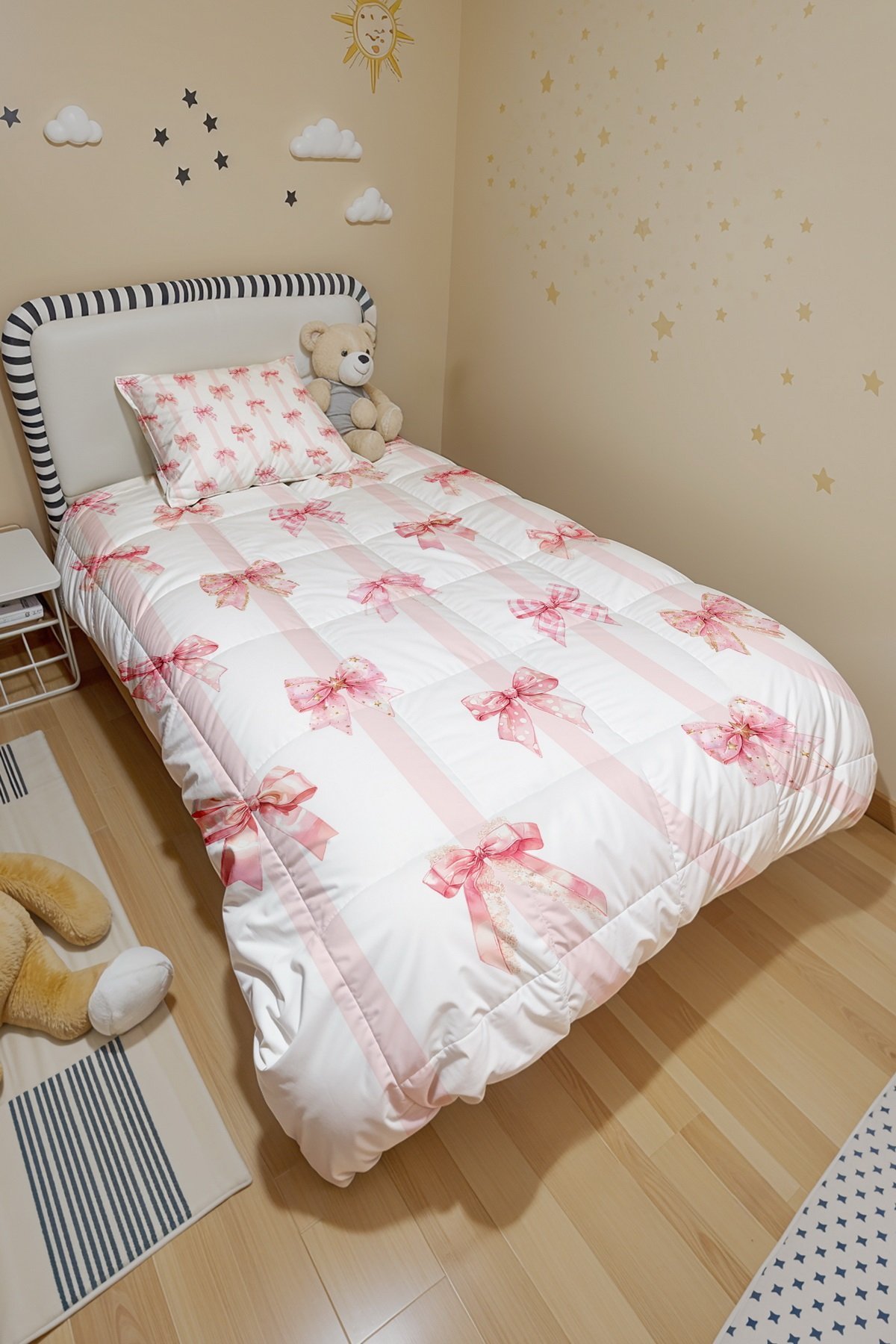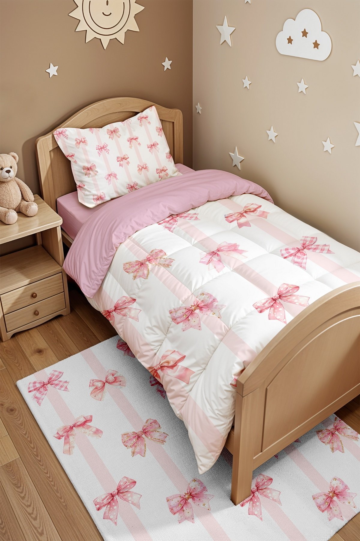 Pembe Şeritli Fiyonklar Desenli Tek Kişilik Yorgan ve Yastık Kılıfı