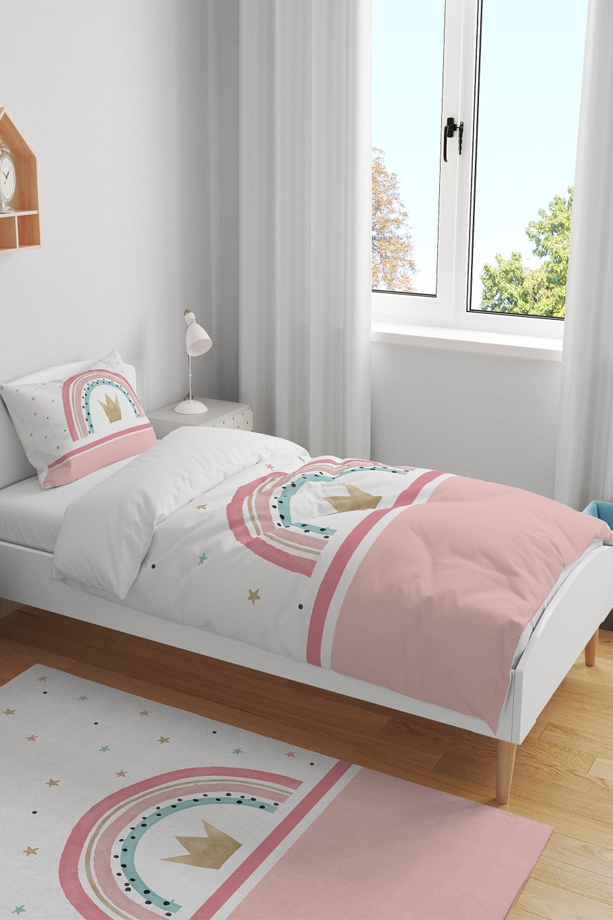 Pembe Şeritli Yıldızlı Kral Taçı Desenli Tek Kişilik Bebek Çocuk Nevresim Seti