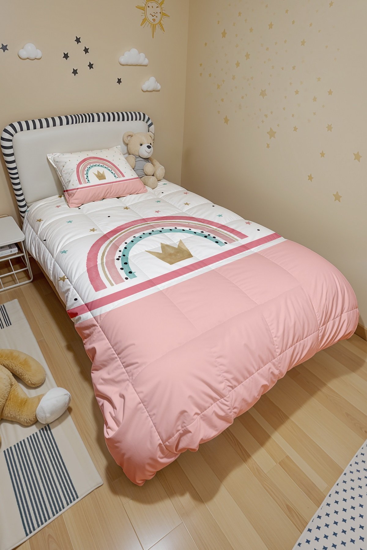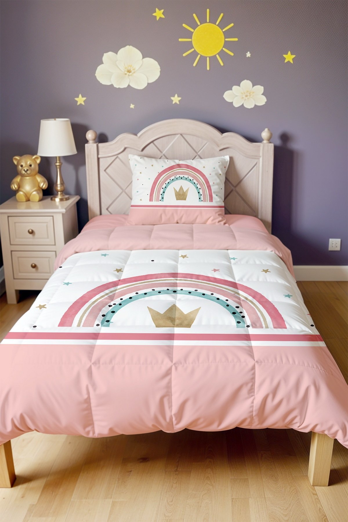 Pembe Şeritli Yıldızlı Kral Taçı Desenli Tek Kişilik Yorgan ve Yastık Kılıfı